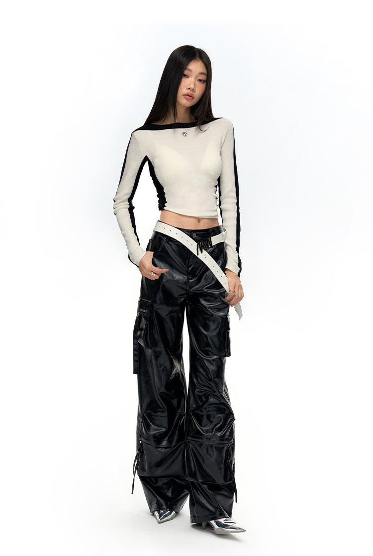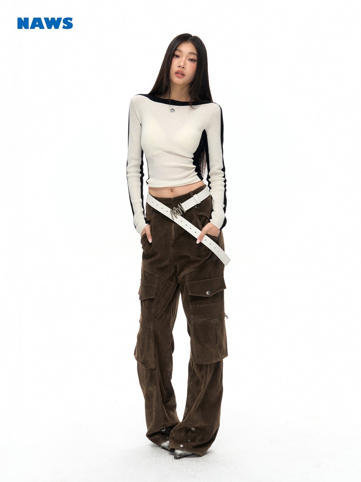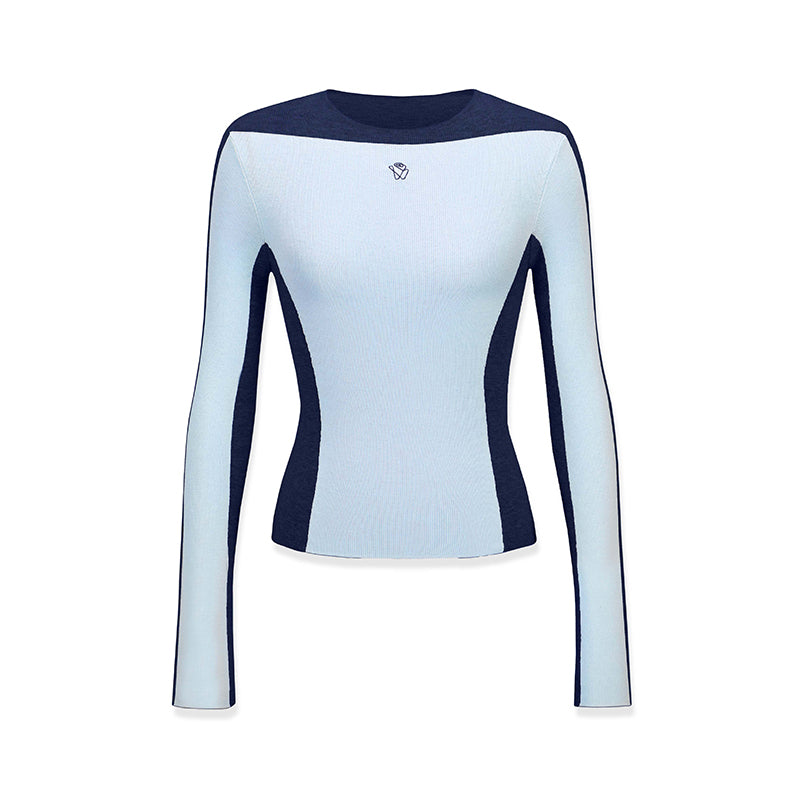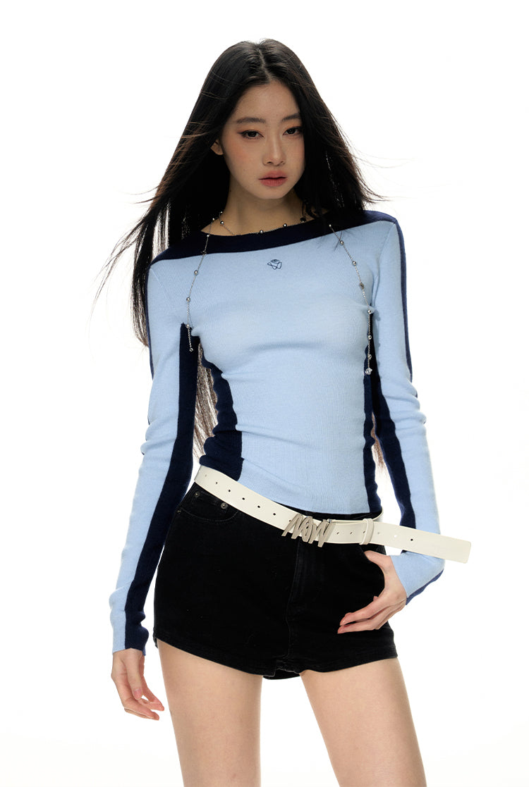 Quiet luxury style round neck slim fit contrast color sweater. The round slightly exposed collarbone outlines a slender and slender neck, and the contrasting color dividing line covers the flesh and makes the body look slimmer. The elastic wrap has zero feeling and no pressure, and the whole body fits the curves of the human body to reveal a graceful figure.