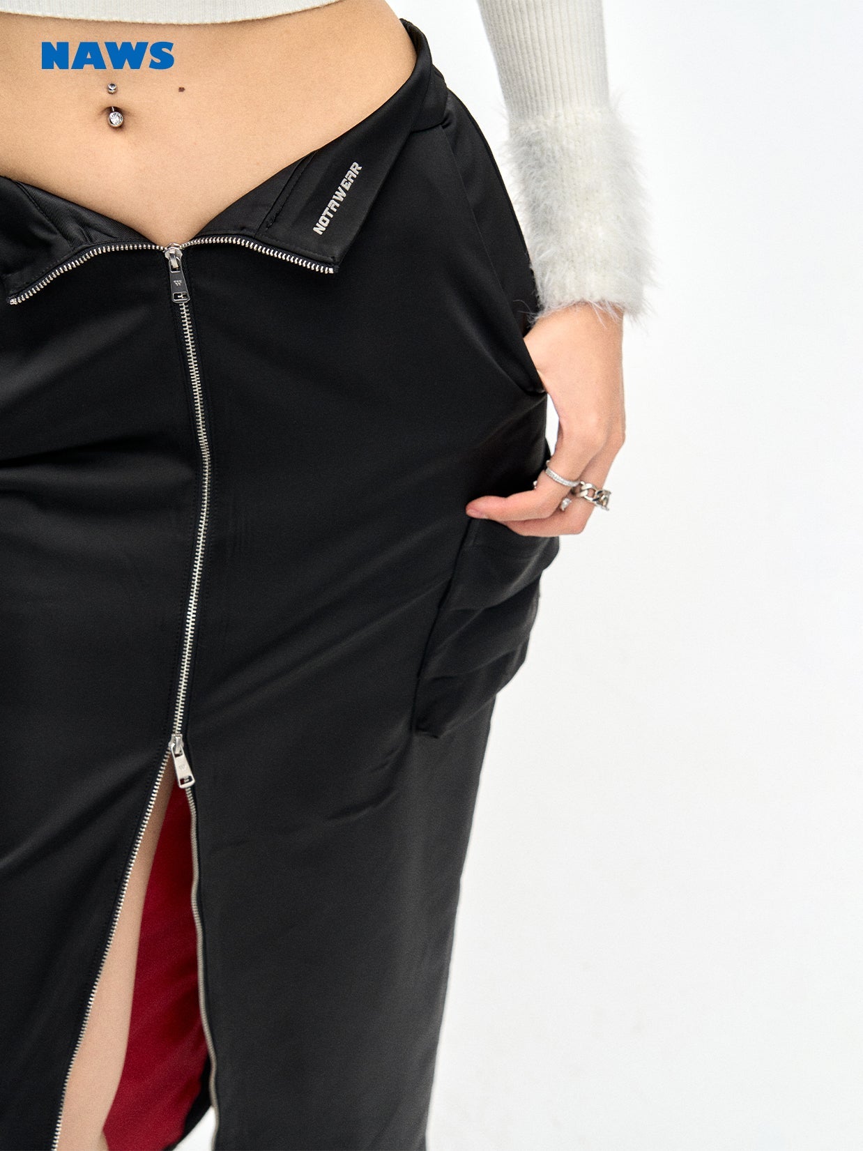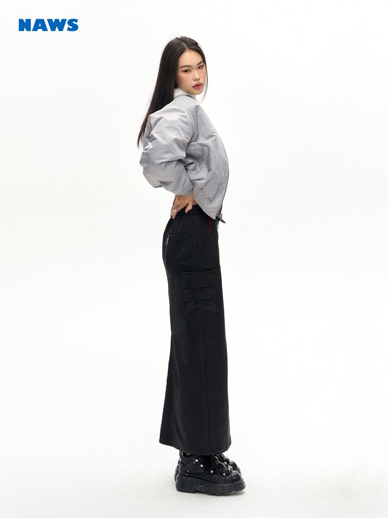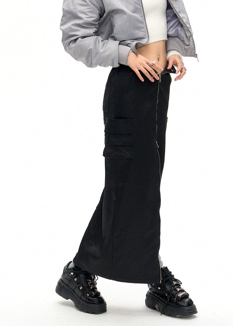 VERSION DESCRIPTION Practical and cool straight work zipper long skirt The cool metallic luster echoes the workwear style, getting rid of the monotony. The neat tailoring modifies the hip and hip curves to meet the needs of different body types.