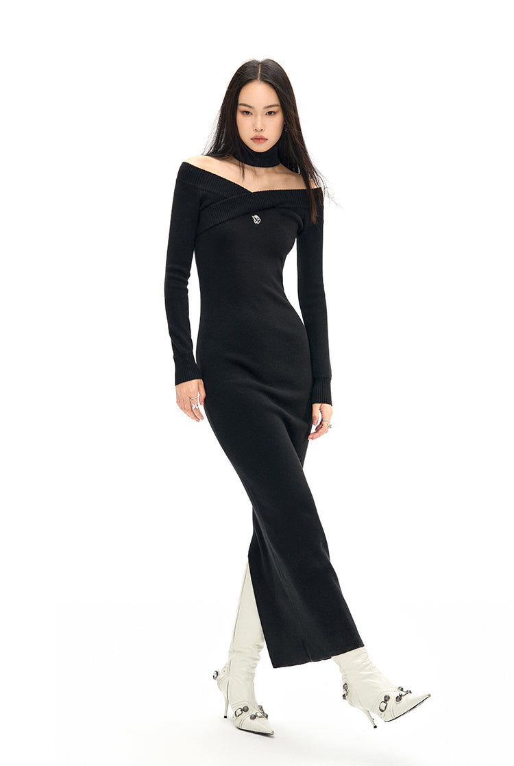 [NAWS] Elegant cross-neck wool knitted dress