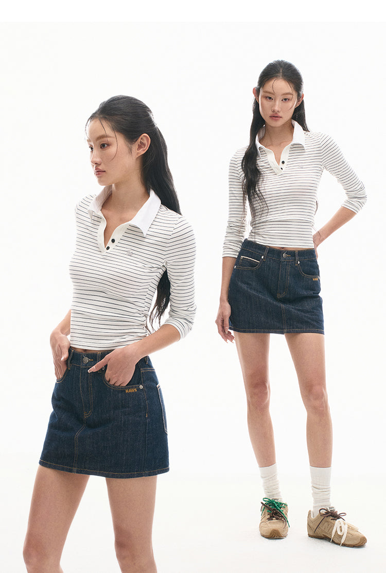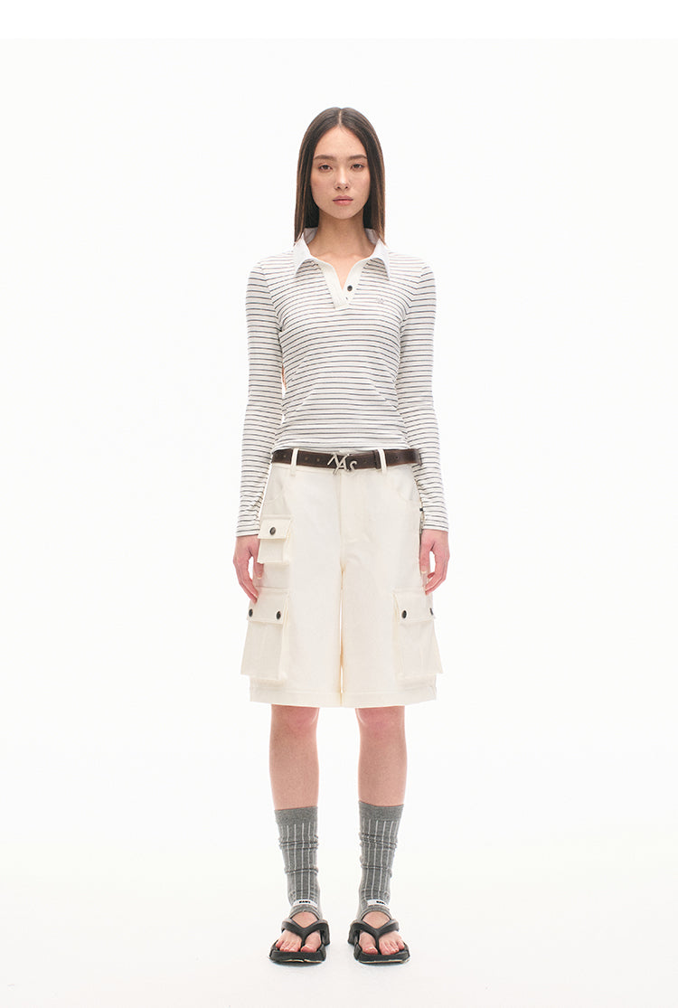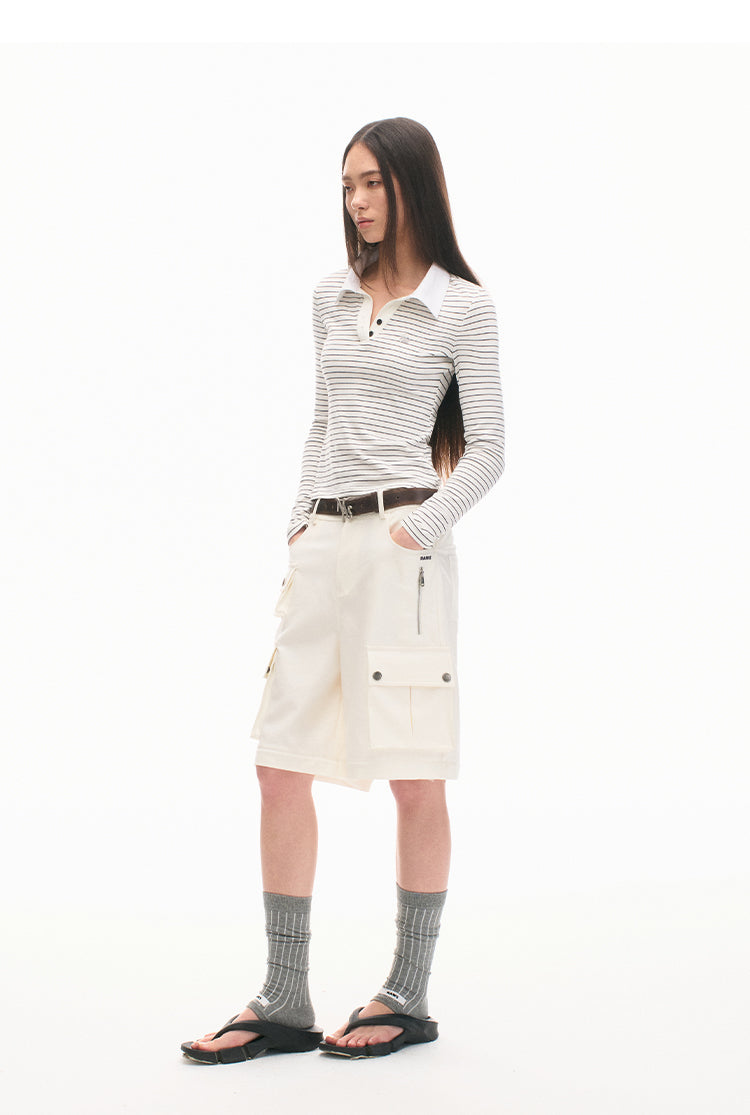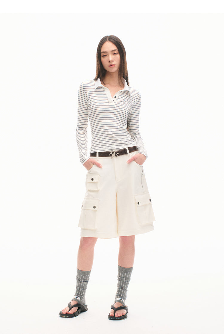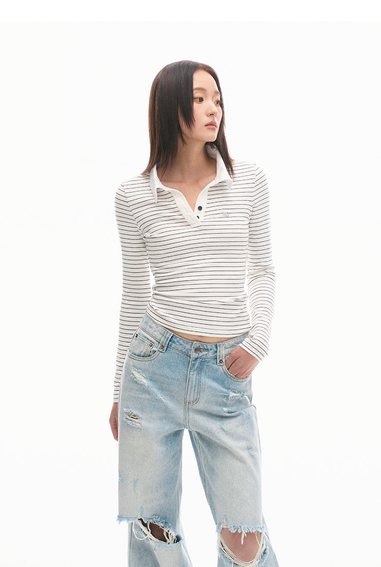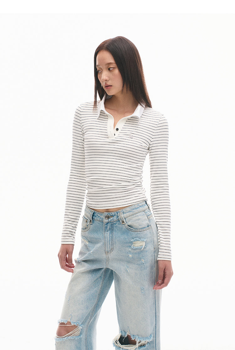[NAWS] Long Sleeve Polo Striped Retro T-Shirt
