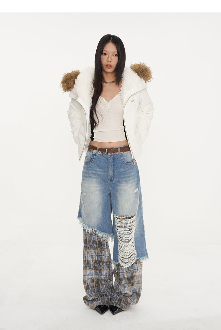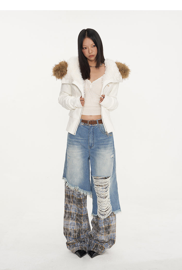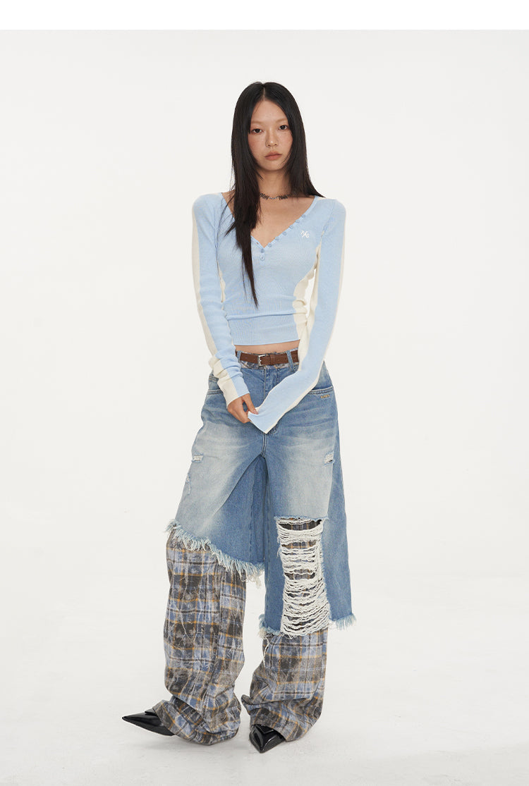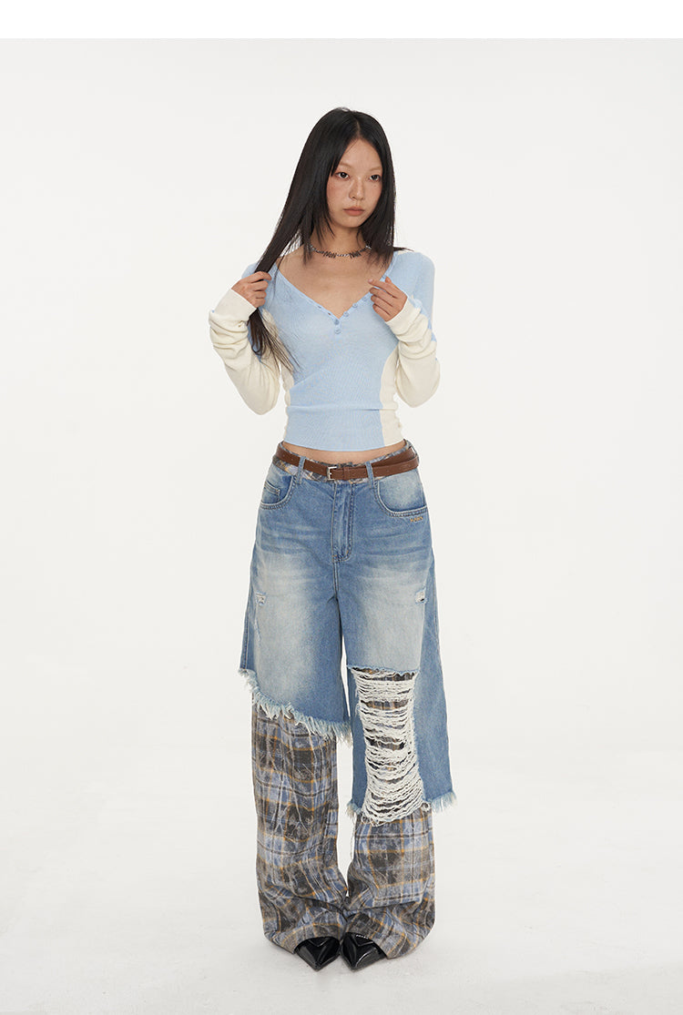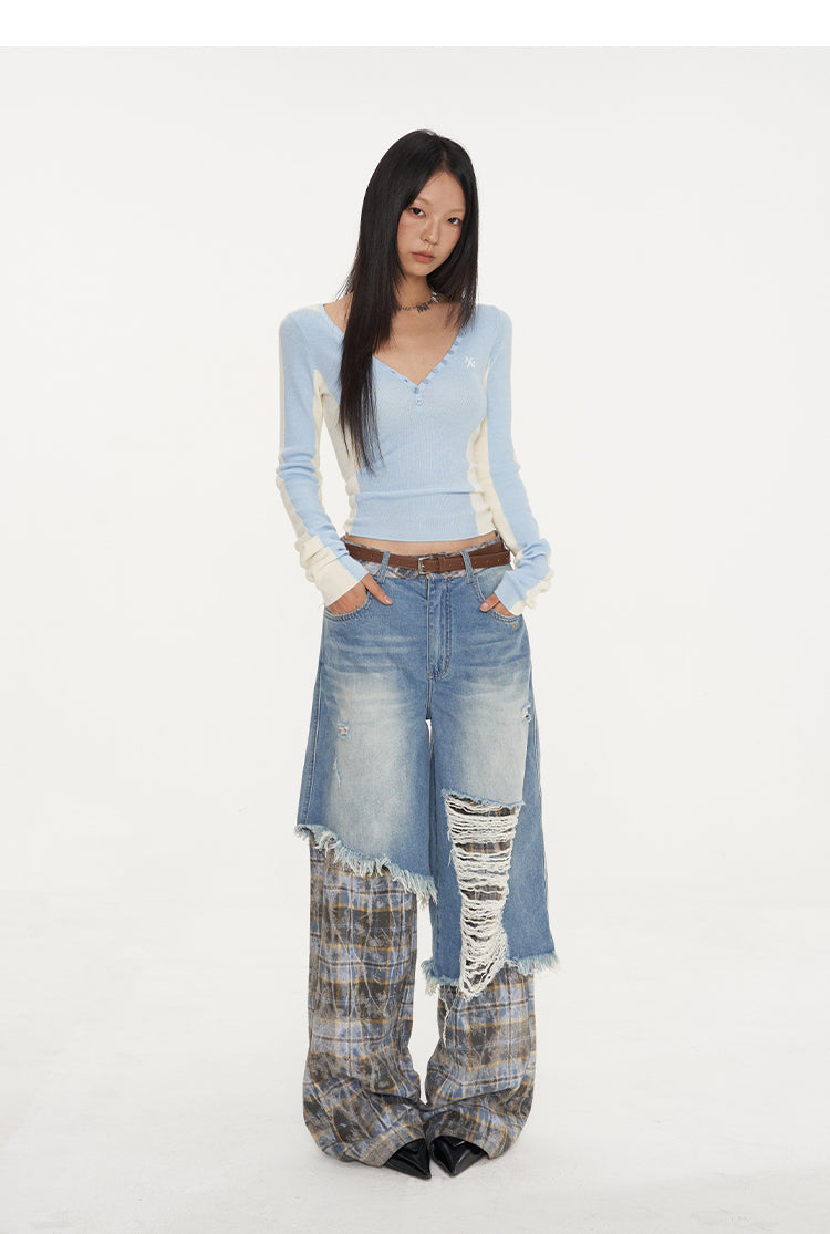 [NAWS] Plaid Stitching Wide Leg Jeans