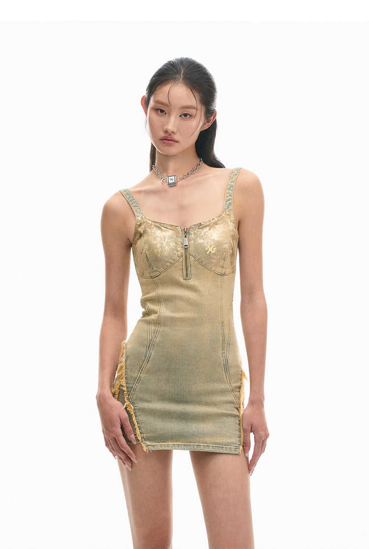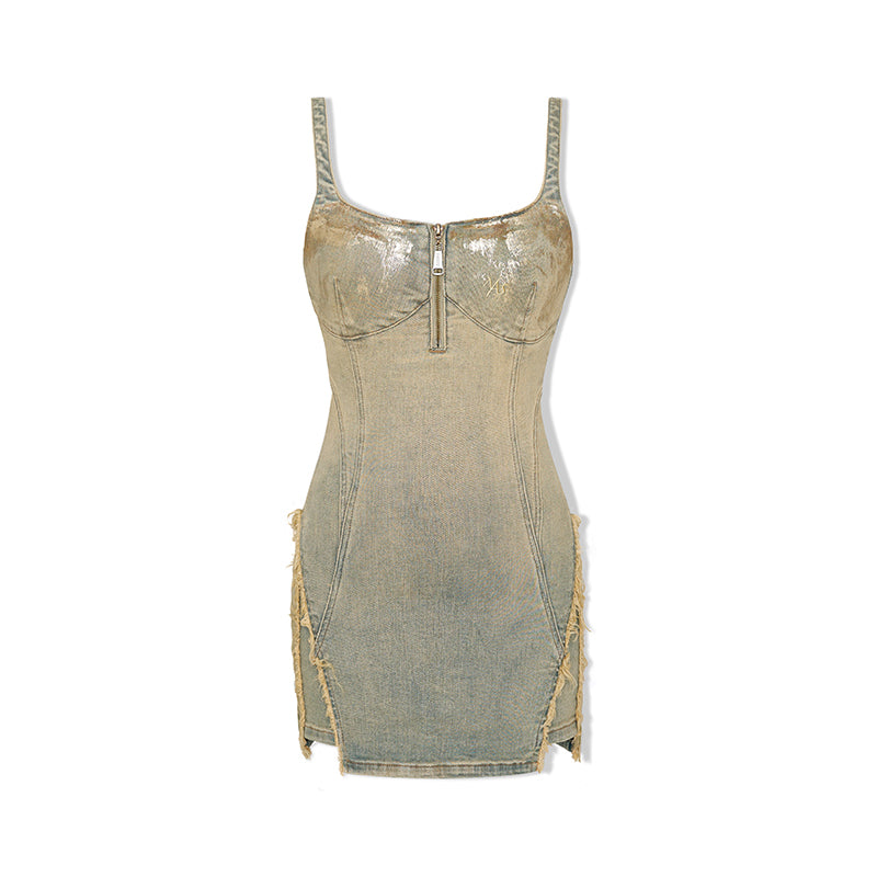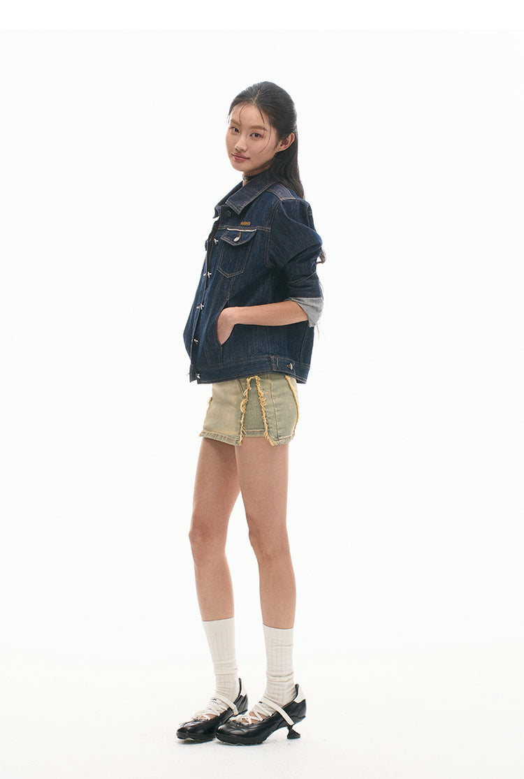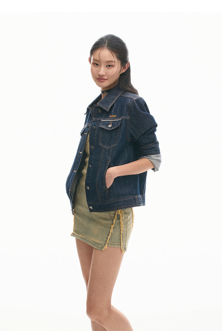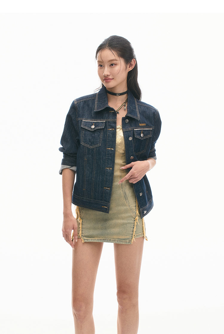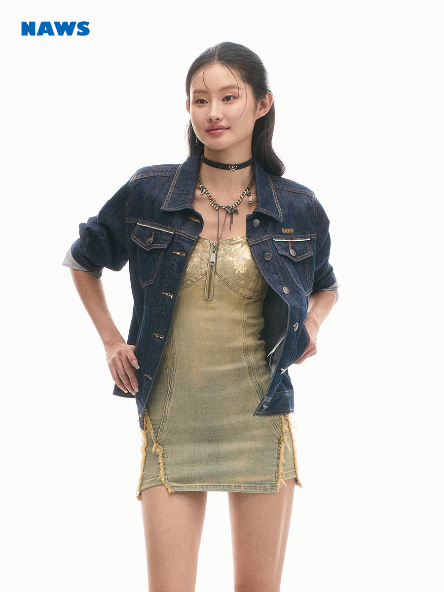 Heavily treated denim with dual dye processes and various textures, ensuring durability and style.