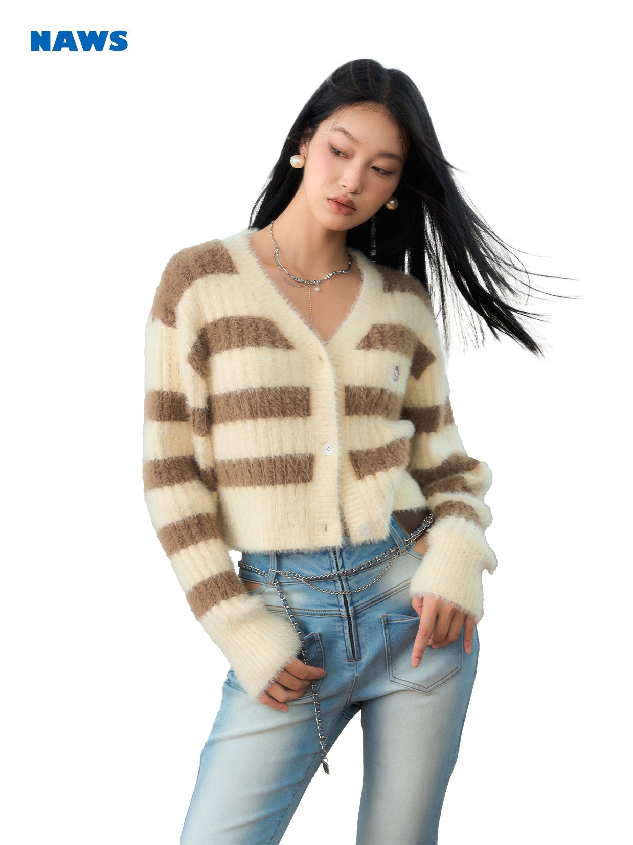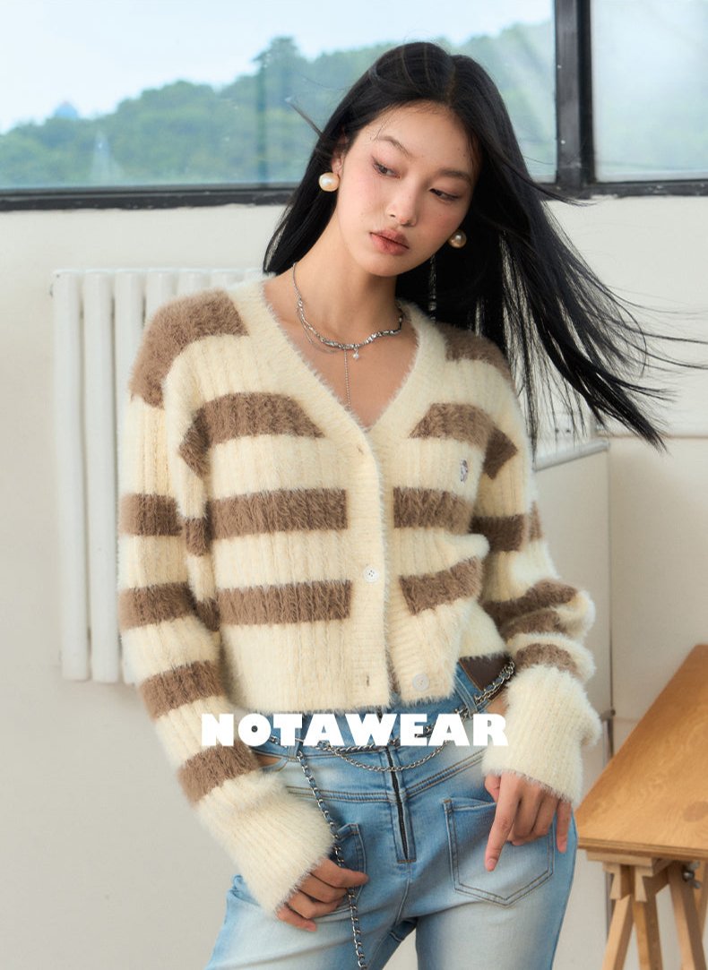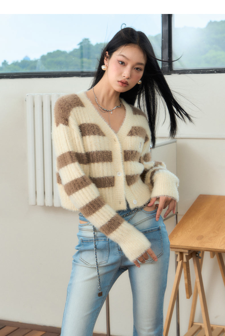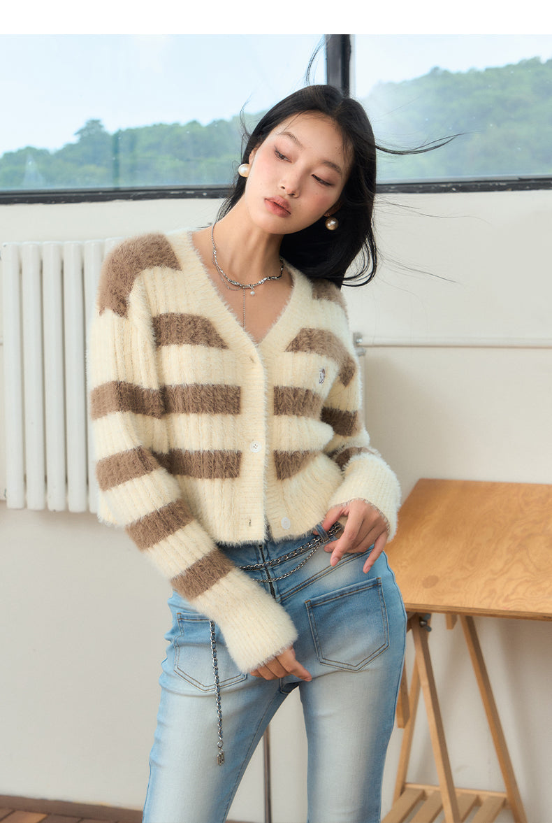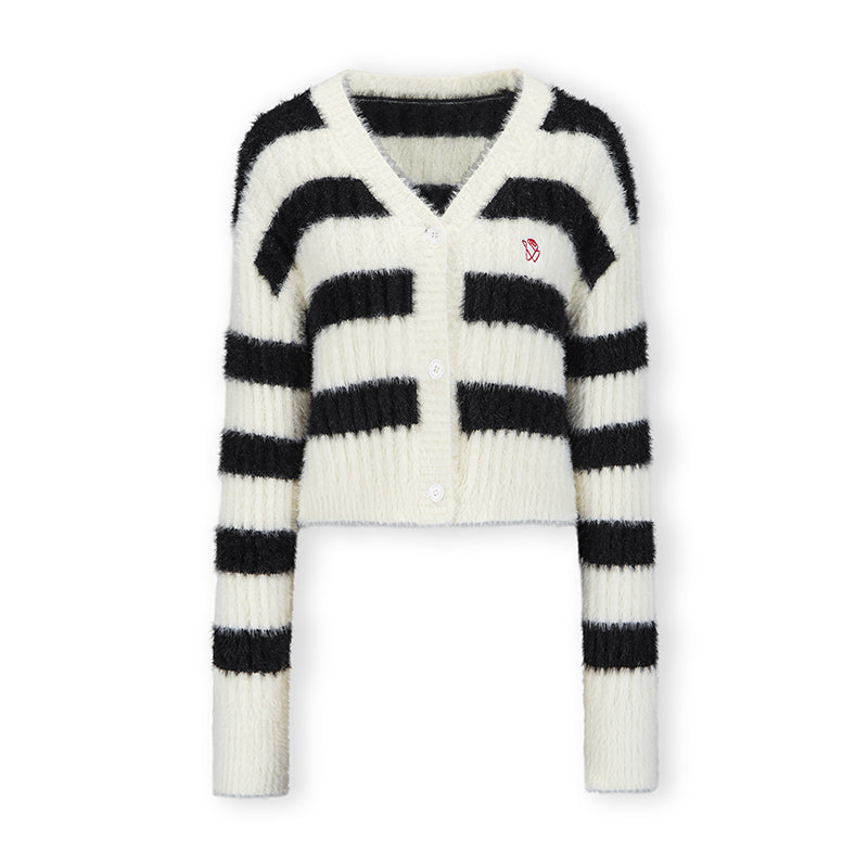 The V-neck design subtly emphasizes the neck and shoulder lines, creating a visually light and elegant look. The combination of knitting techniques and materials adds a sense of layering and texture.