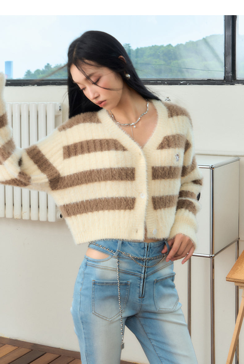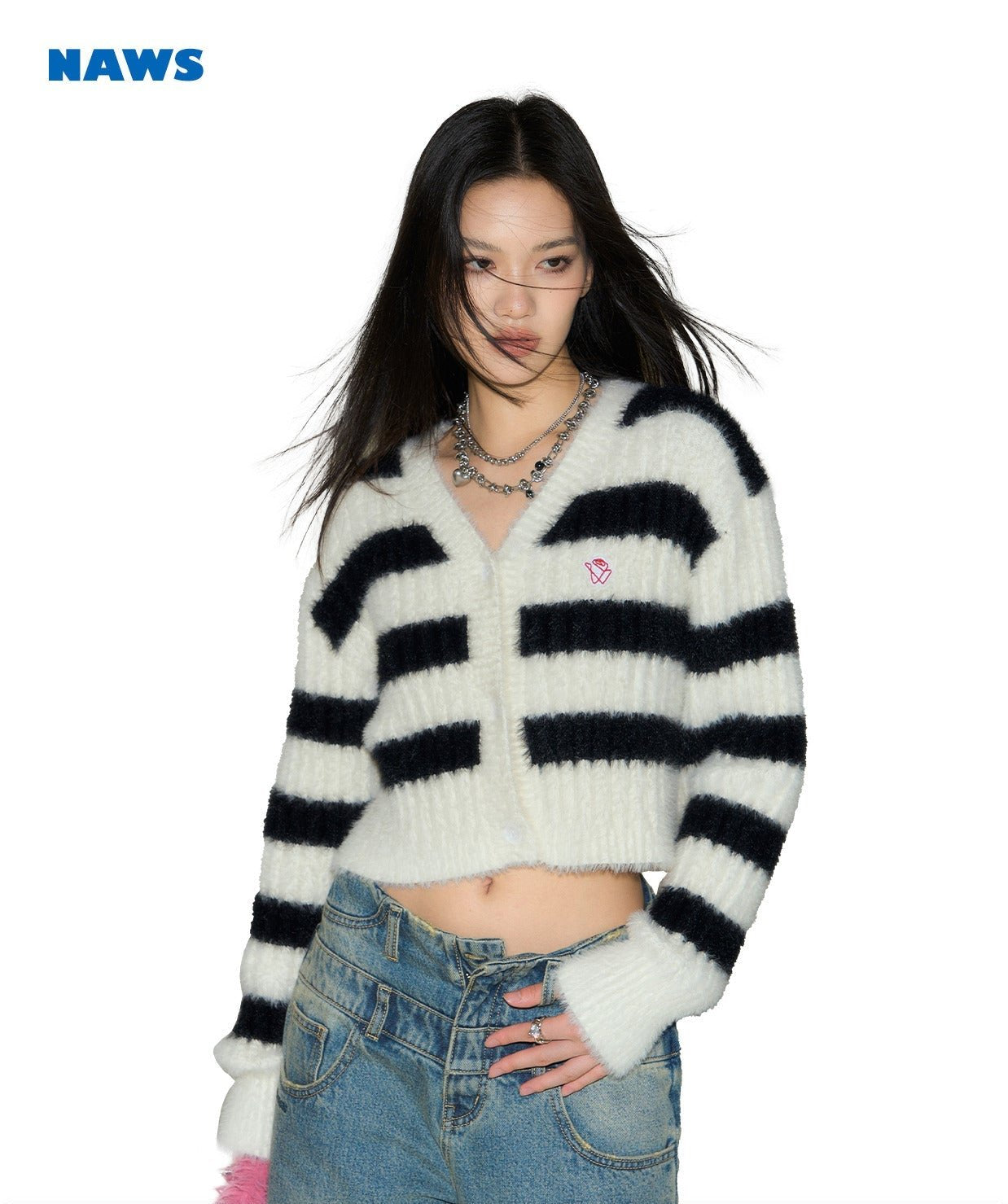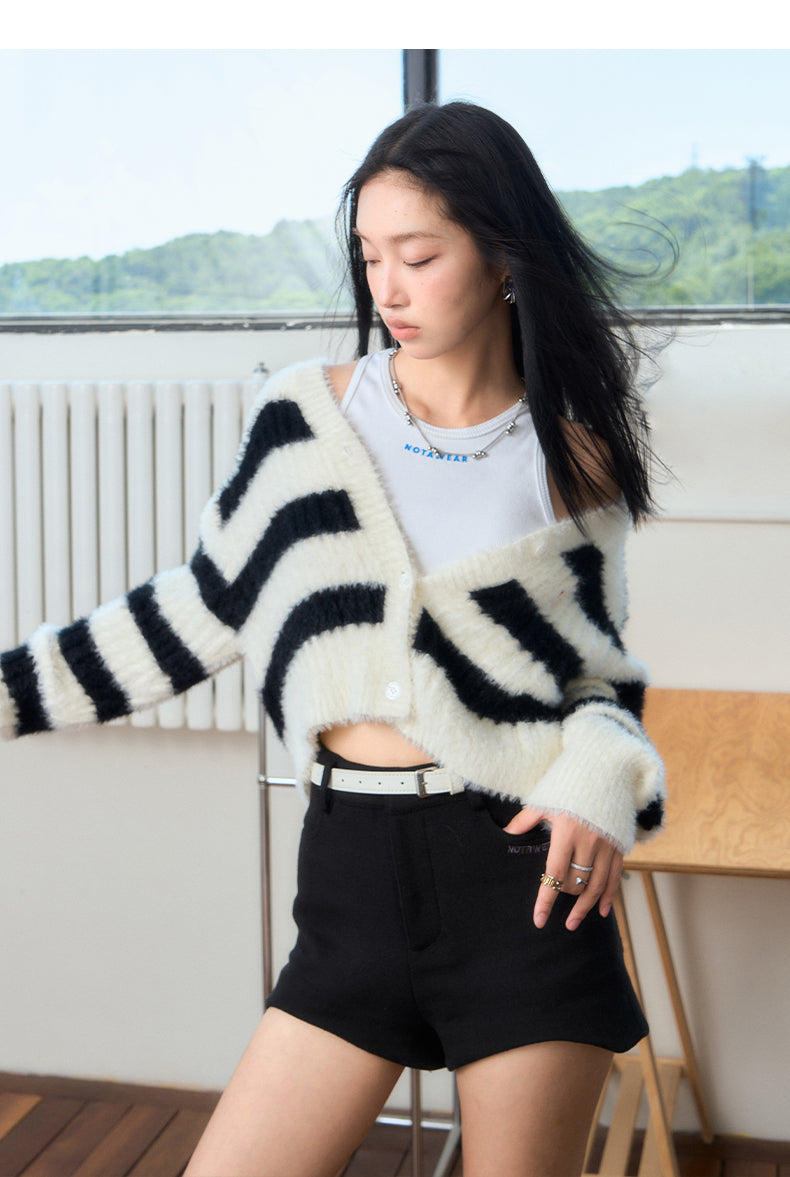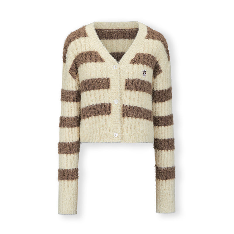 The V-neck design subtly emphasizes the neck and shoulder lines, creating a visually light and elegant look. The combination of knitting techniques and materials adds a sense of layering and texture.