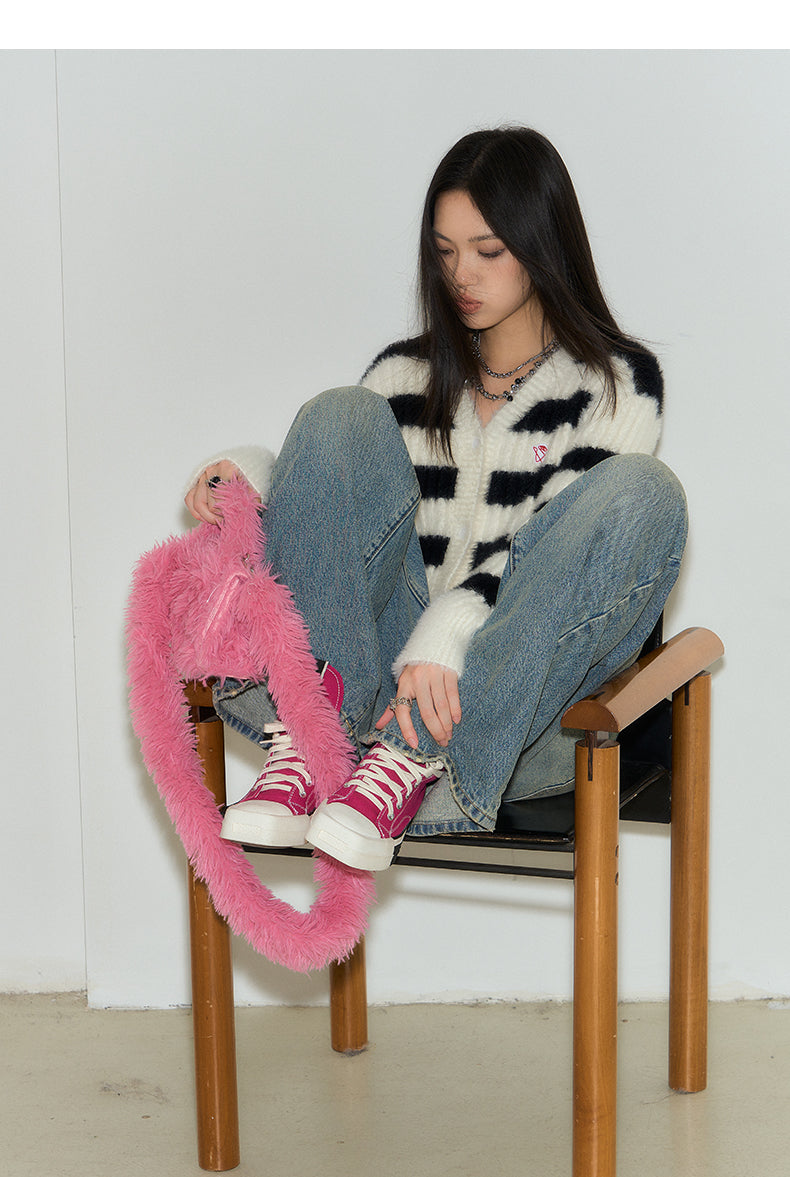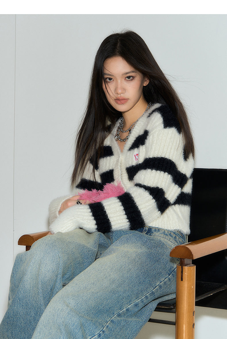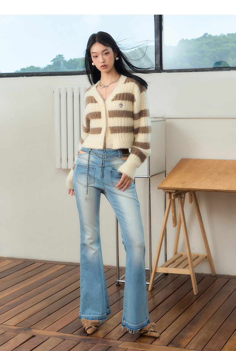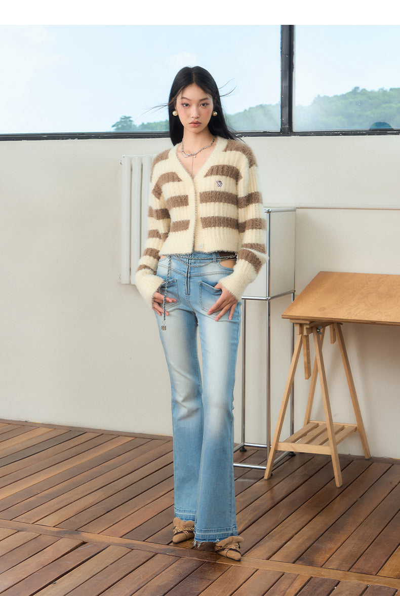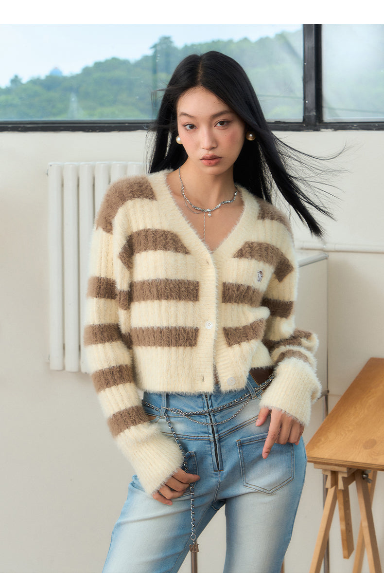 The V-neck design subtly emphasizes the neck and shoulder lines, creating a visually light and elegant look. The combination of knitting techniques and materials adds a sense of layering and texture.