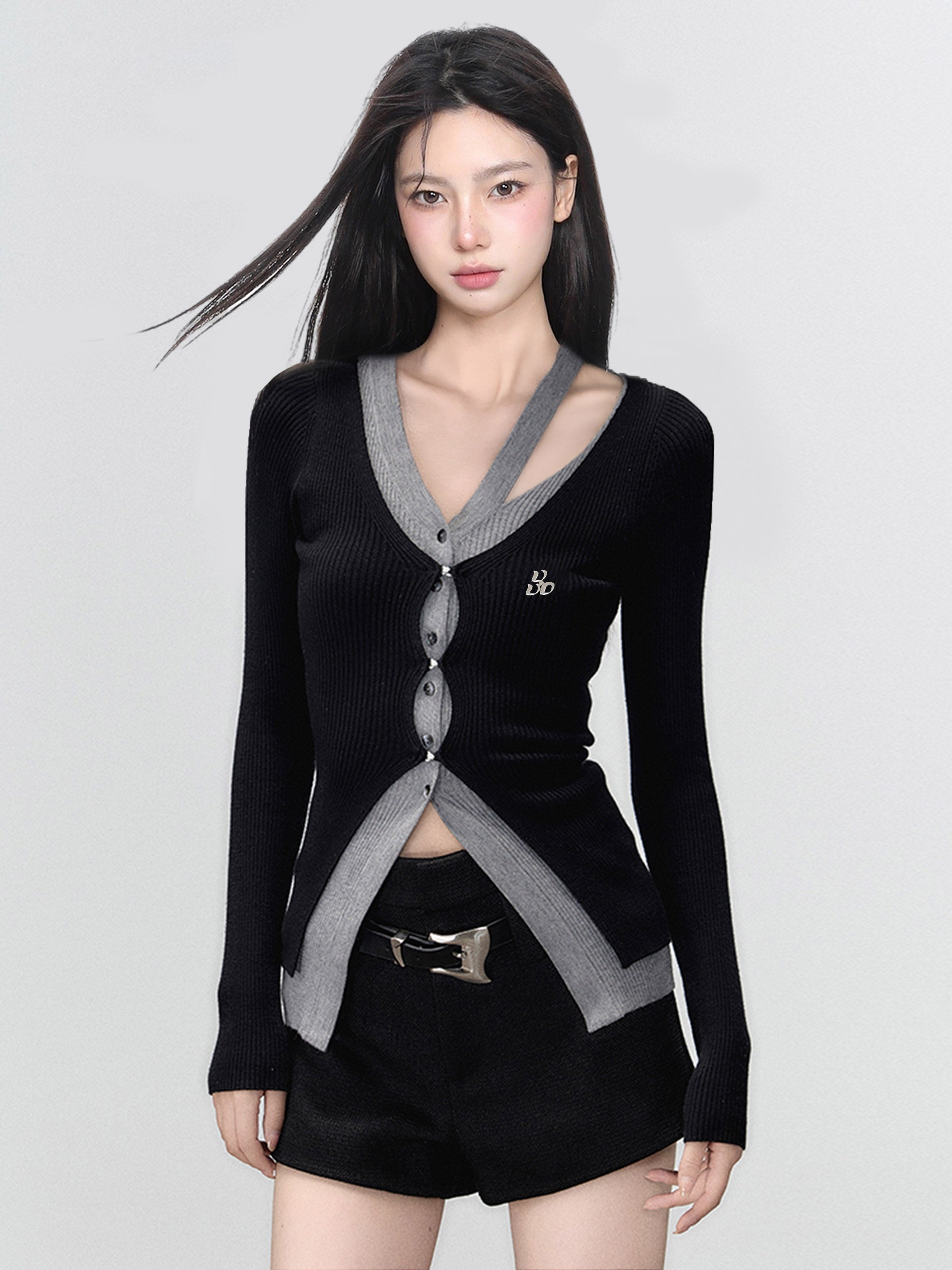 Fake two-piece short long-sleeved knitted cardigan