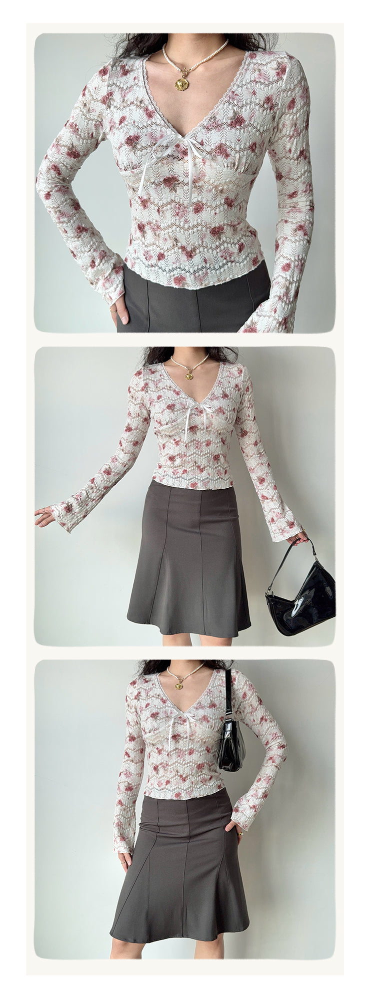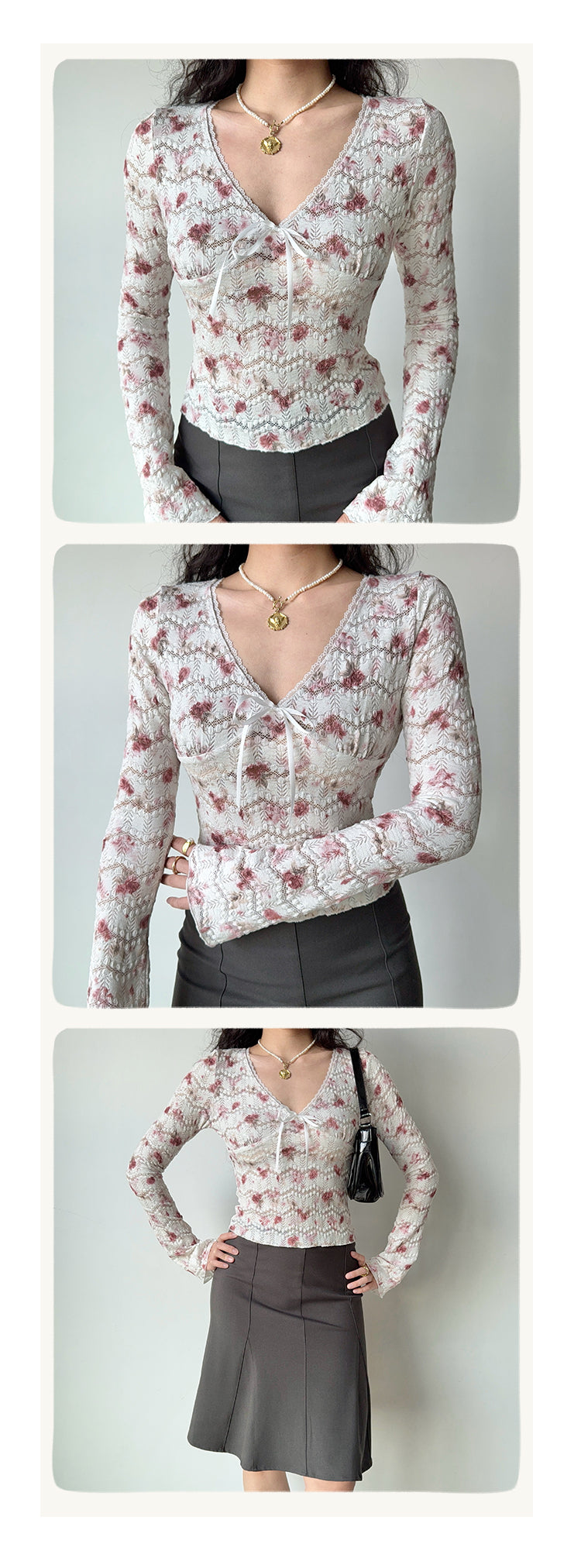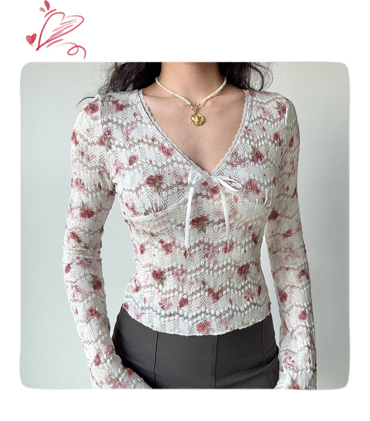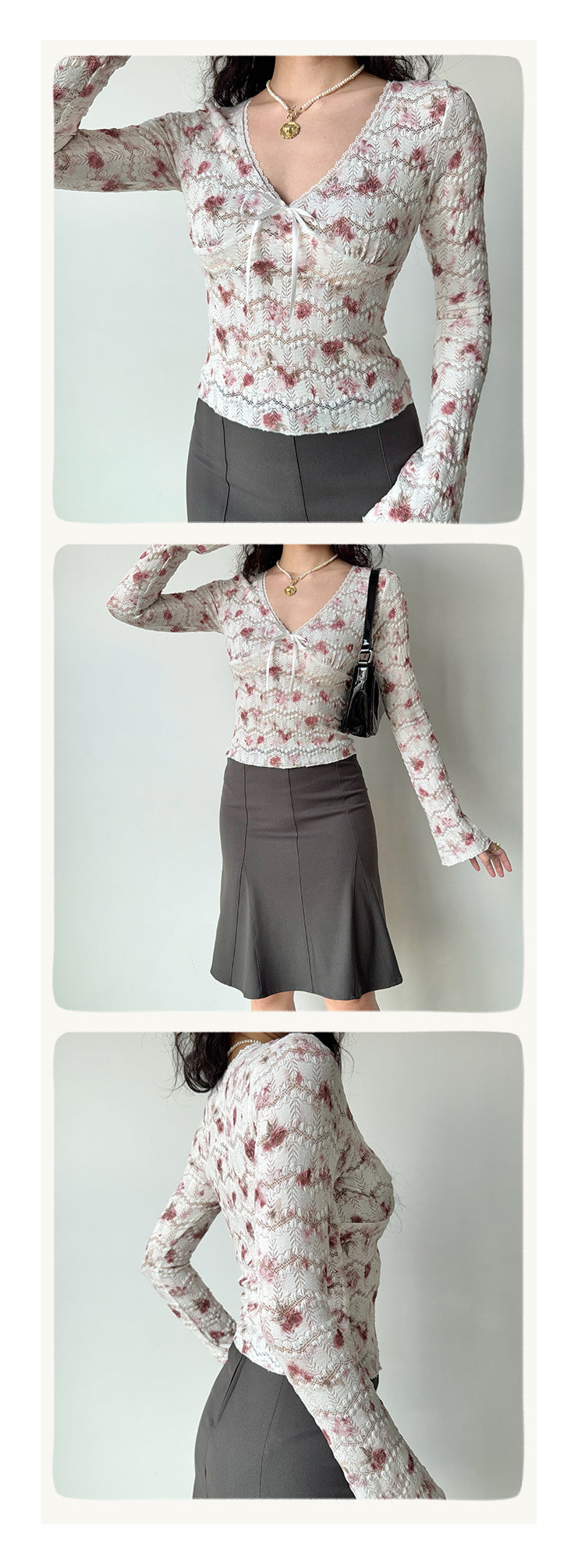 V-neck design with bow embellishment. Long neck line exposes collarbone. Ink rendering print. Hollow fabric is very suitable for early spring outfits. Long sleeve length, slightly flared cuffs are not fashionable. Matched with skirts. 95% polyester 5% spandex.