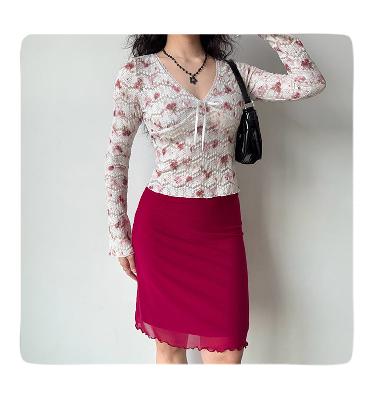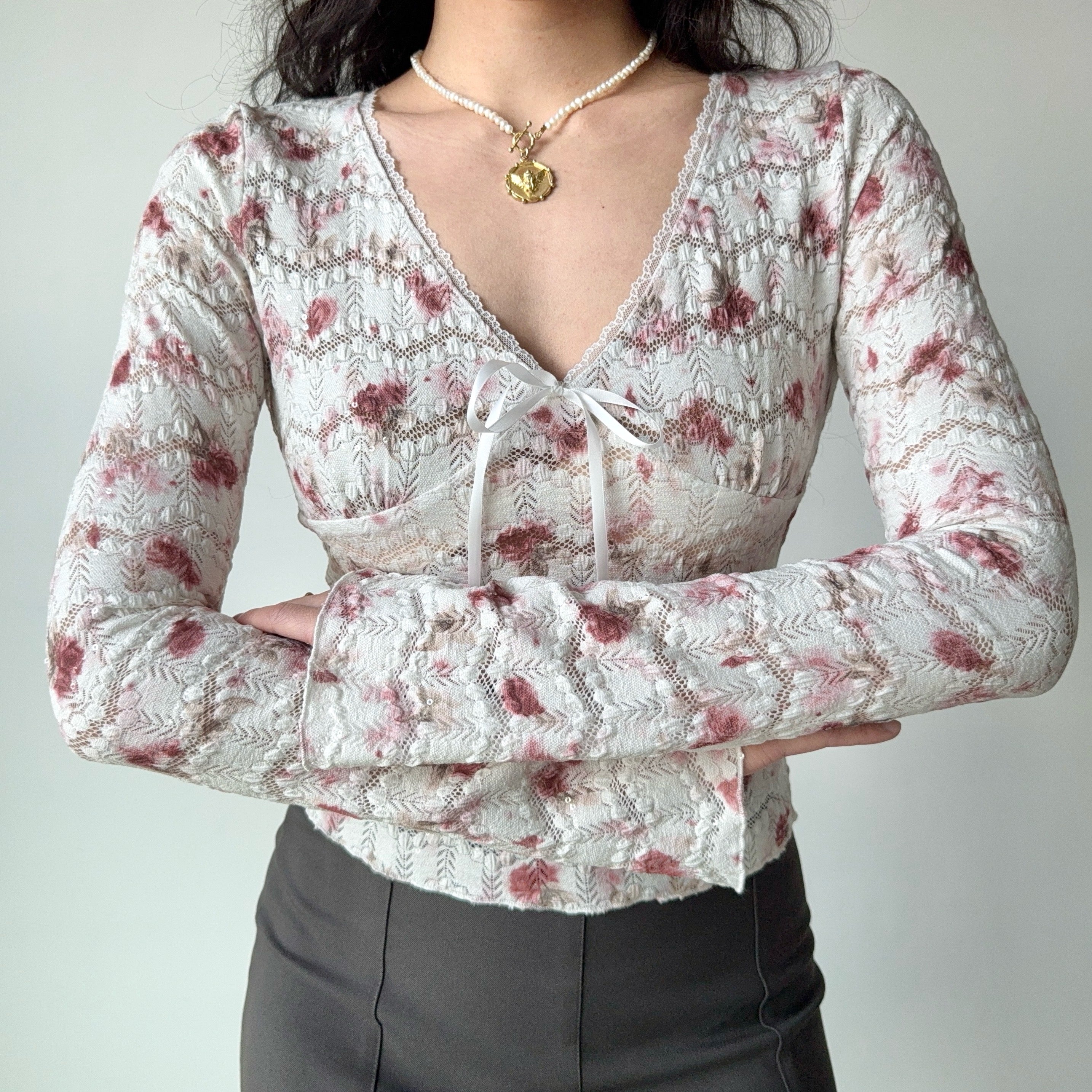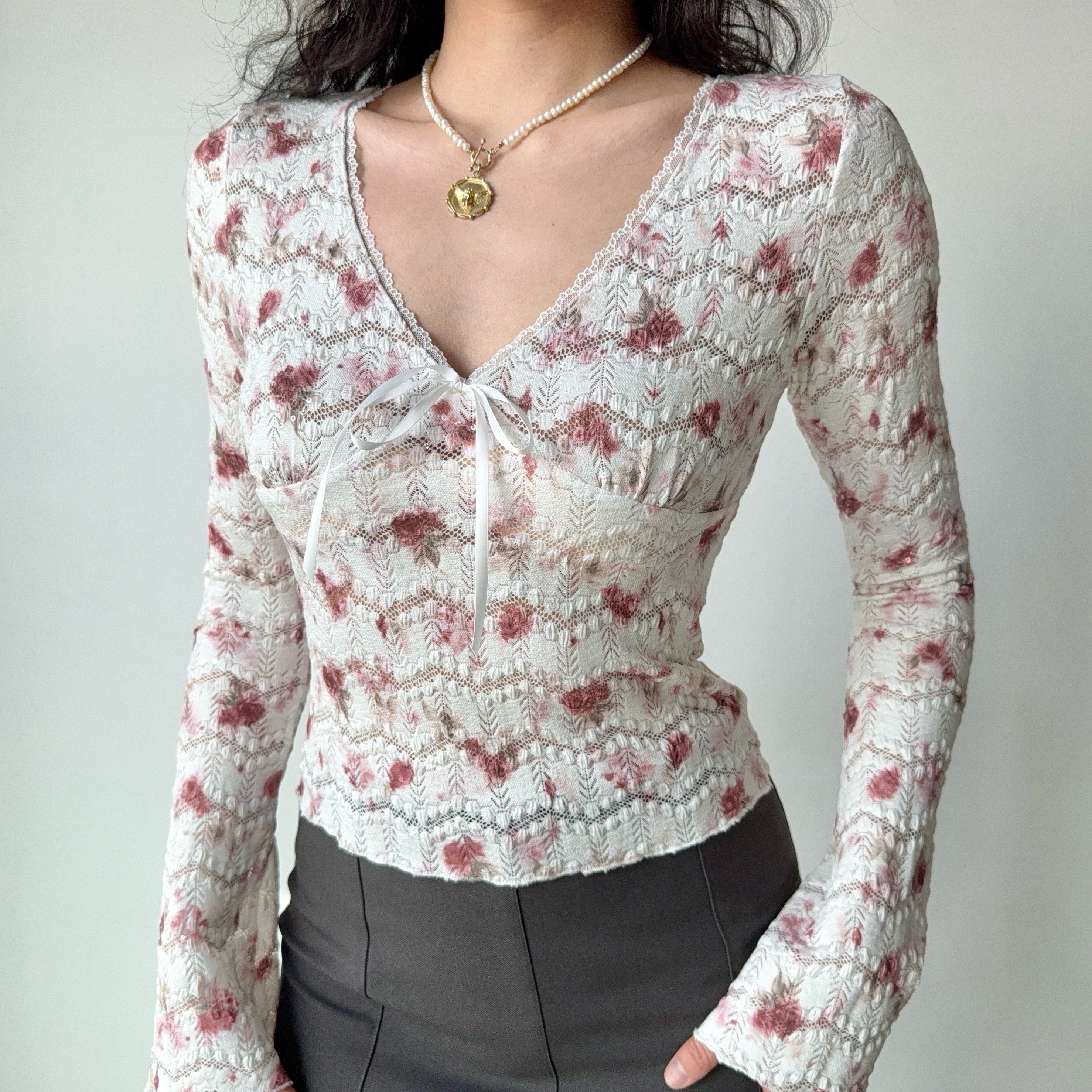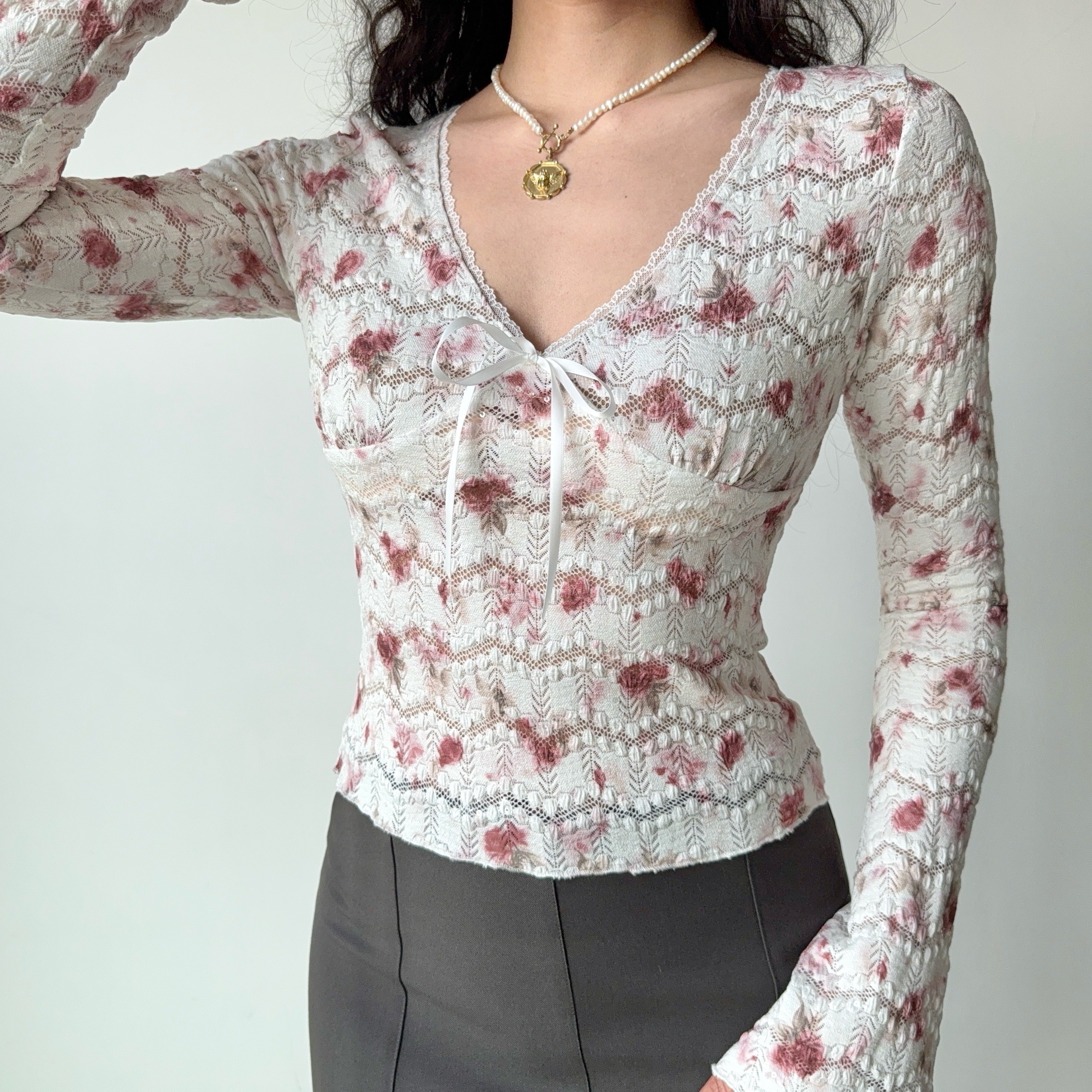V-neck design with bow embellishment. Long neck line exposes collarbone. Ink rendering print. Hollow fabric is very suitable for early spring outfits. Long sleeve length, slightly flared cuffs are not fashionable. Matched with skirts. 95% polyester 5% spandex.
