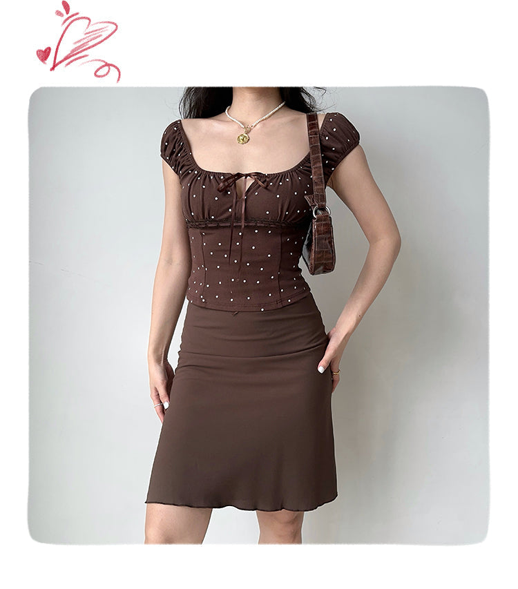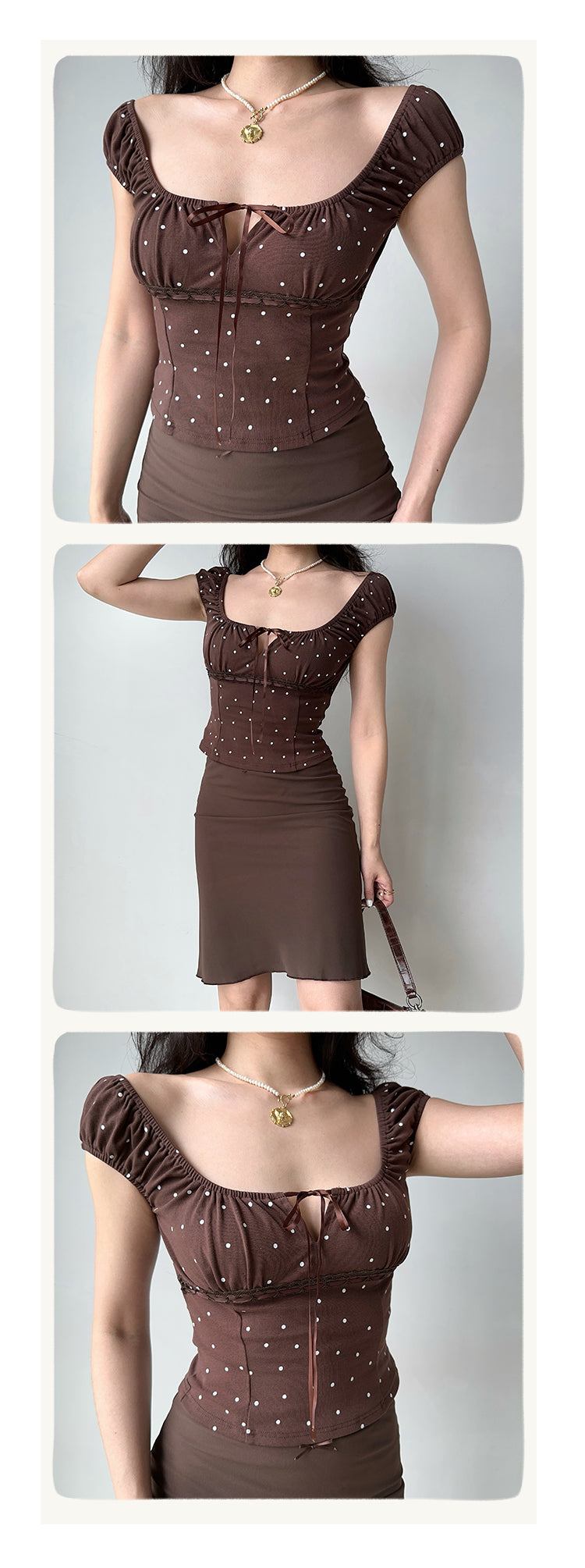 Square collar lace for easy adjustment. Puff sleeve design can be worn as one shoulder. Polka dot pattern cute and sexy. Three-dimensional tailoring hollow lace for embellishment. Fish bone waistline is more visually stylish and slim. 92% cotton 8% spandex.