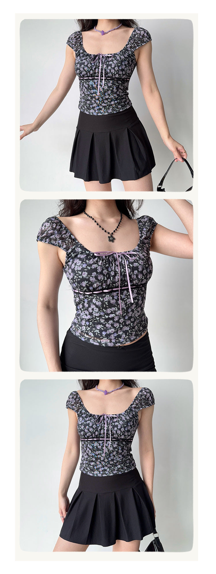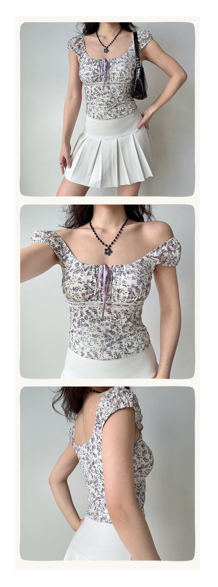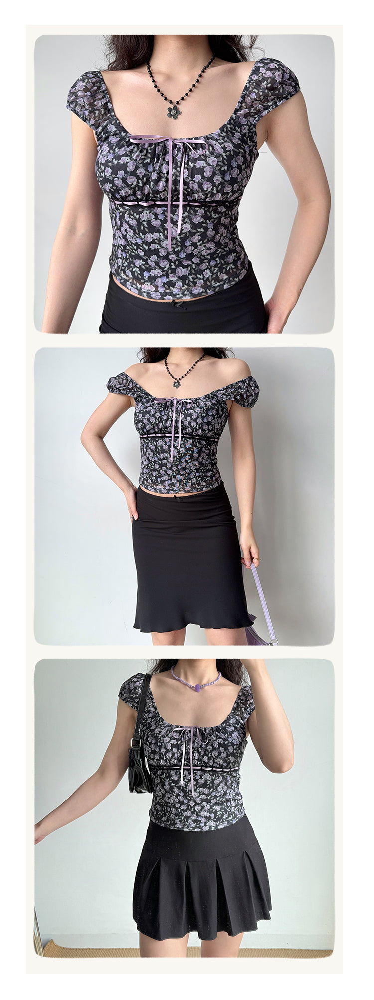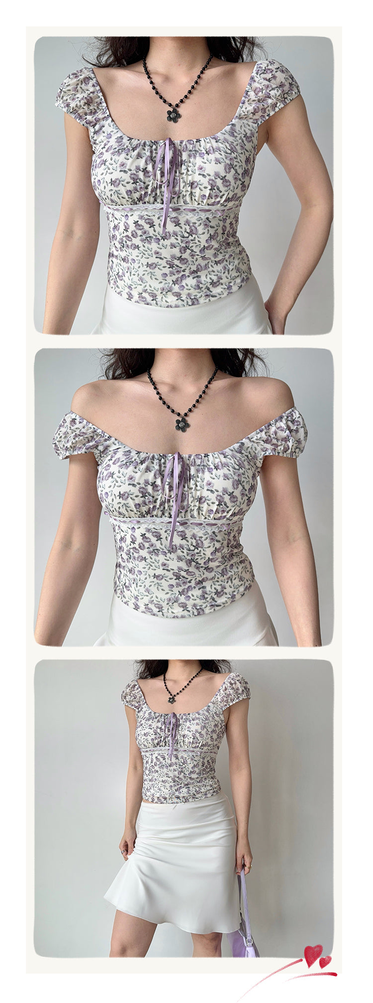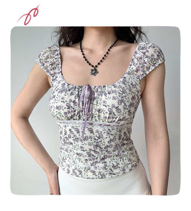 How can I not have a small floral top in summer. U-shaped neckline expose the collarbone and neckline. Split lace lace and webbing of the same color. The bow tie on the chest can be tied by yourself (the size of the neckline cannot be adjusted). Small short sleeves with shoulders can also be more sexy as a one-line collar. 95% polyester 5% spandex.