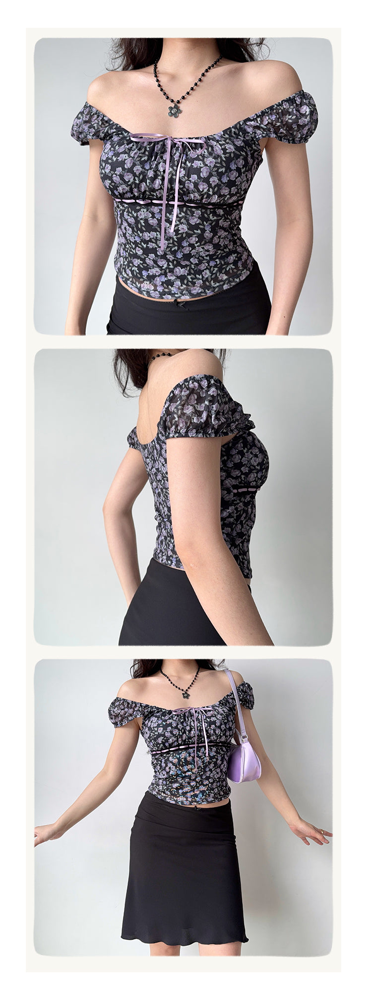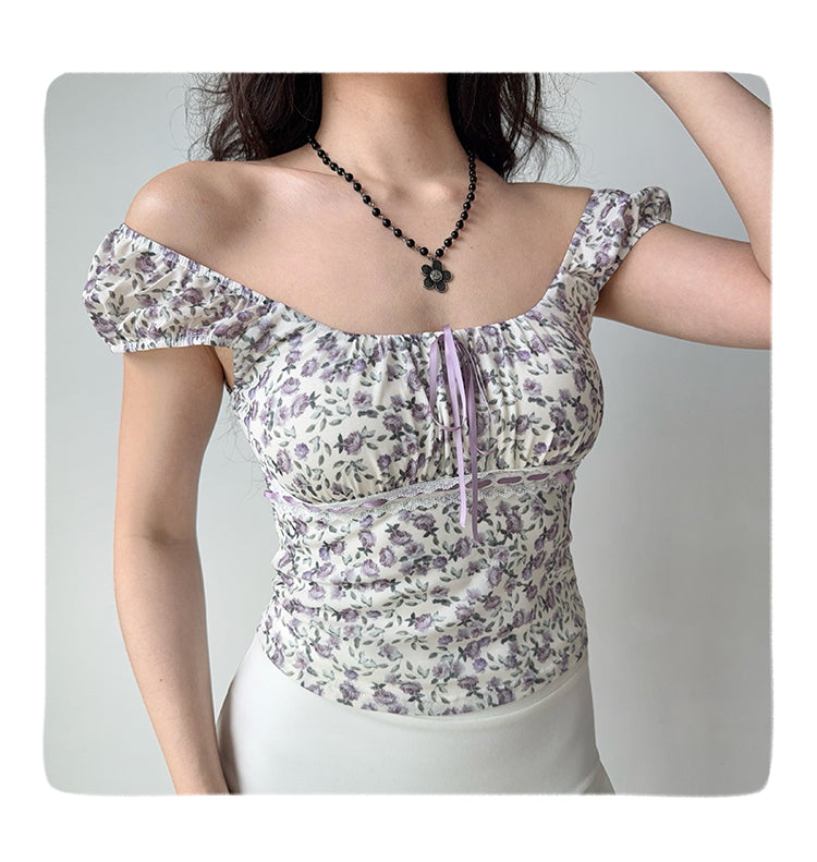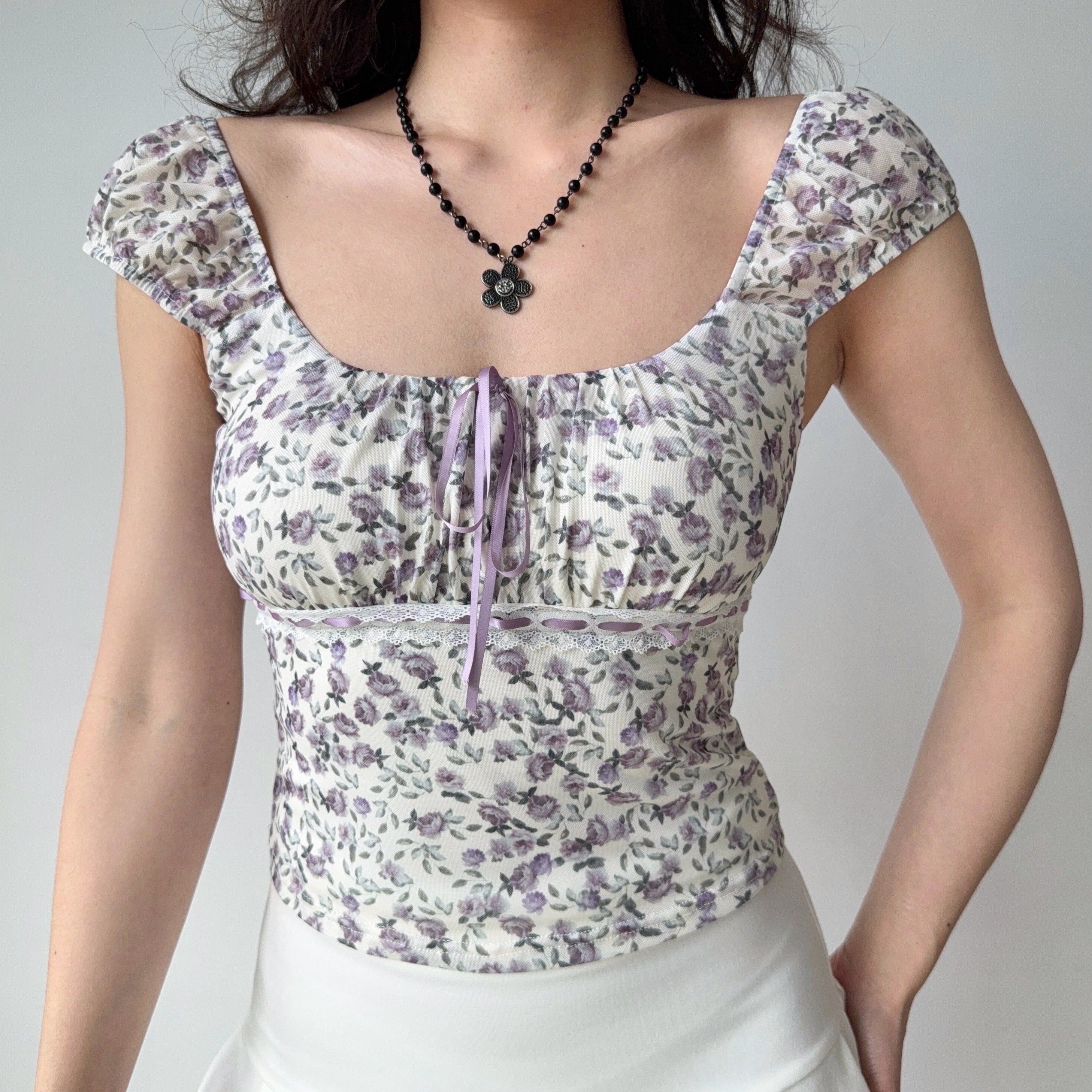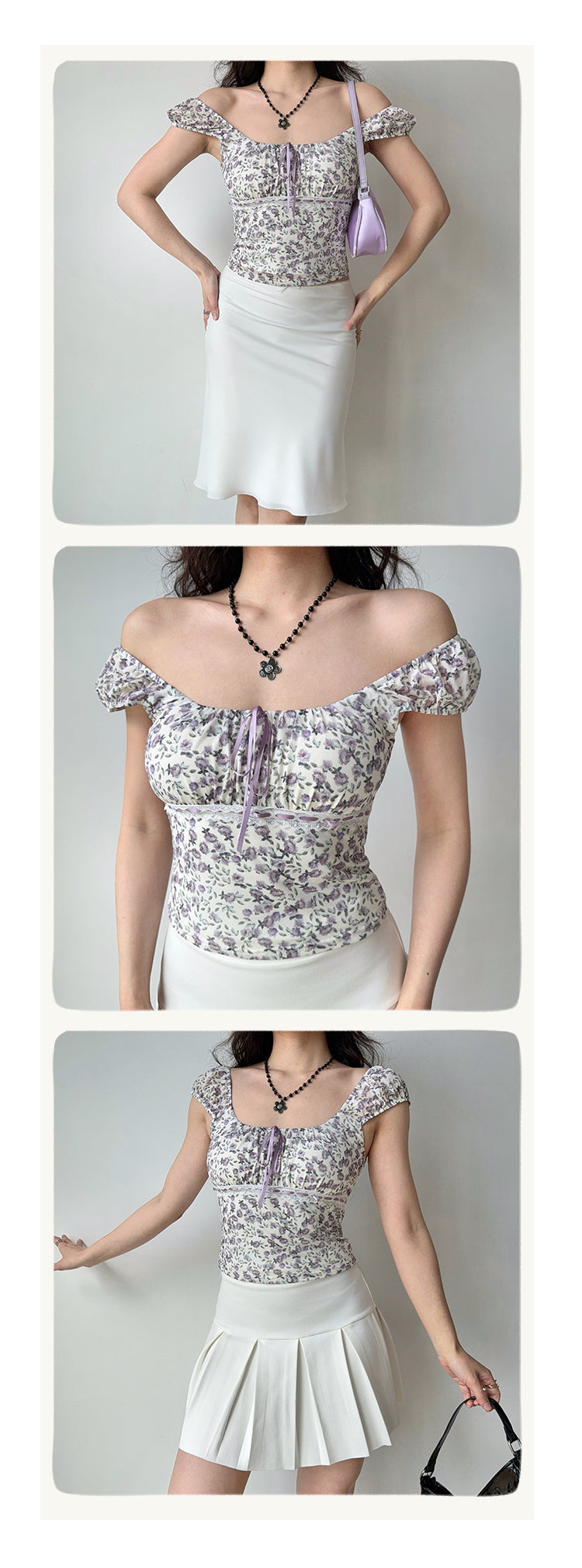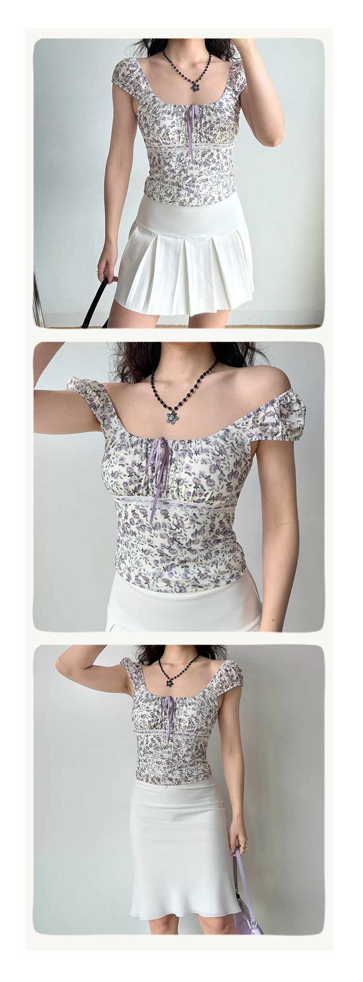 How can I not have a small floral top in summer. U-shaped neckline expose the collarbone and neckline. Split lace lace and webbing of the same color. The bow tie on the chest can be tied by yourself (the size of the neckline cannot be adjusted). Small short sleeves with shoulders can also be more sexy as a one-line collar. 95% polyester 5% spandex.