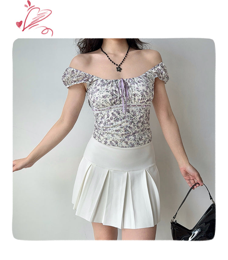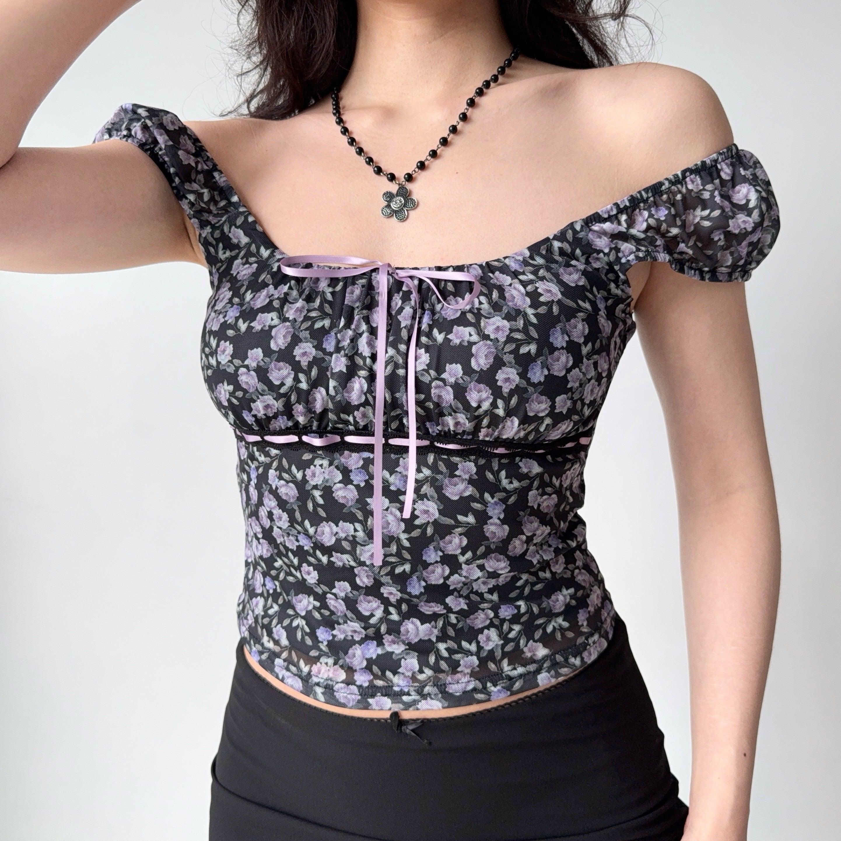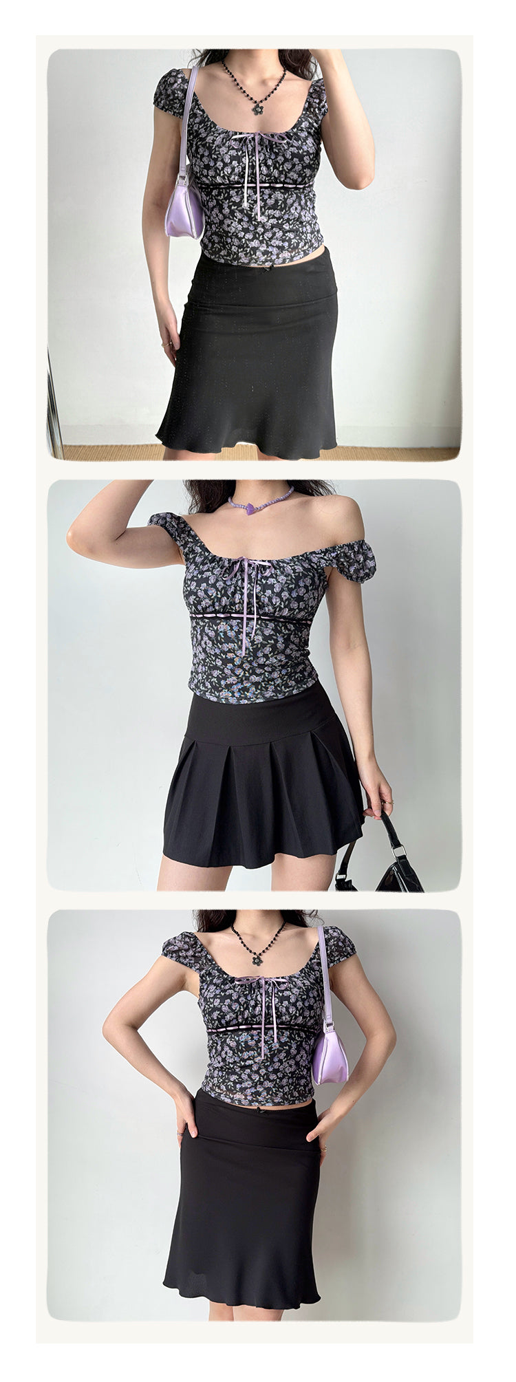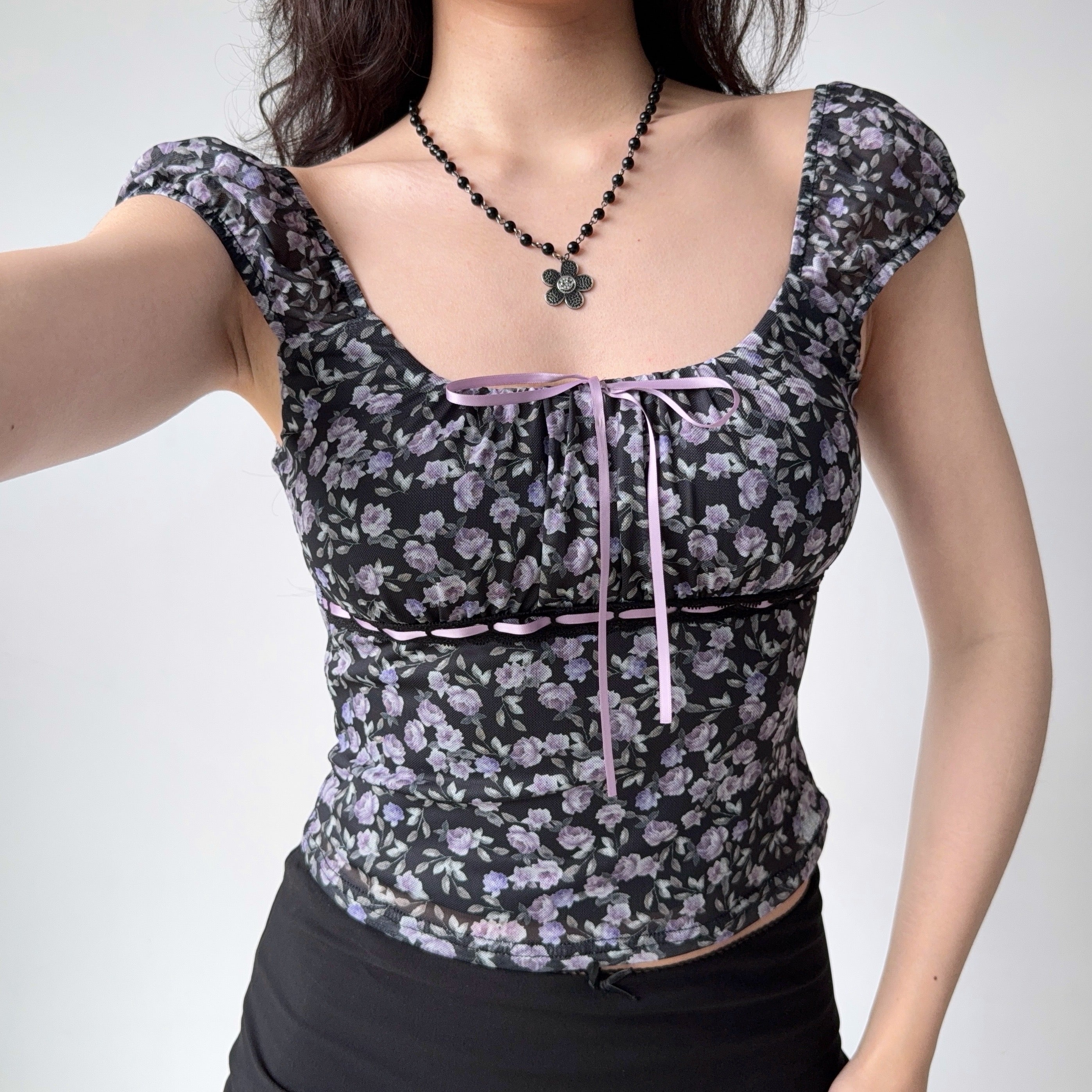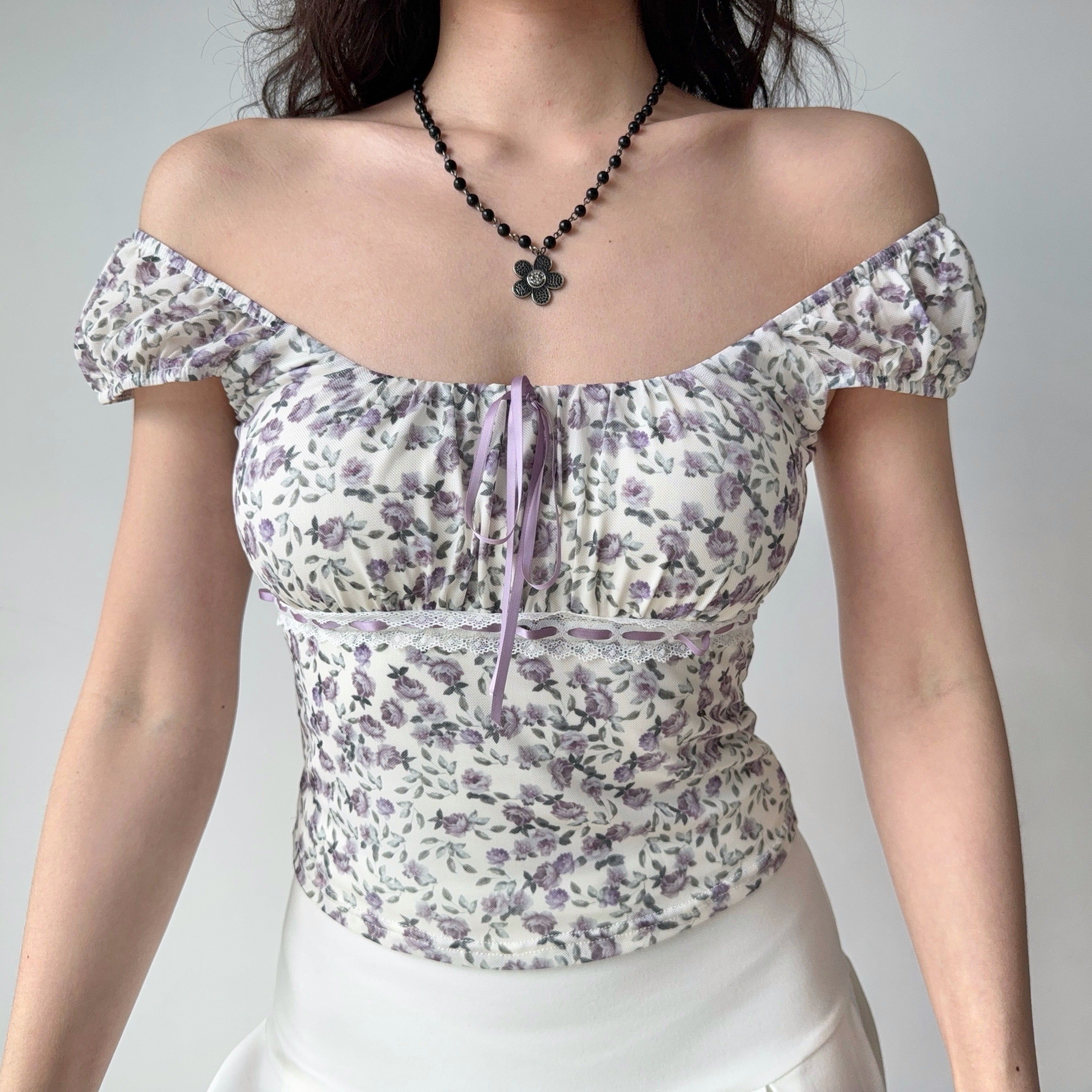 How can I not have a small floral top in summer. U-shaped neckline expose the collarbone and neckline. Split lace lace and webbing of the same color. The bow tie on the chest can be tied by yourself (the size of the neckline cannot be adjusted). Small short sleeves with shoulders can also be more sexy as a one-line collar. 95% polyester 5% spandex.