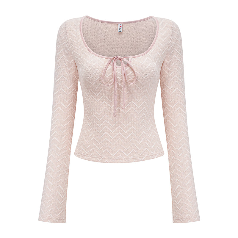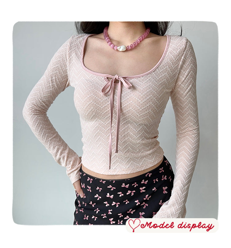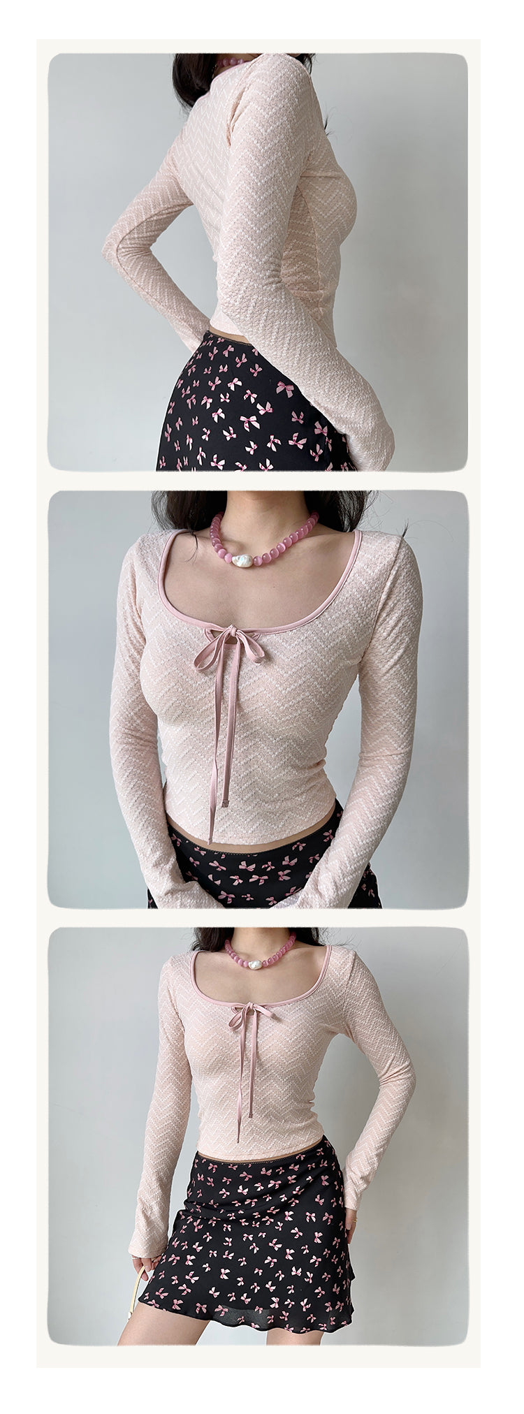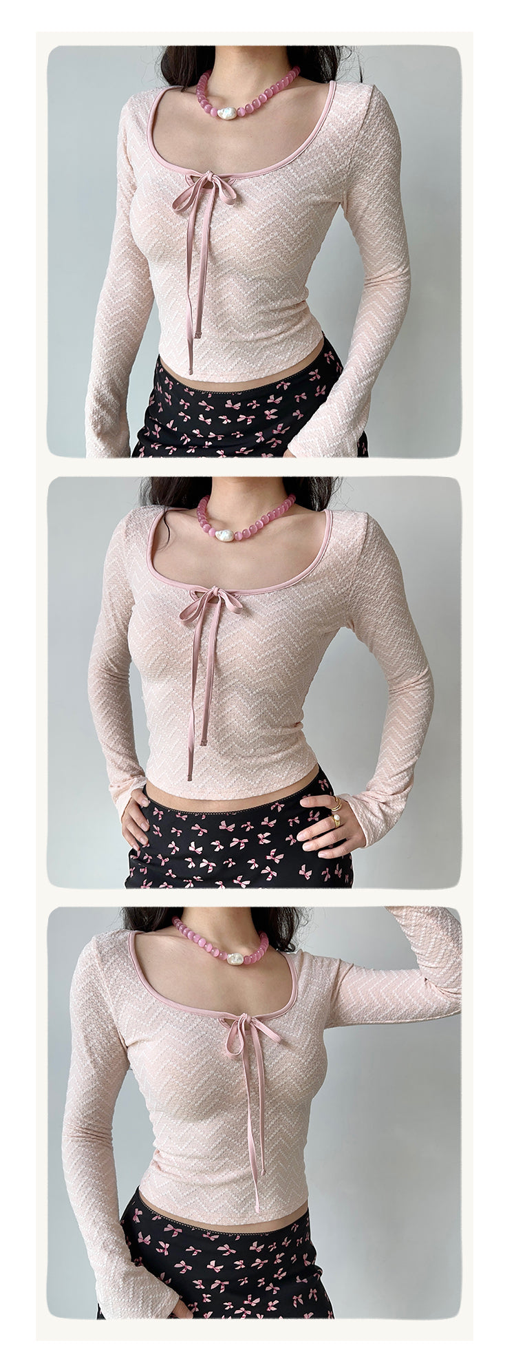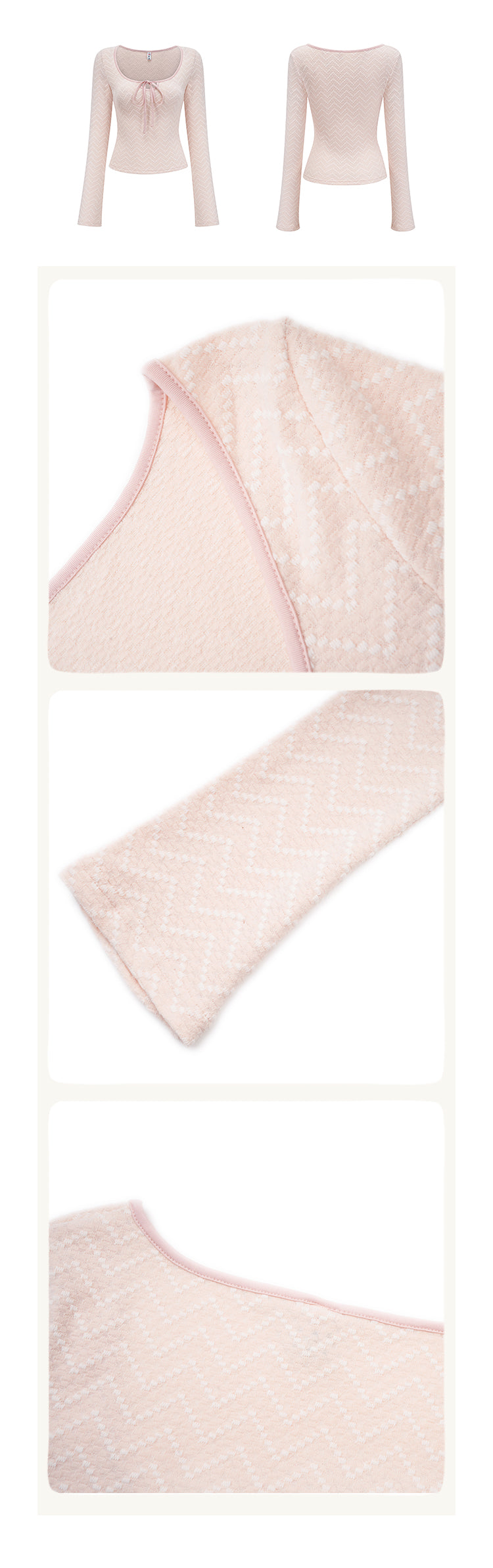 Cute ballet top bow tie. U-neck design to modify the face shape. The color matching wavy fabric has three-dimensional and not monotonous. Extended sleeve length, lengthen body proportion. Four colors look good, can be used as an inner layer. Pink blue refreshing and age-reducing / Brown autumn and winter atmosphere / Green retro whitening. 90% nylon 10% spandex.