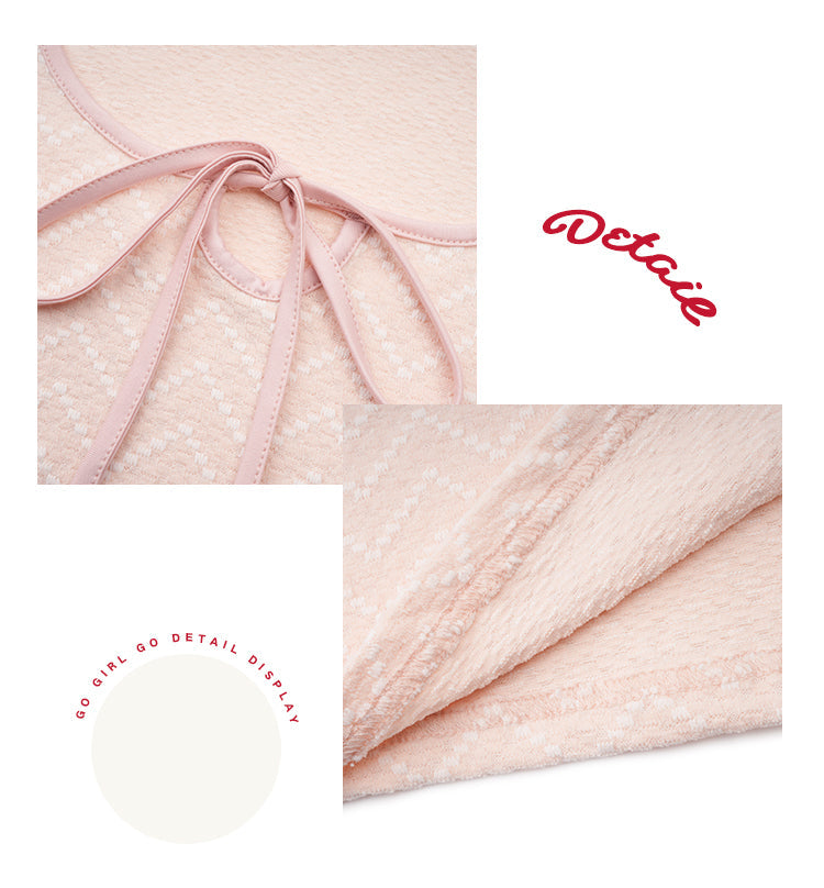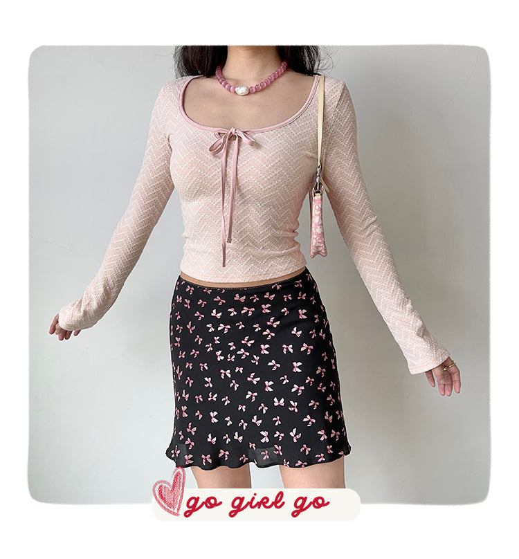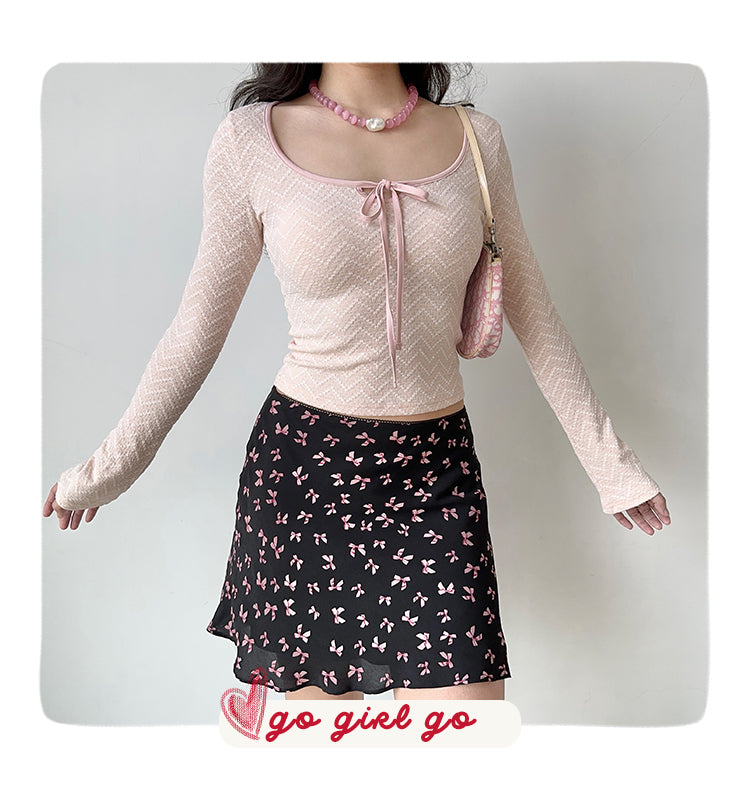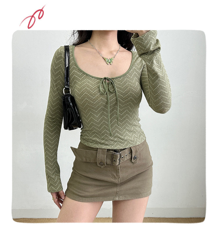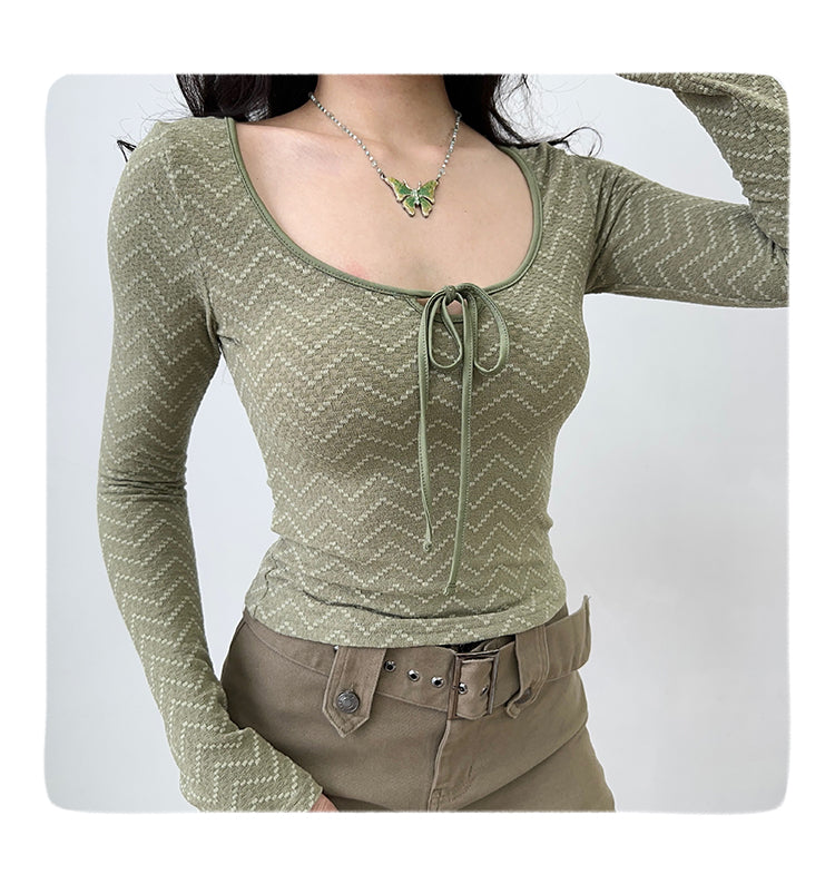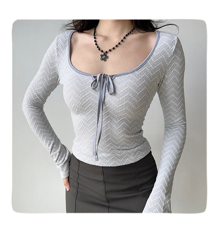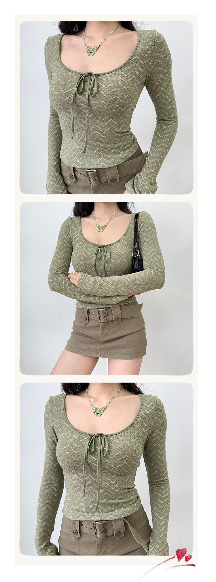 Cute ballet top bow tie. U-neck design to modify the face shape. The color matching wavy fabric has three-dimensional and not monotonous. Extended sleeve length, lengthen body proportion. Four colors look good, can be used as an inner layer. Pink blue refreshing and age-reducing / Brown autumn and winter atmosphere / Green retro whitening. 90% nylon 10% spandex.