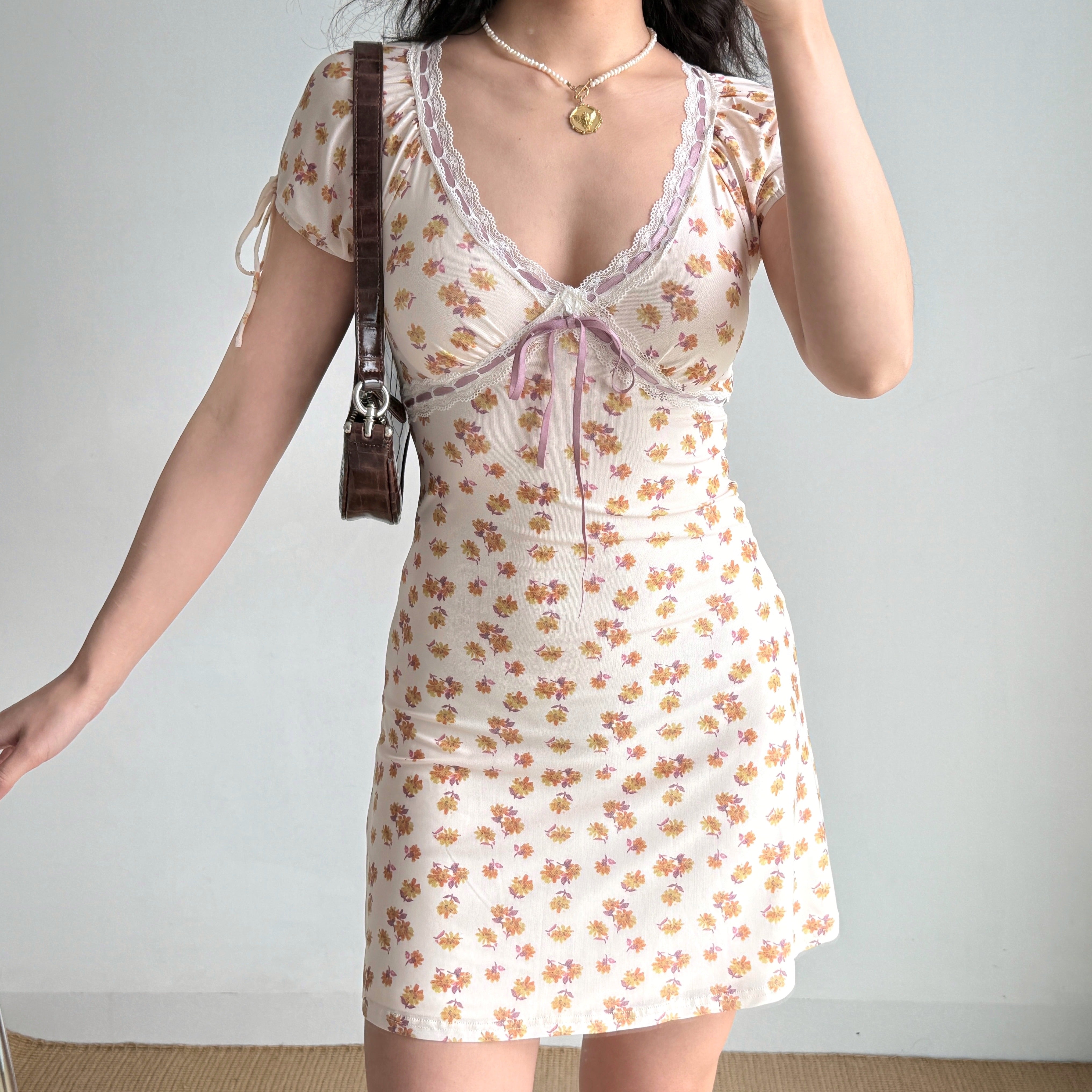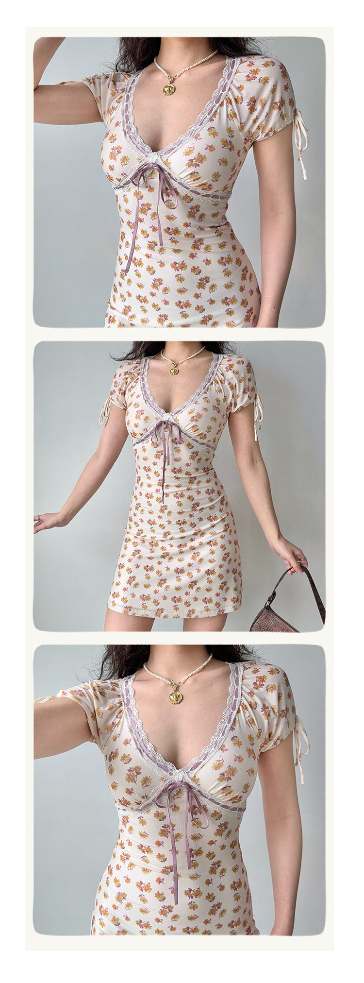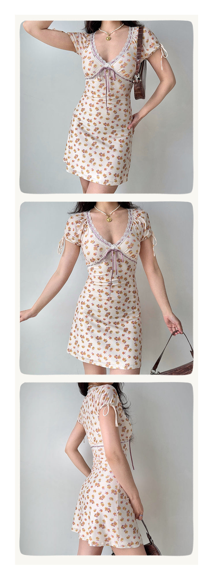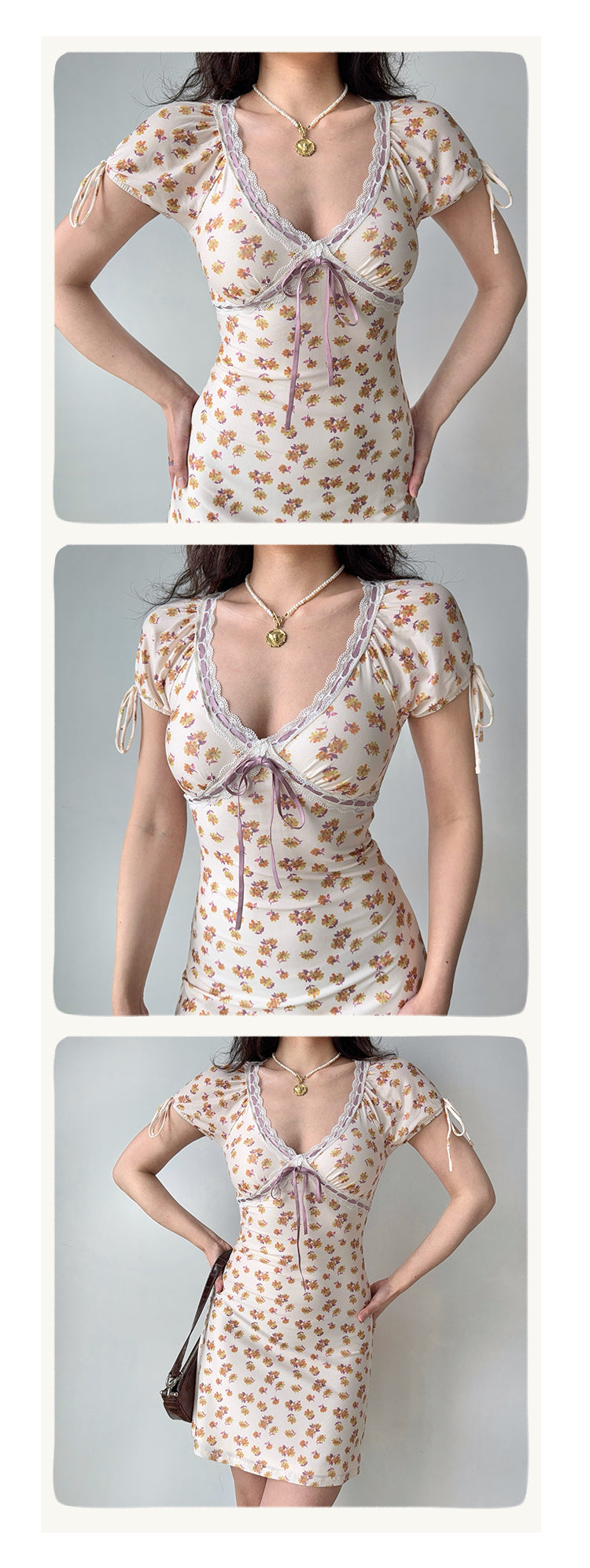 Small floral pattern for summer. V-shaped collar protrudes the neck line. Lace lace splicing purple webbing echoes the color of florals. Slim fit A-line skirt, better shape modification. Skirt body is lined without translucent. 90% polyester 10% spandex.