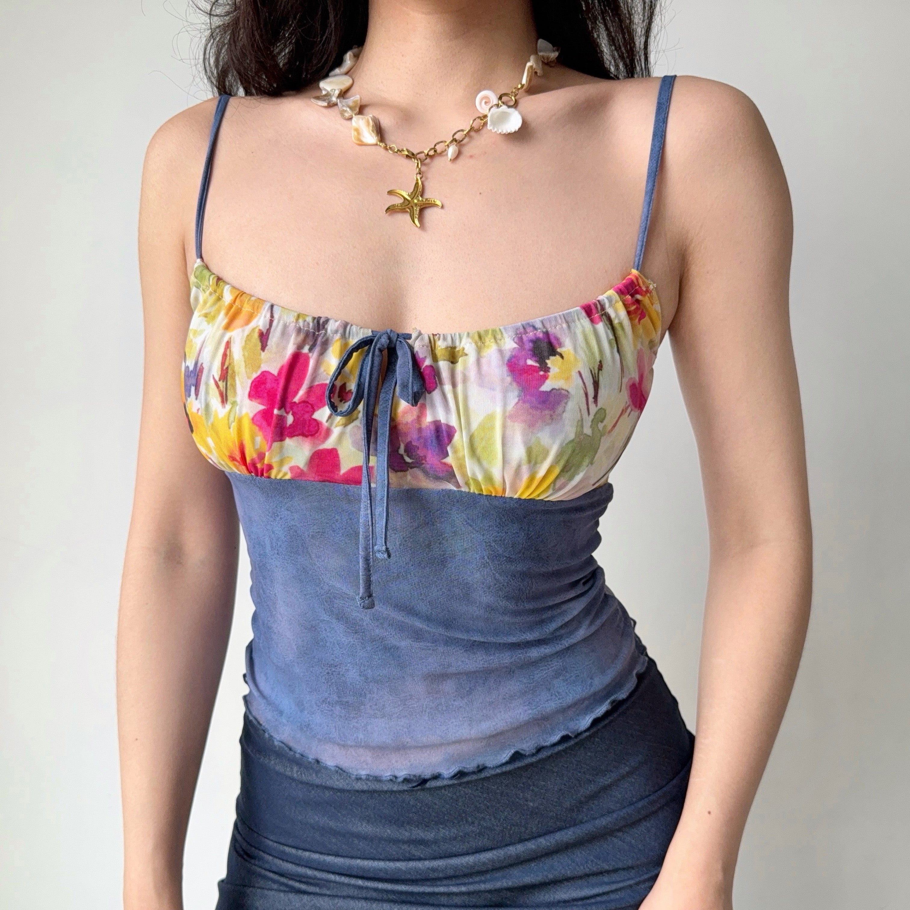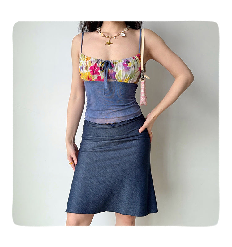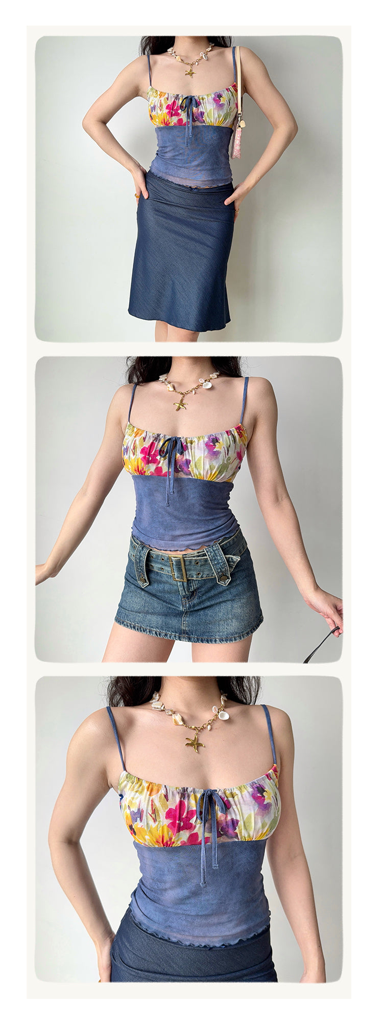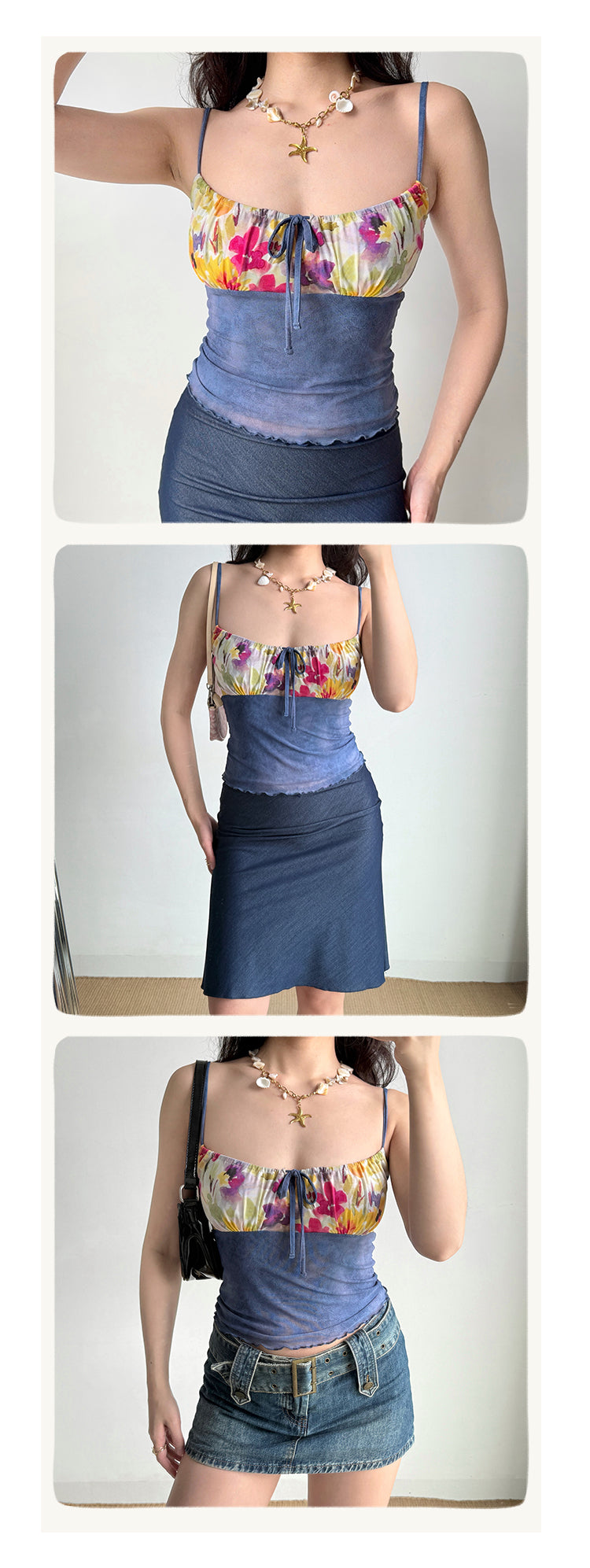 Niubiquitous printed splicing design is not easy to wear the same clothes. The chest lace can be adjusted by itself. The blue with a little old-fashioned feeling. The small wave lace design at the hem is full of details. Paired with a fishtail skirt with imitation denim color is very good. 90% nylon 10% spandex.