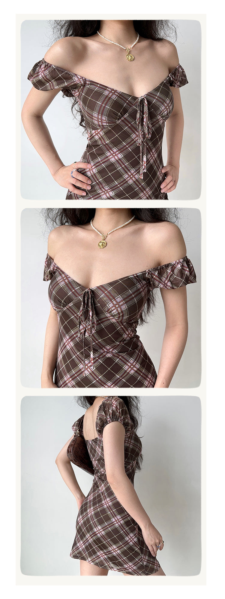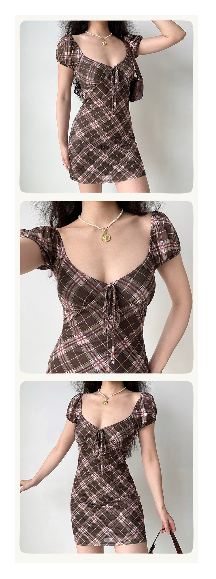 Retro and fashionable brown check fabric. VU collar design shows collarbone and neck lines. Puff sleeves are playful and cute, and can also be worn as a single-length collar more sexy. Chest laces are embellished with slim fit style micro A-shaped. Skirt is equipped with skin-friendly lining, not transparent. 95% polyester 5% spandex.