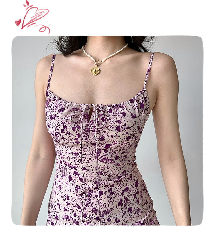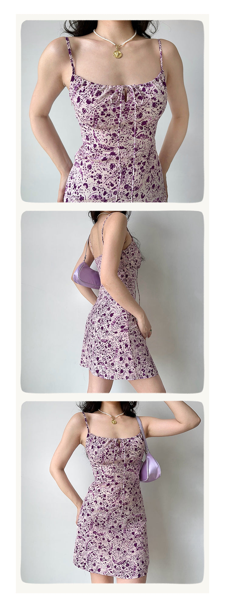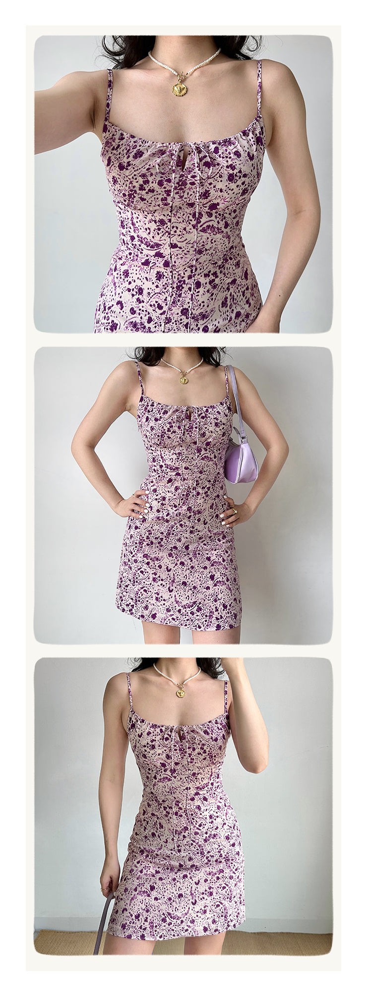 There is always a suspender skirt in summer. Romantic purple floral beauty. Slim fit style Small A-shaped hem modify the body. The back is not tight. The fabric has a good drapery and neat cut. The fabric is not elastic. 100% polyester.