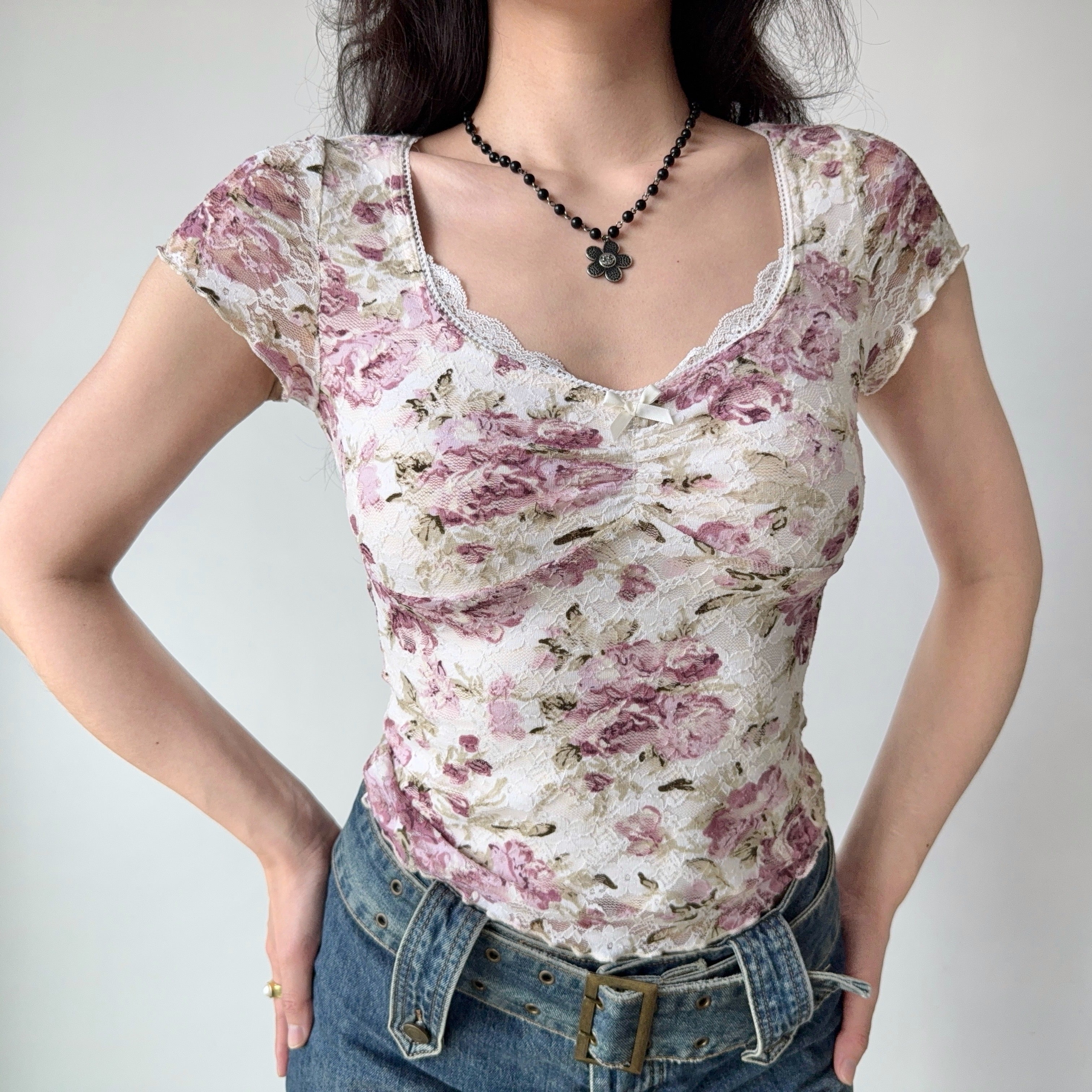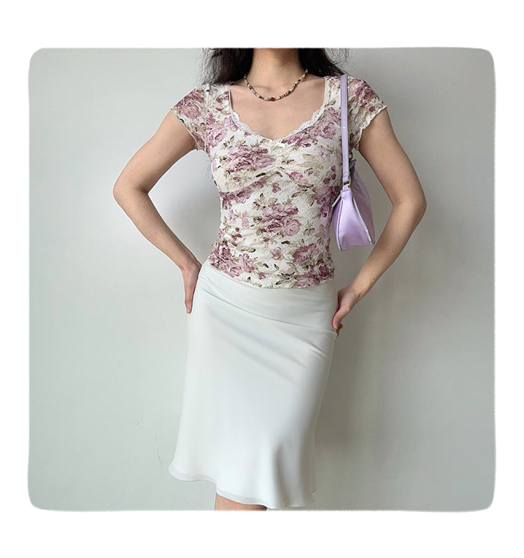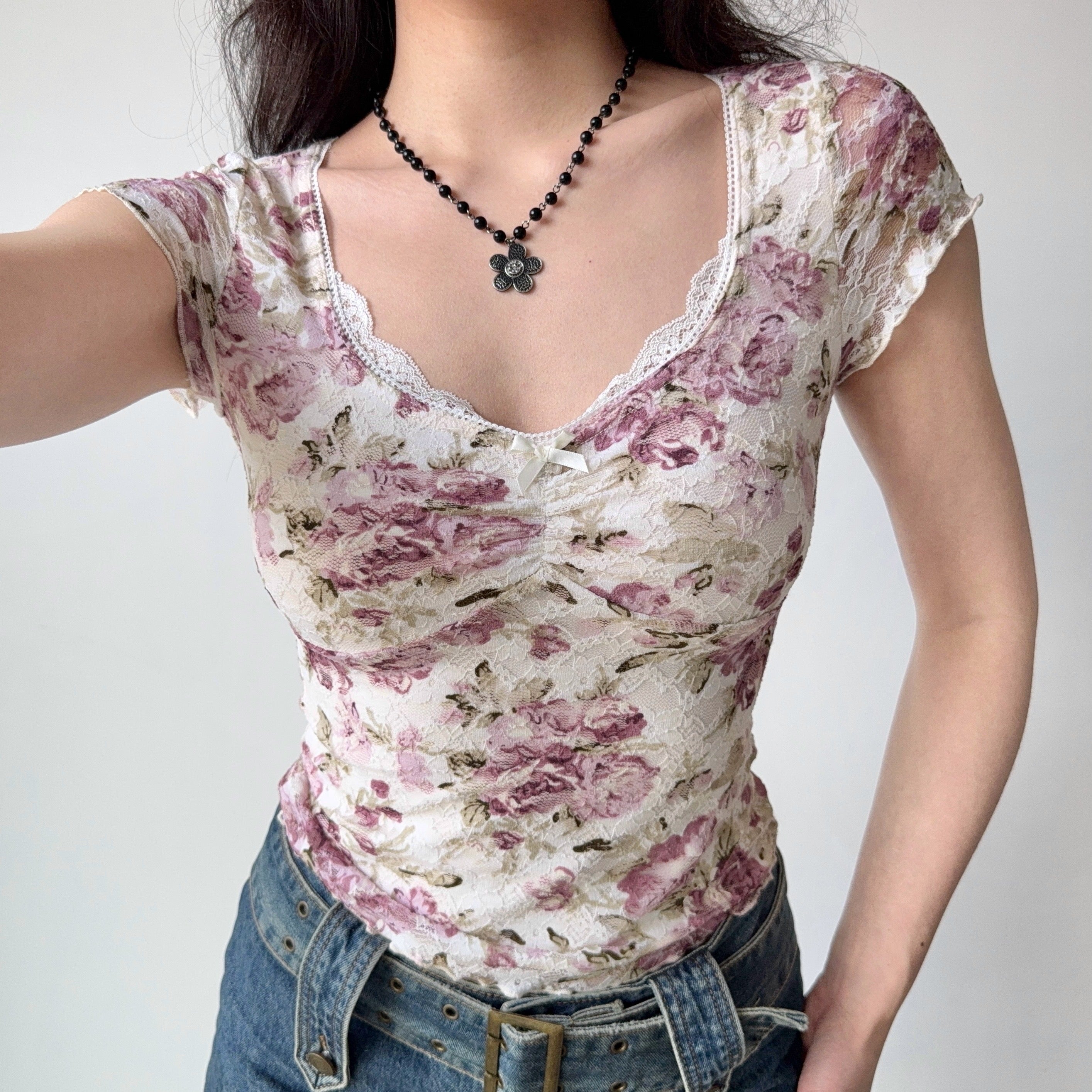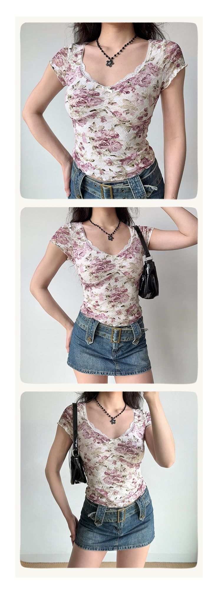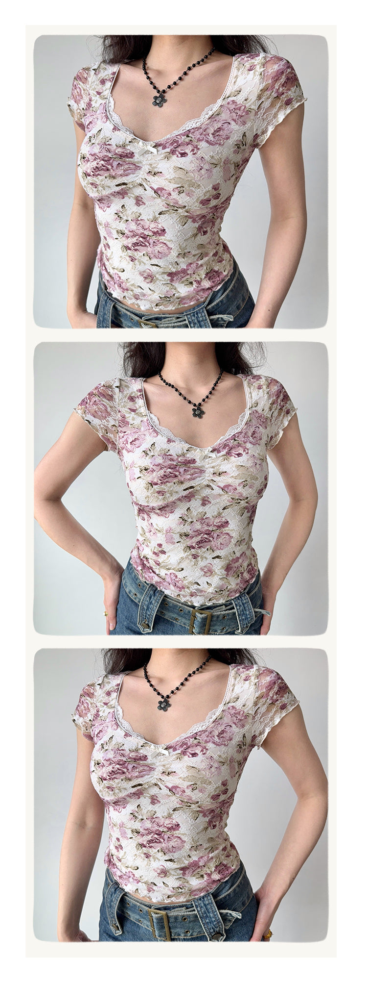 Printed lace fabric is very feminine. UV neckline visually modify the face shape. slim fit style The fabric is elastic. m casual with denim skirt. m elegant with fishtail skirt. Note: lace fabric may be easy to hook up. It is difficult to avoid during wearing. Try to choose hand washing, if you need a machine, please turn over and put a laundry bag. 95% nylon 5% spandex.
