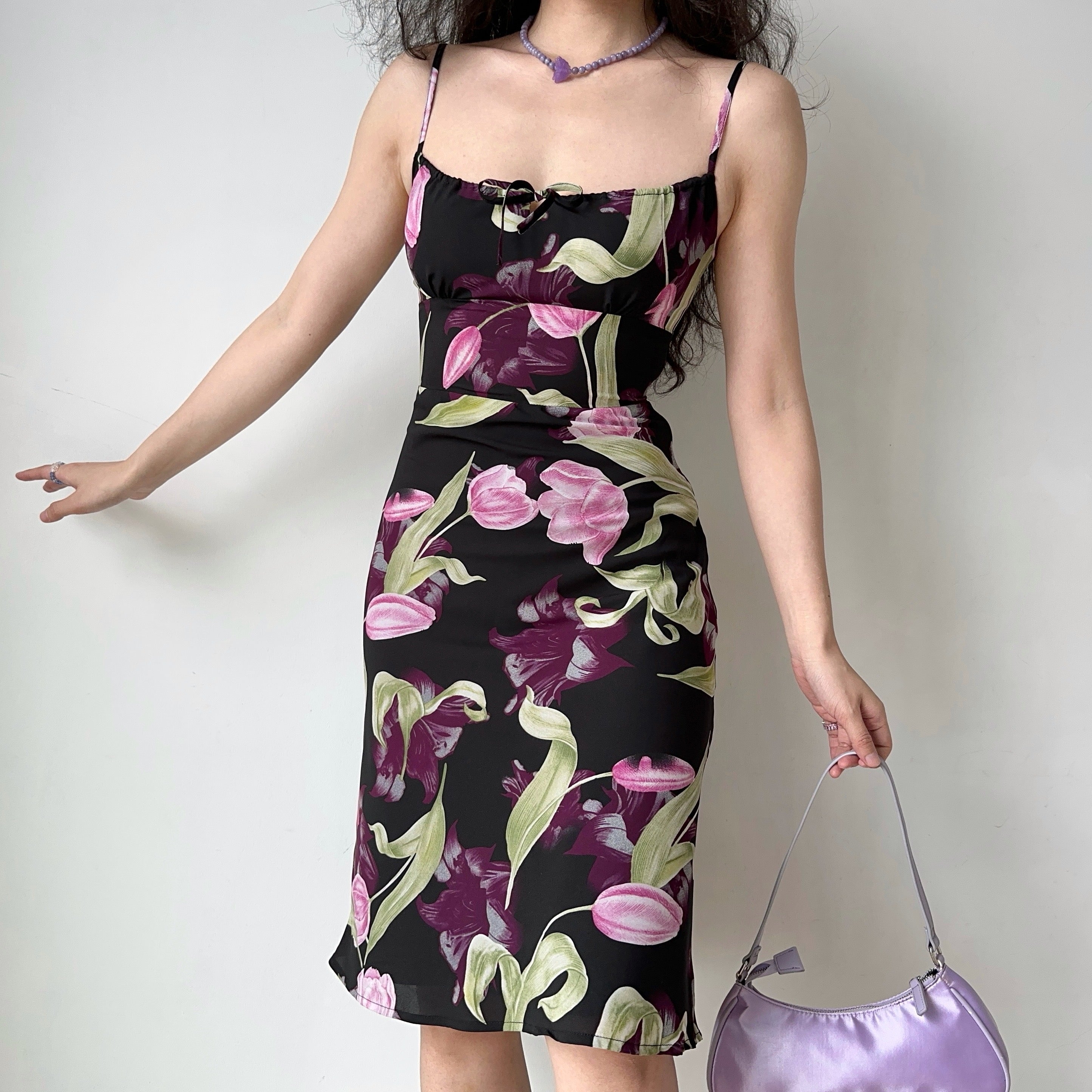 Spring limited tulip print. Black background color bright contrasting color matching. Temperament with a little sexy, very good photo shoot. Breast lace design shoulder straps adjustable. Back lace-up design shoulder straps are adjustable. High waistline lengthens the body proportion. Hong Kong style can be worn in spring. 100% polyester.