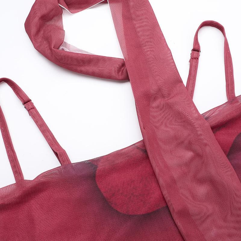 Mesh flower print ruffle backless cami midi dress