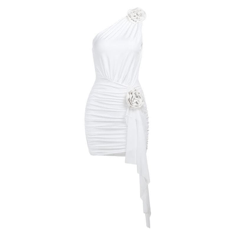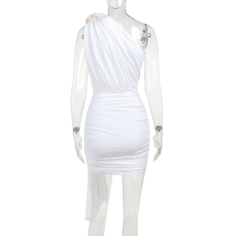 One shoulder flower applique ruched mini dress