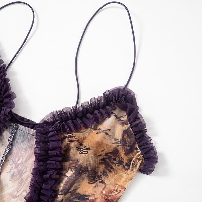 Ruffle spaghetti strap sheer mesh irregular slit maxi dress-final-sale