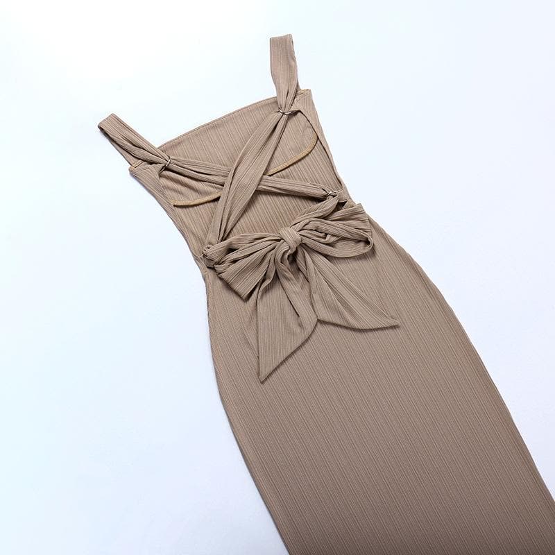 Textured lace up knotted solid midi cami dress