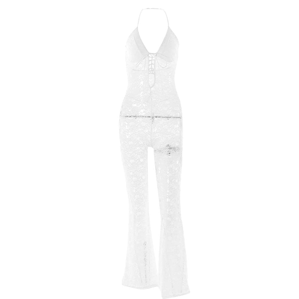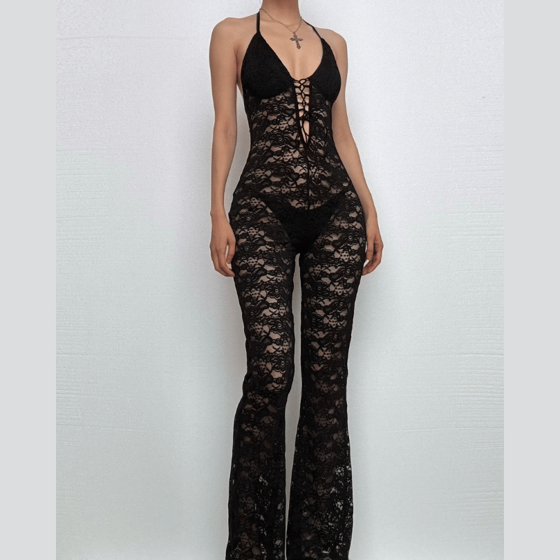 Halter lace lace up see through jumpsuit
