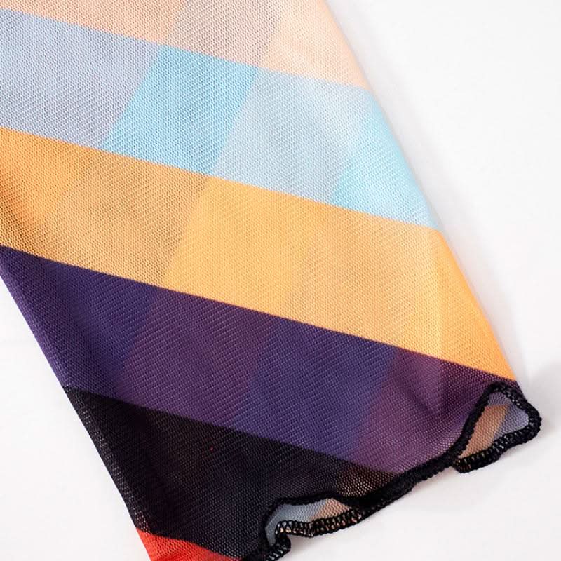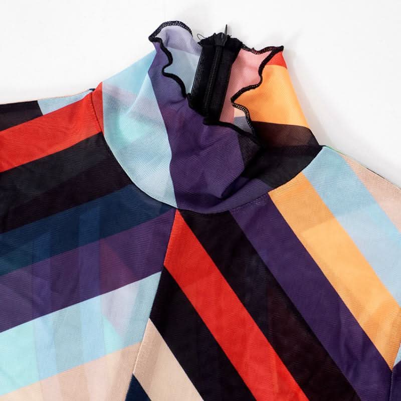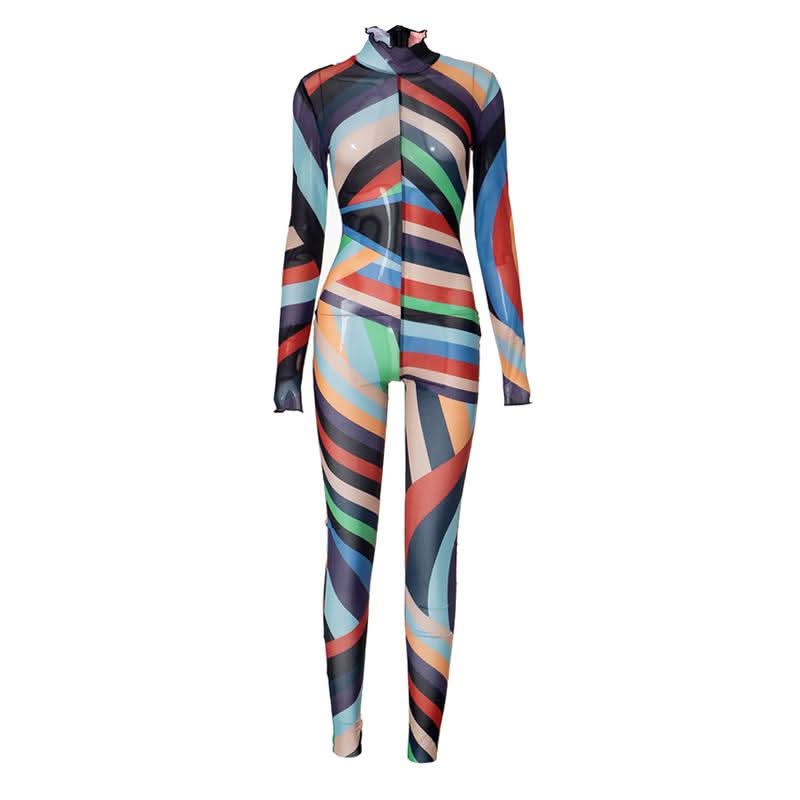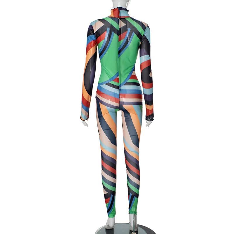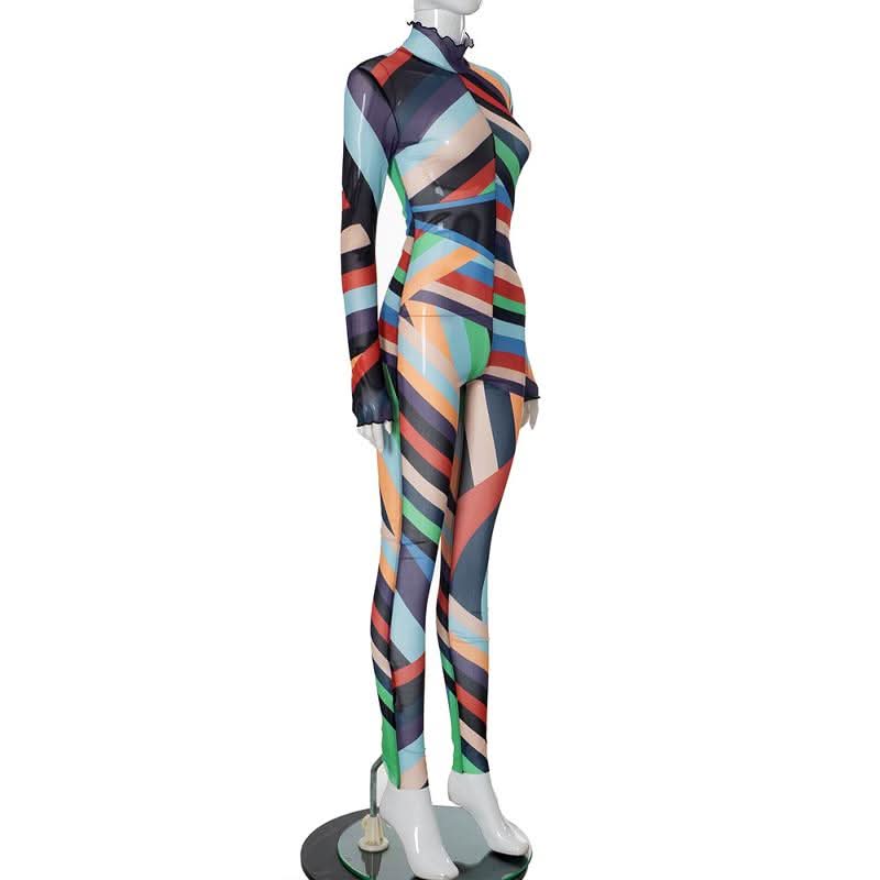 High neck long sleeve ruffle sheer mesh print jumpsuit