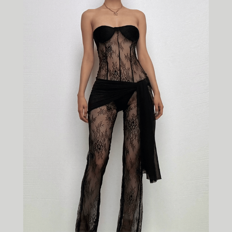 Lace see through solid self tie irregular backless tube jumpsuit