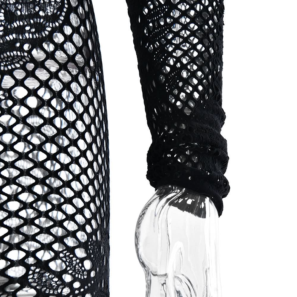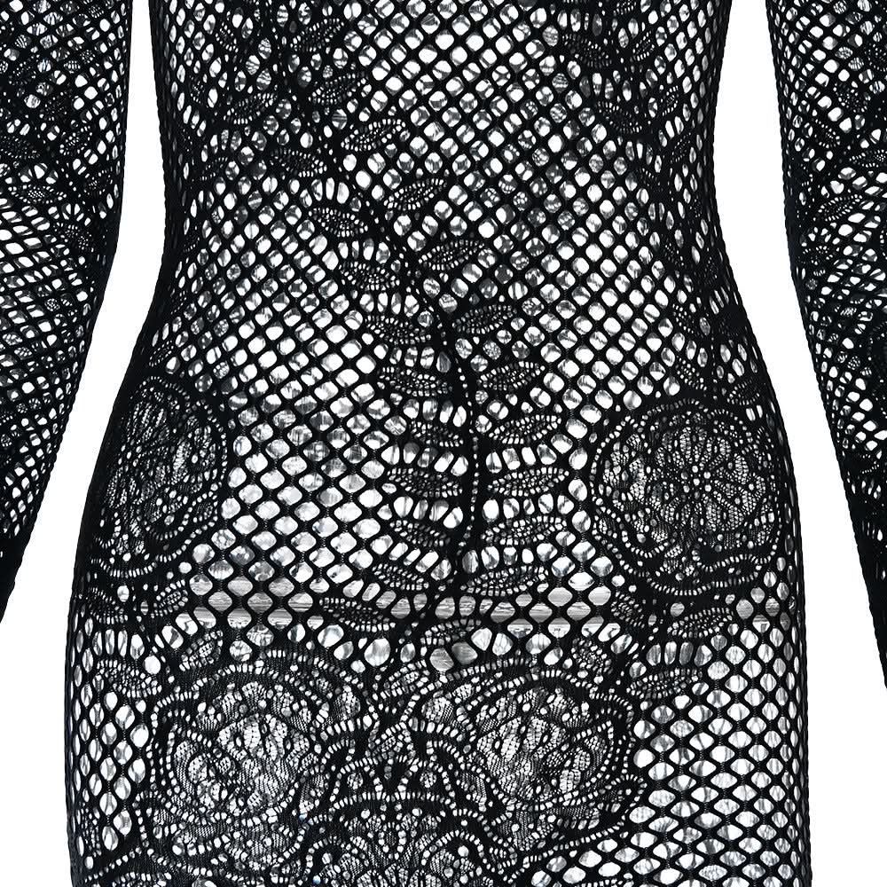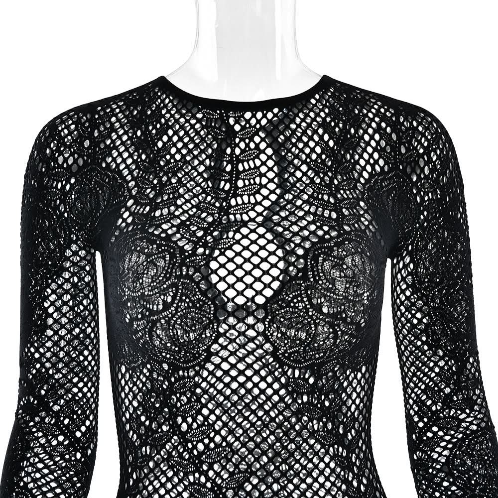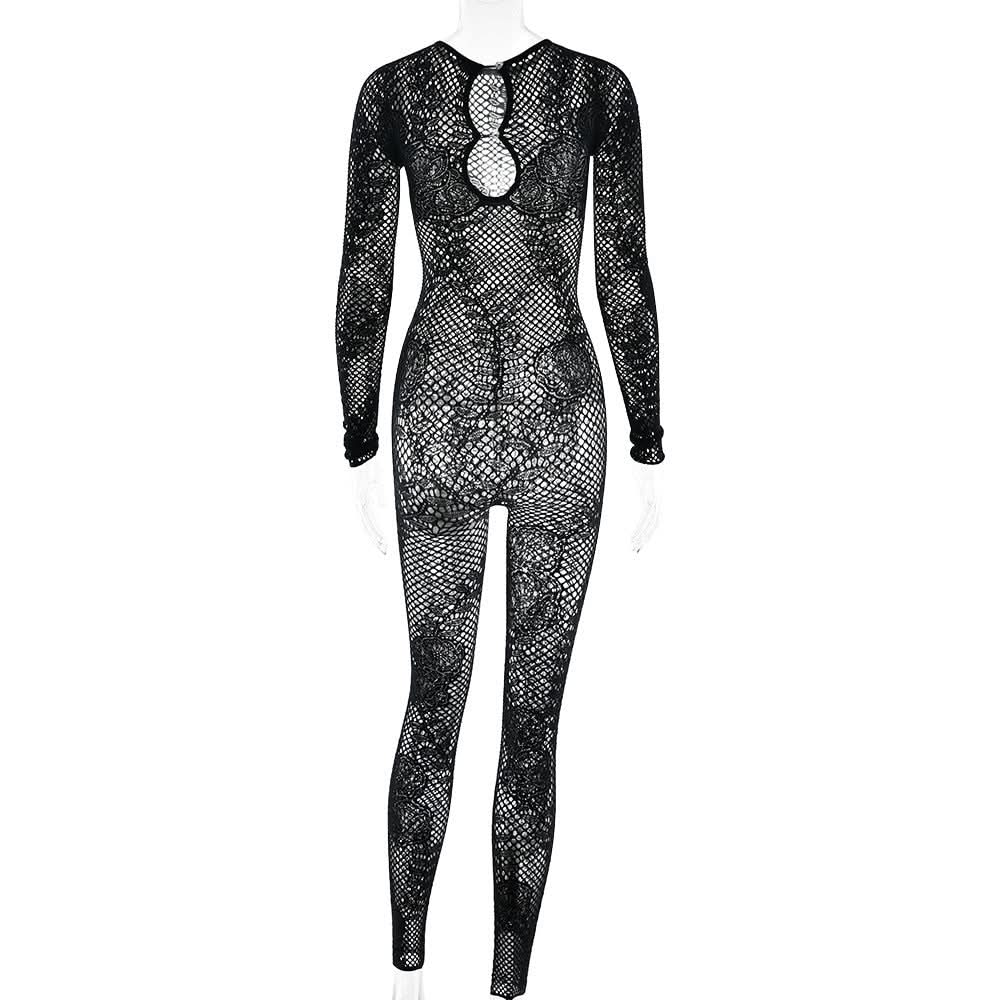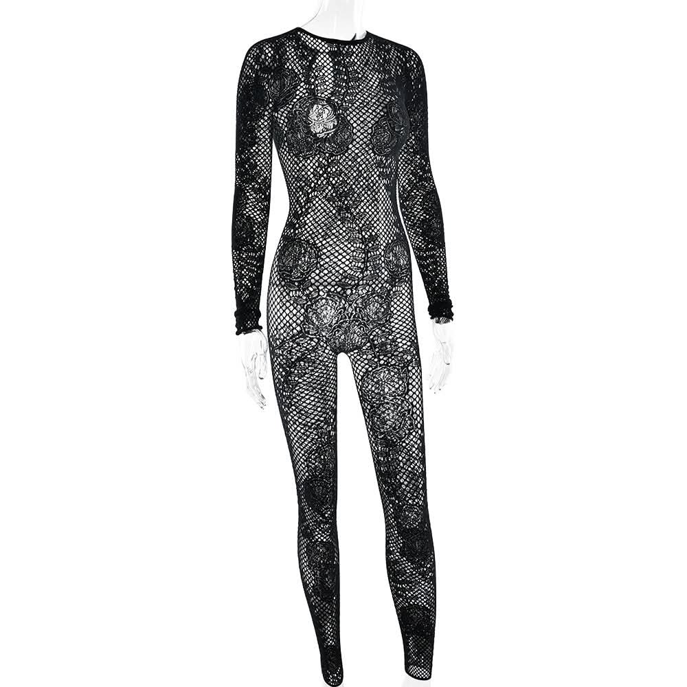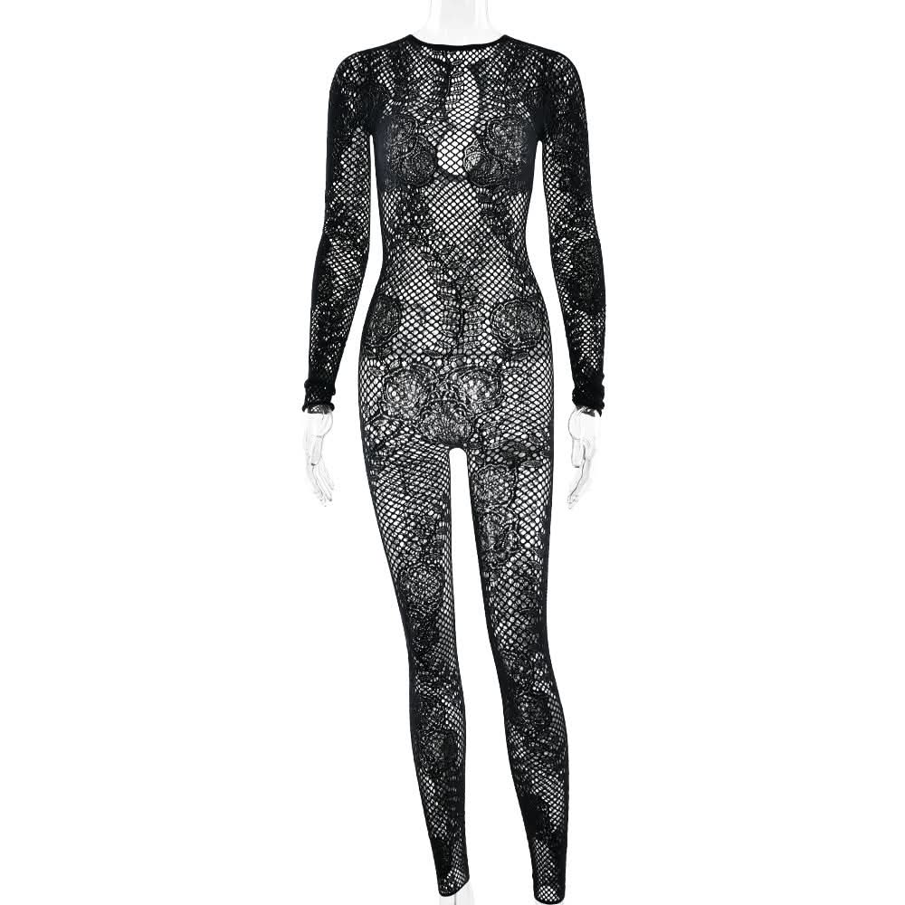 Long sleeve hollow out crewneck fishnet jumpsuit