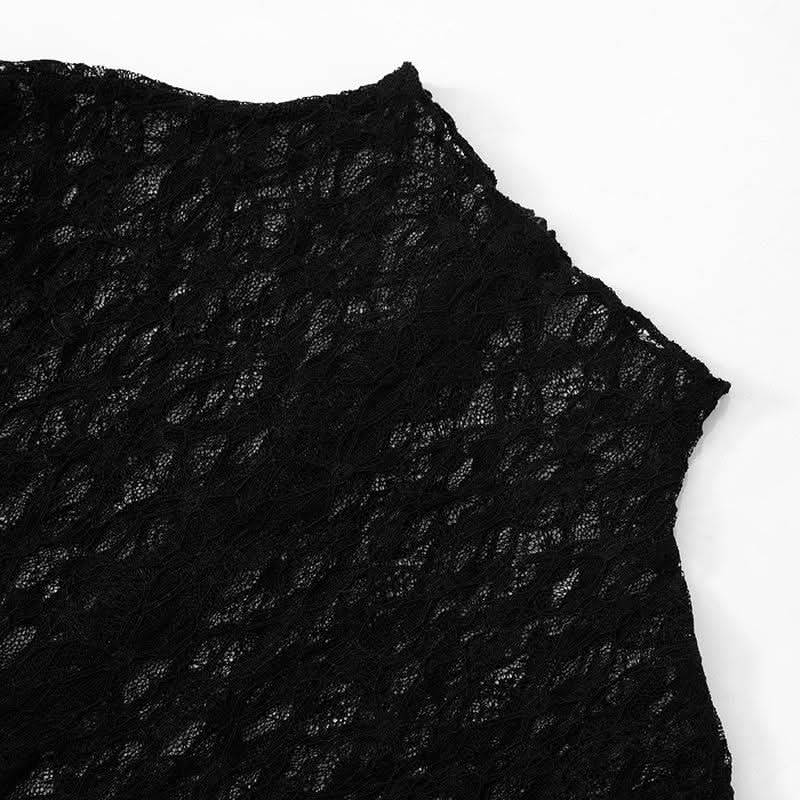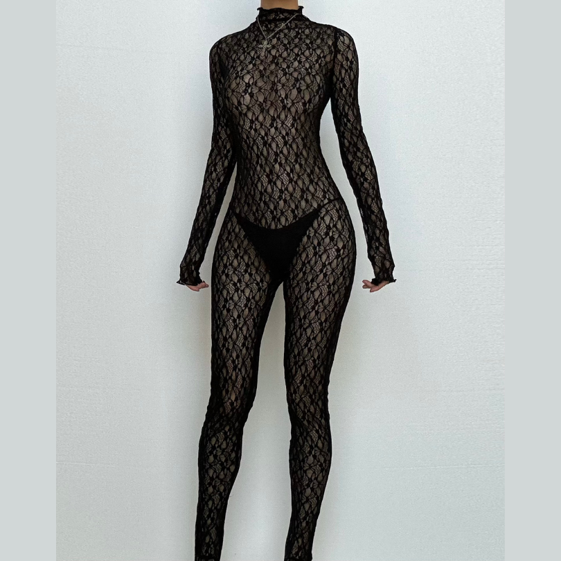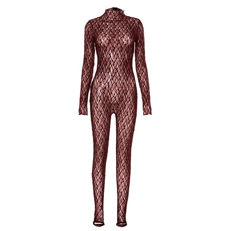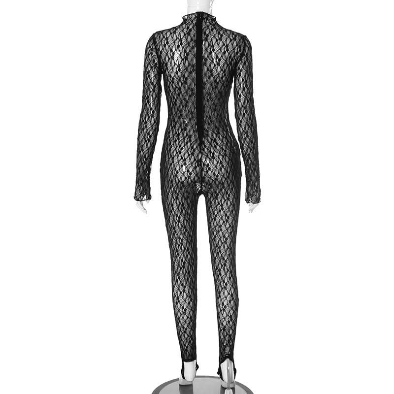 Long sleeve lace high neck zip-up see through jumpsuit