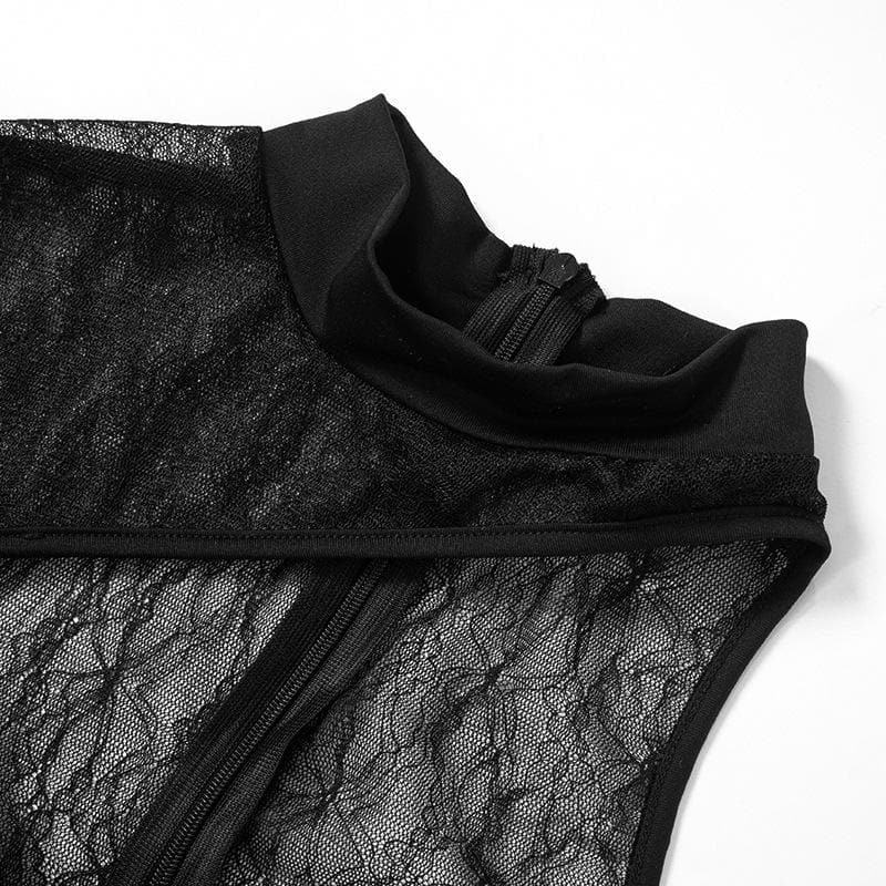 Long sleeve one shoulder lace see through solid high neck zip-up jumpsuit