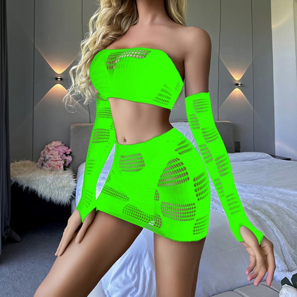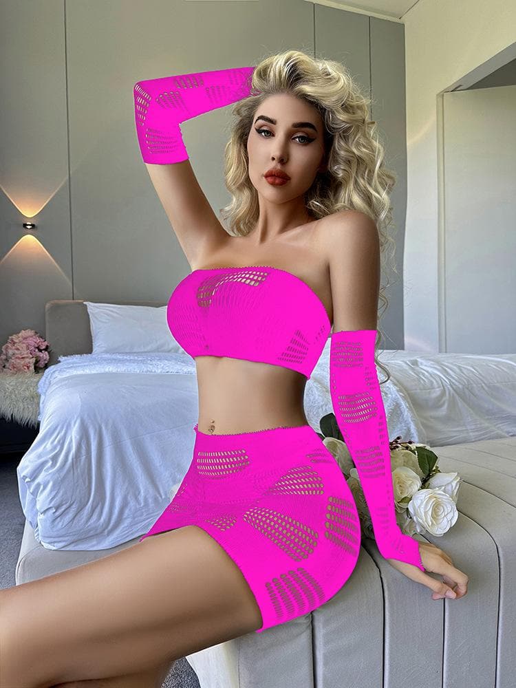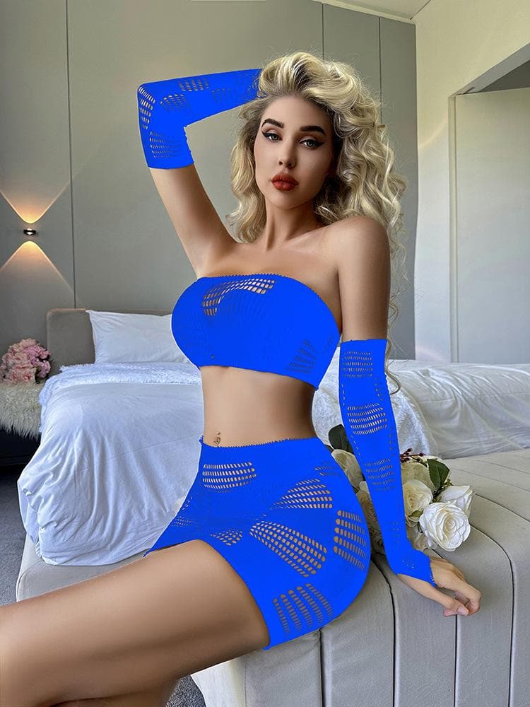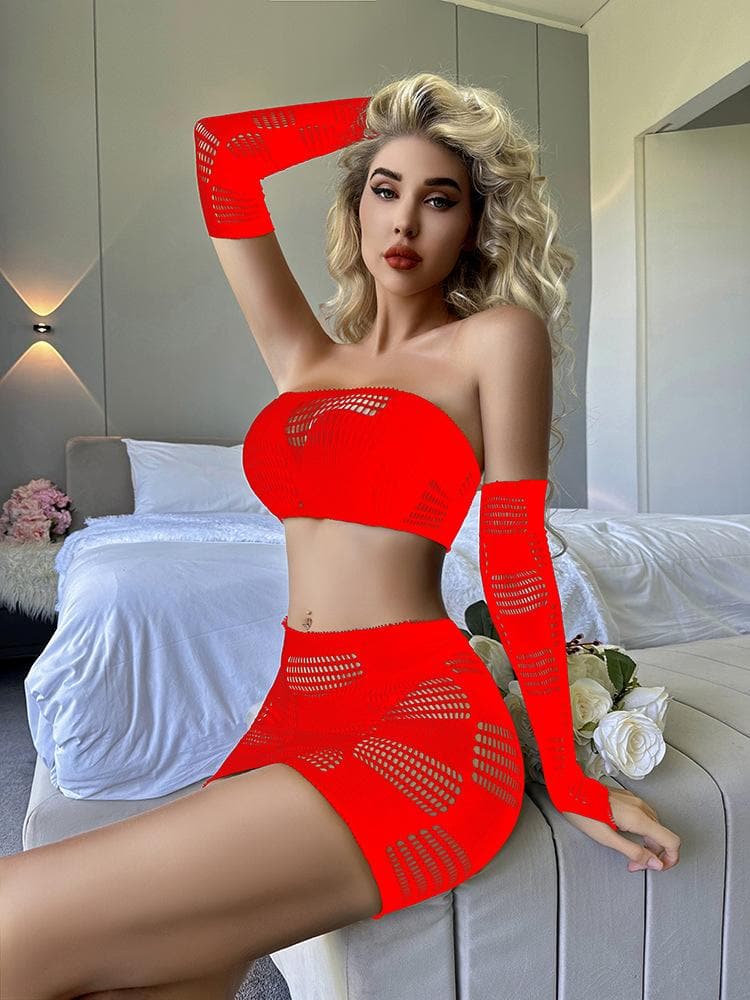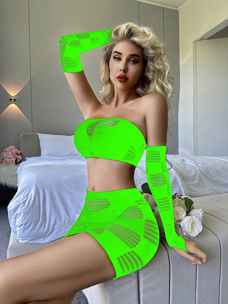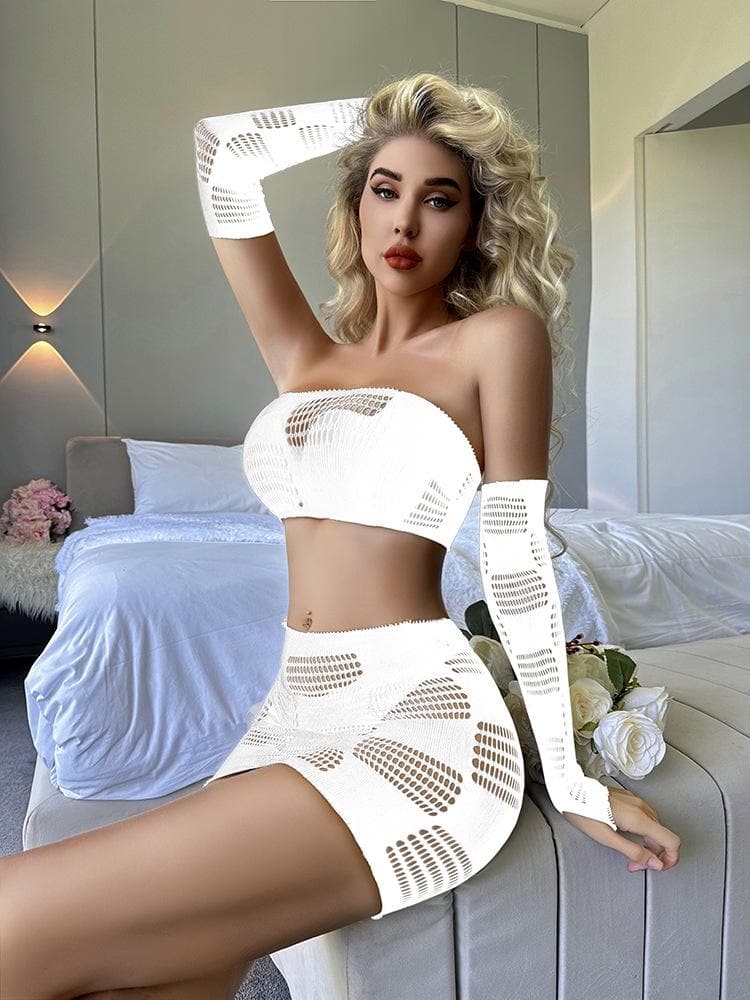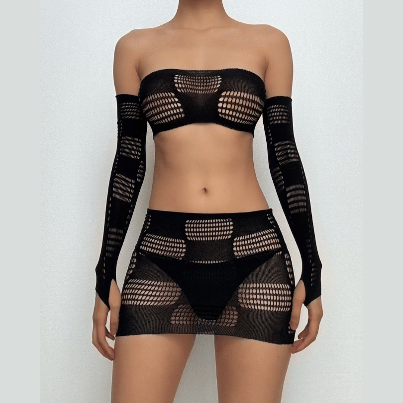 Gloves fishnet patchwork tube mini skirt set