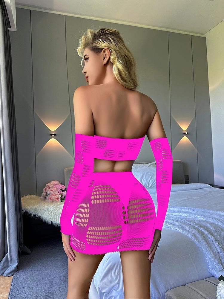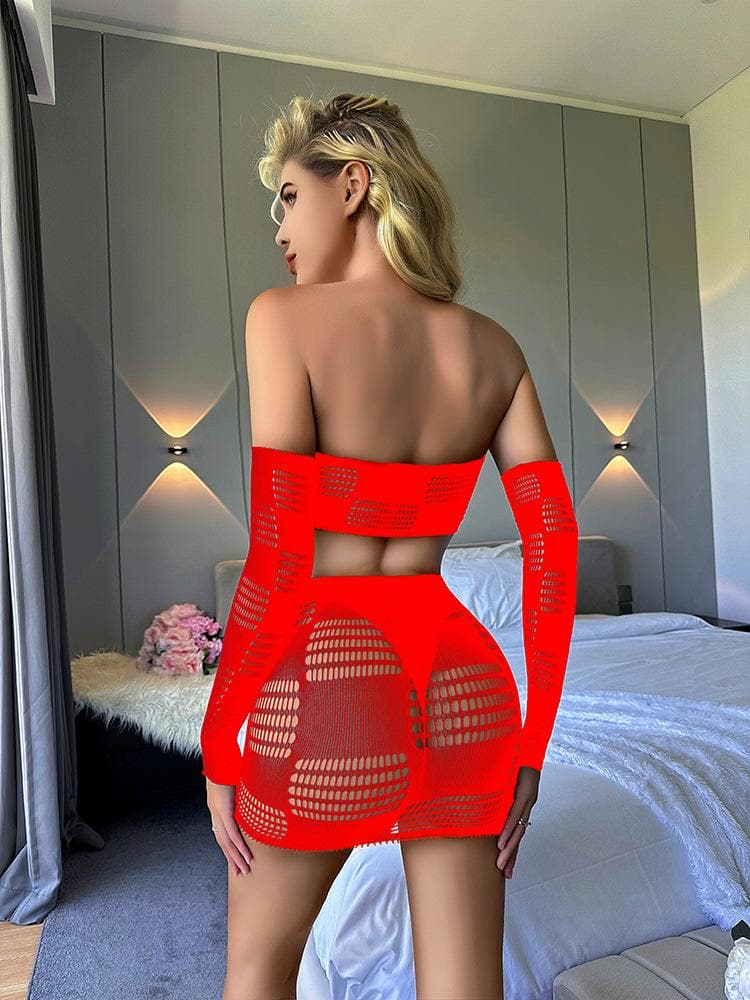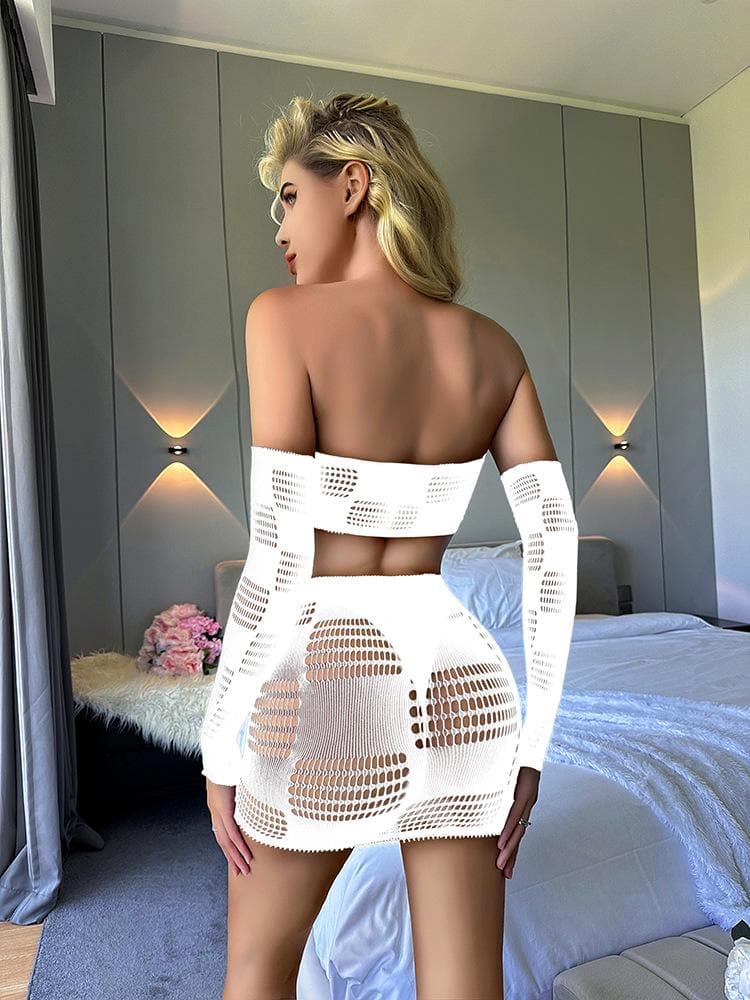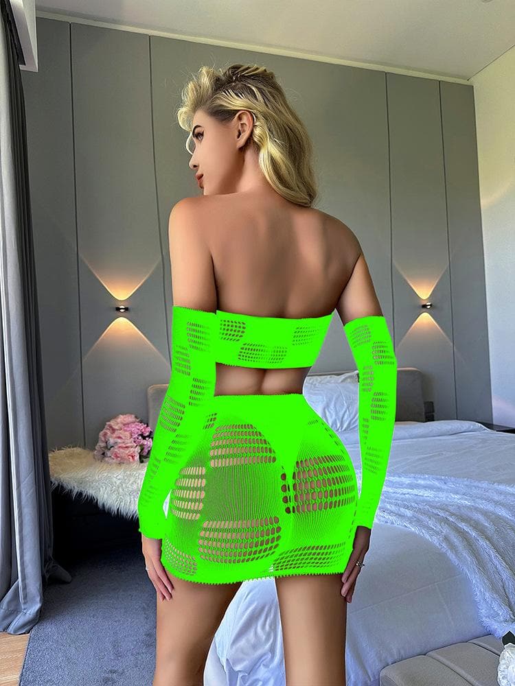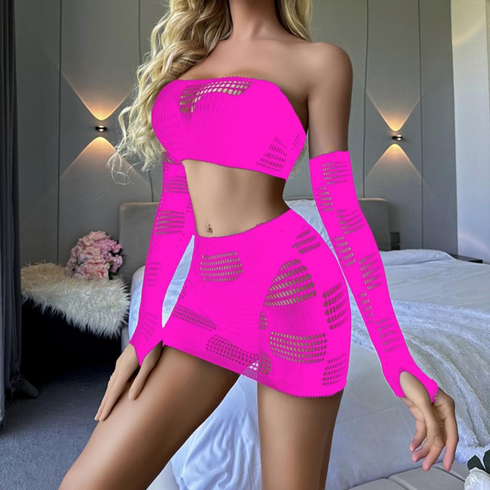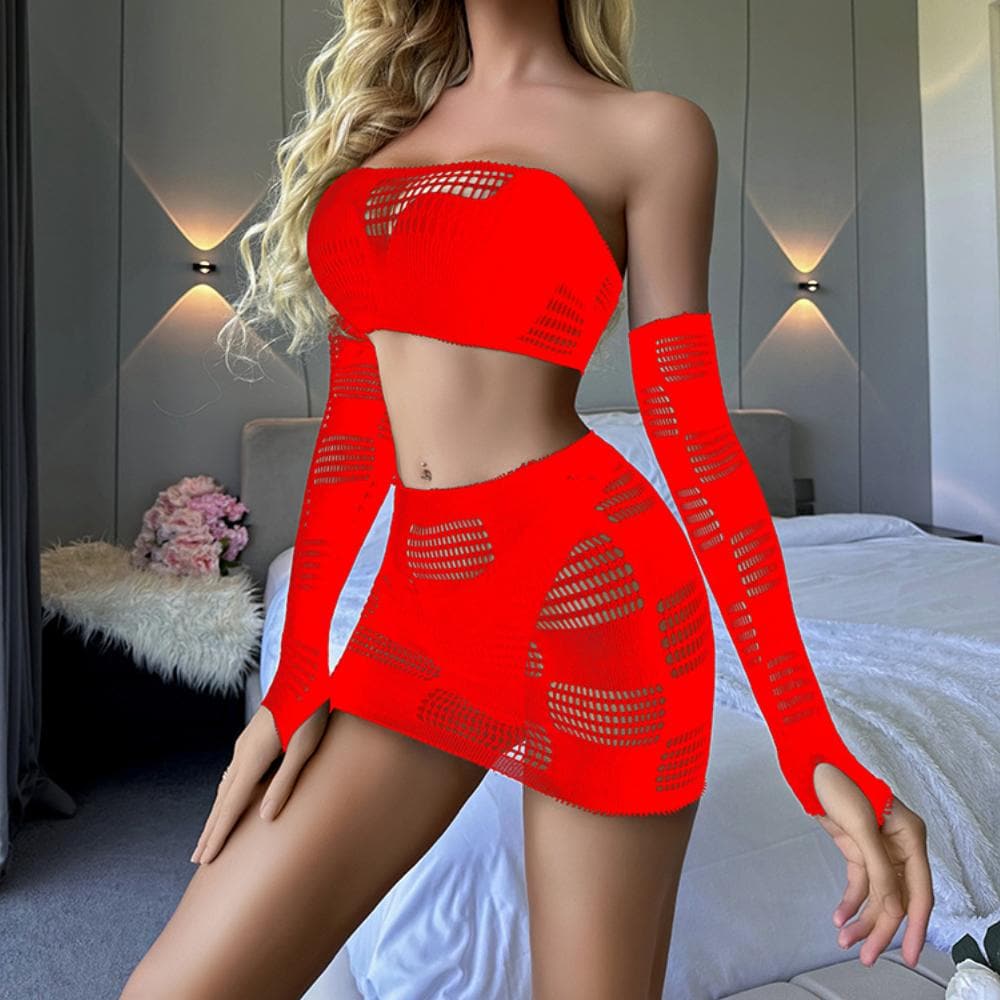 Gloves fishnet patchwork tube mini skirt set