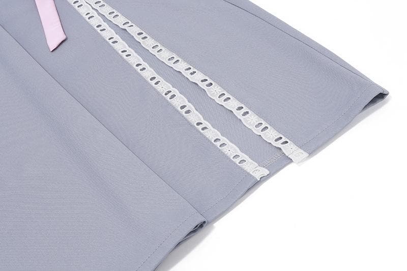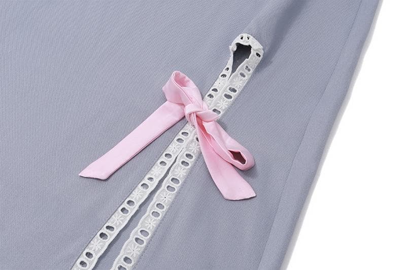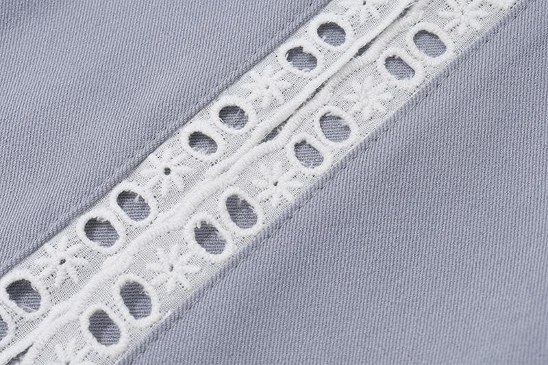 Bowknot slit lace hem denim zip-up hollow out irregular cut out midi skirt