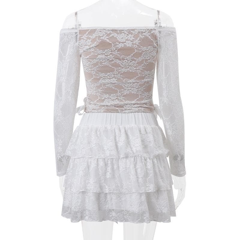 Long sleeve off shoulder bowknot ribbon lace up ruched mini skirt set