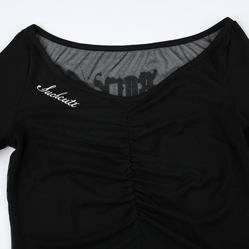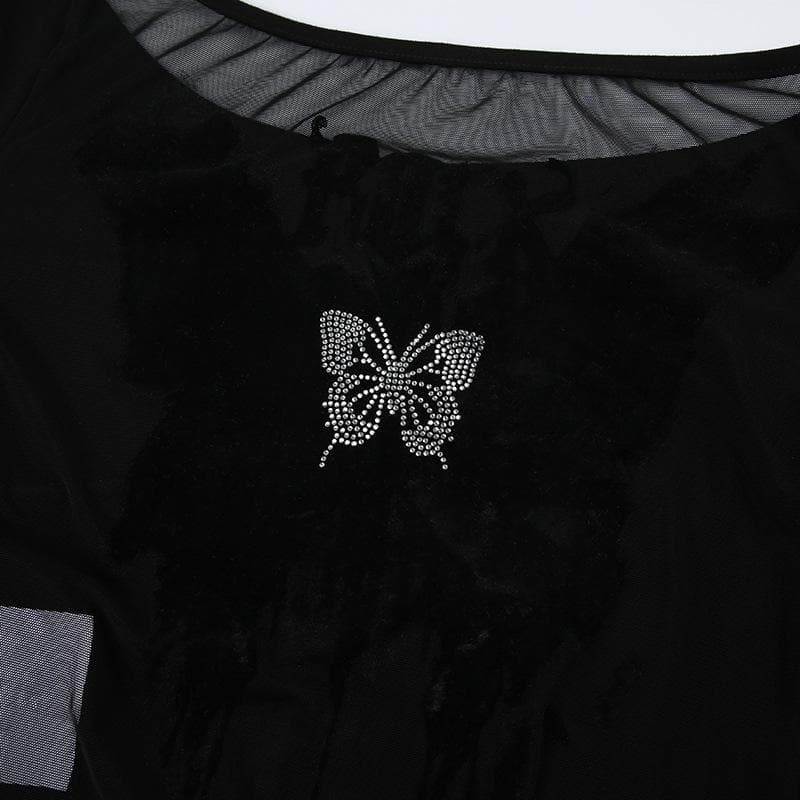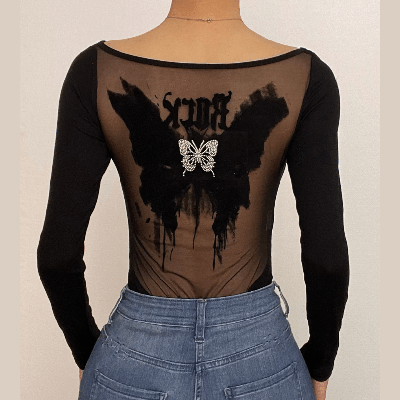 Butterfly pattern beaded solid ruched long sleeve bodysuit