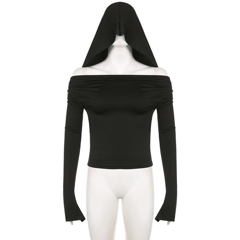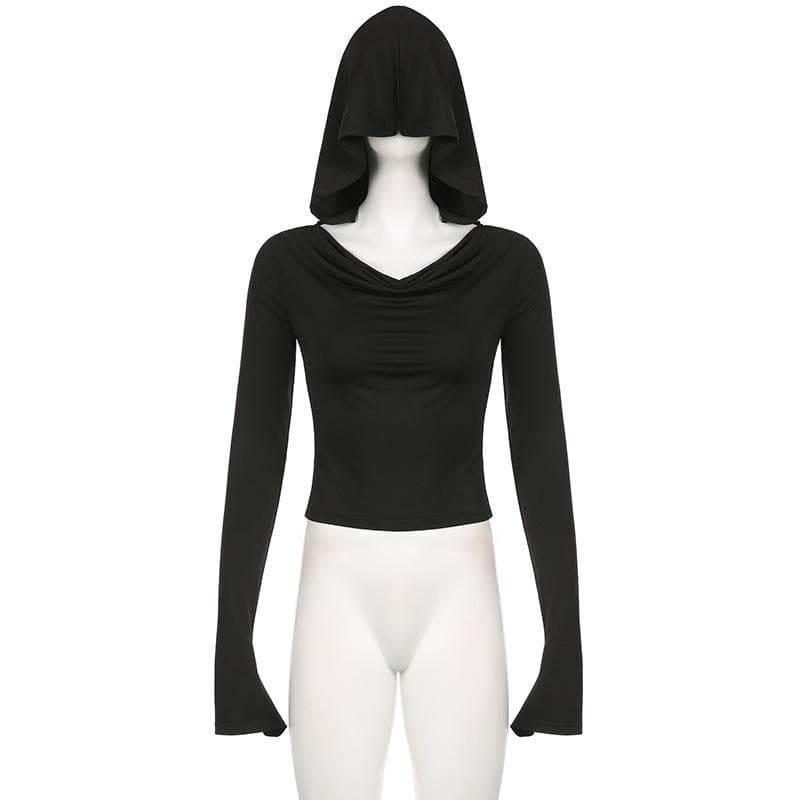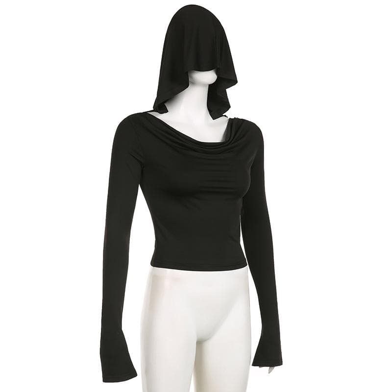 Cowl neck solid long flared sleeve hoodie 2-way top
