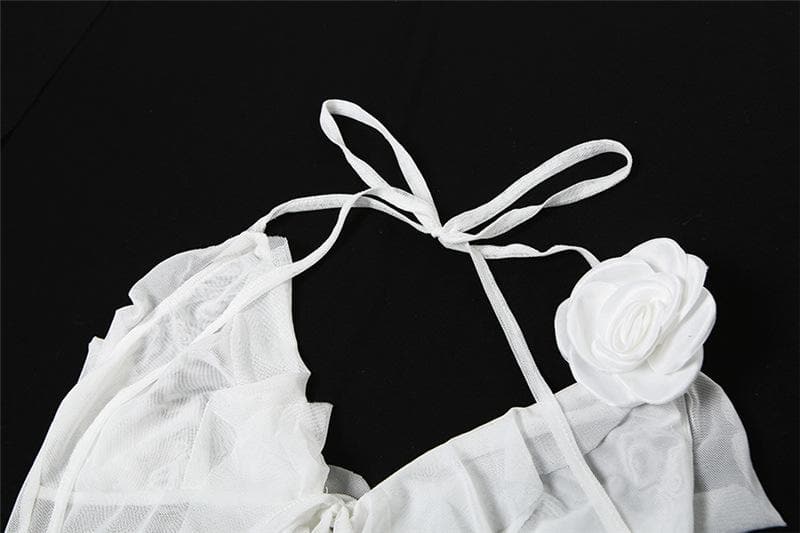 Halter rose applique sheer mesh ruffle v neck backless crop top
