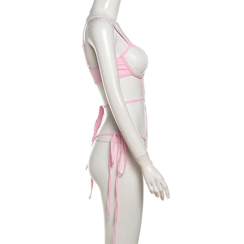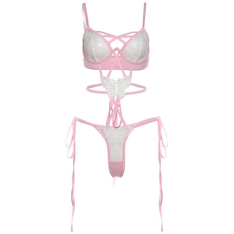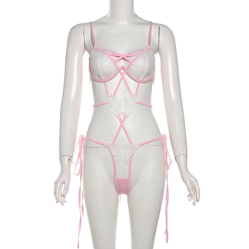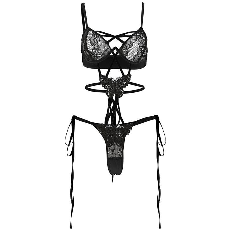 Lace butterfly pattern cross front hollow out cami bodysuit