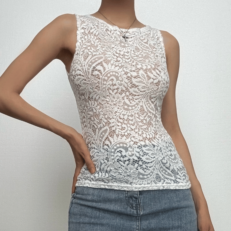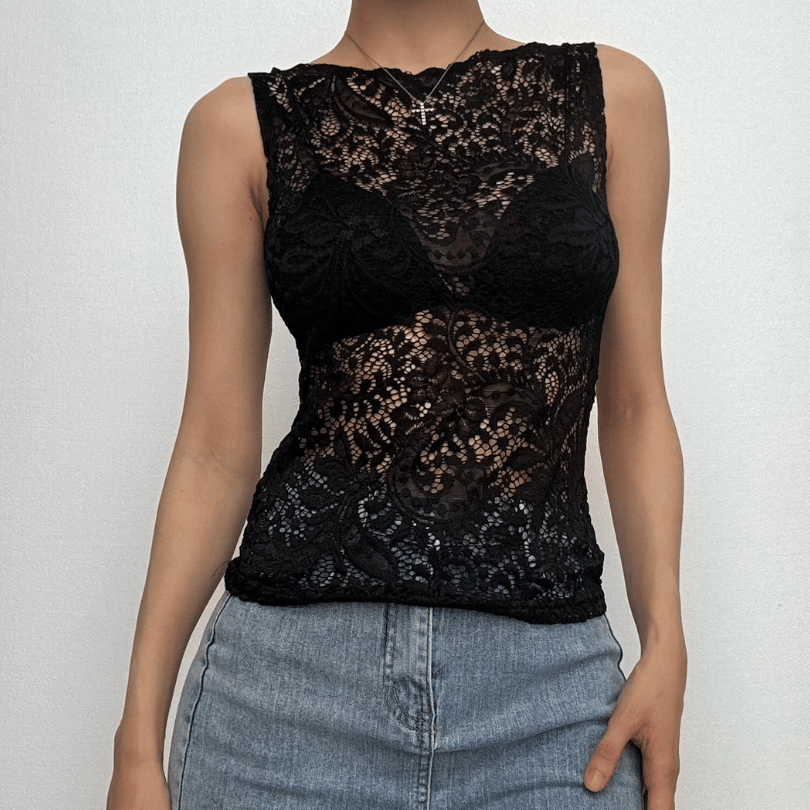 Lace see through round neck solid top