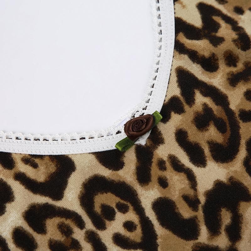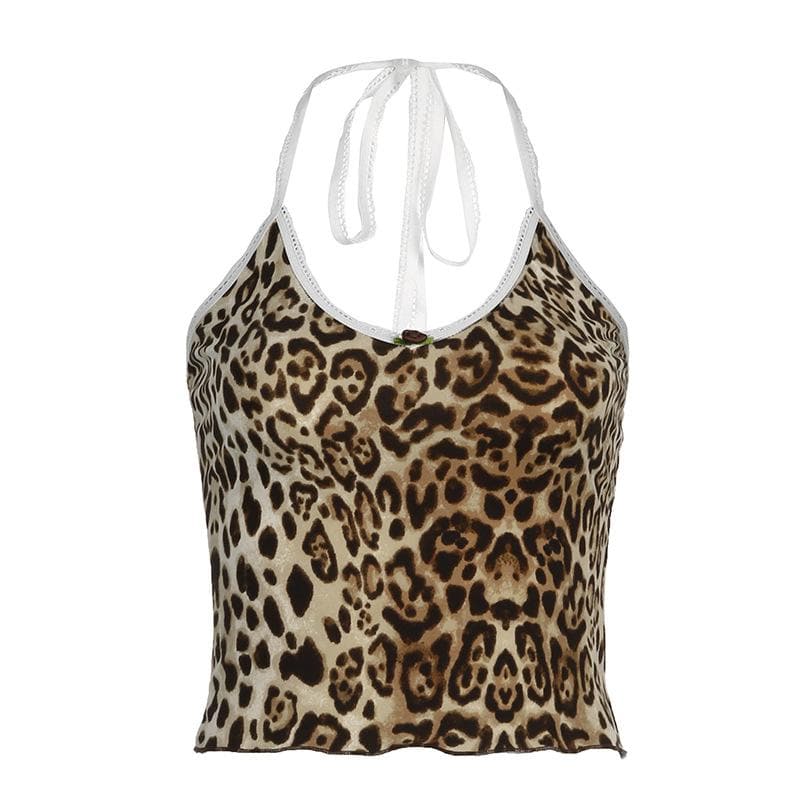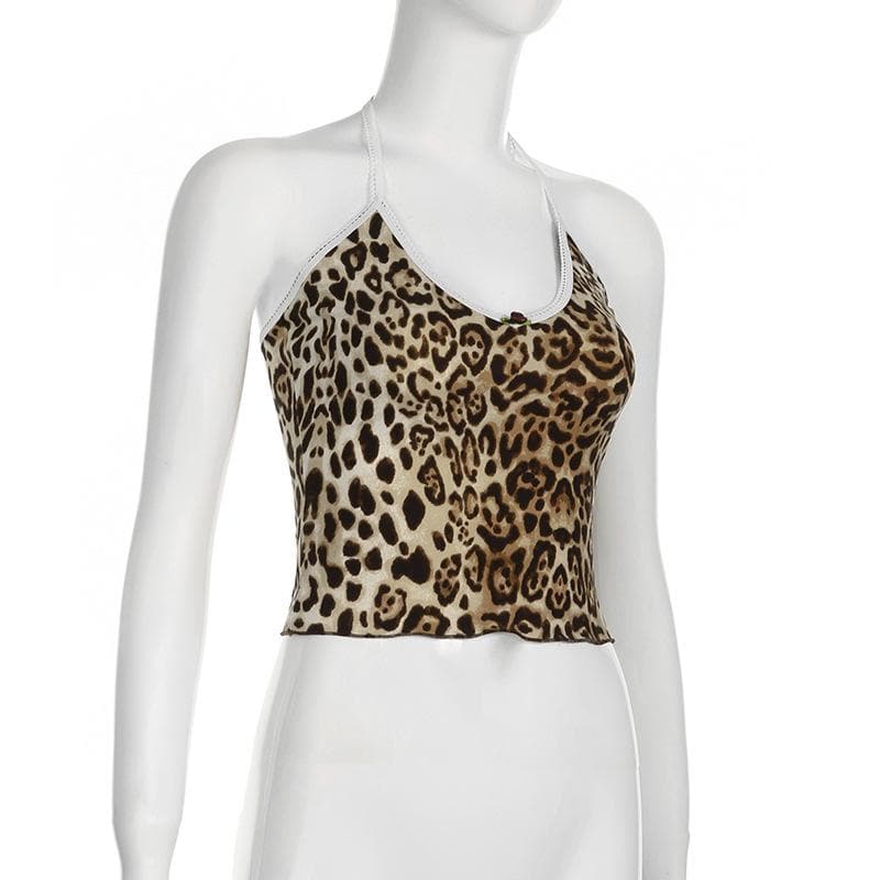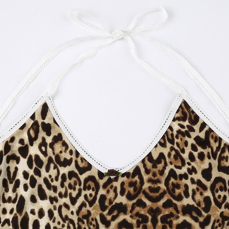 Leopard print halter v neck flower applique cami top