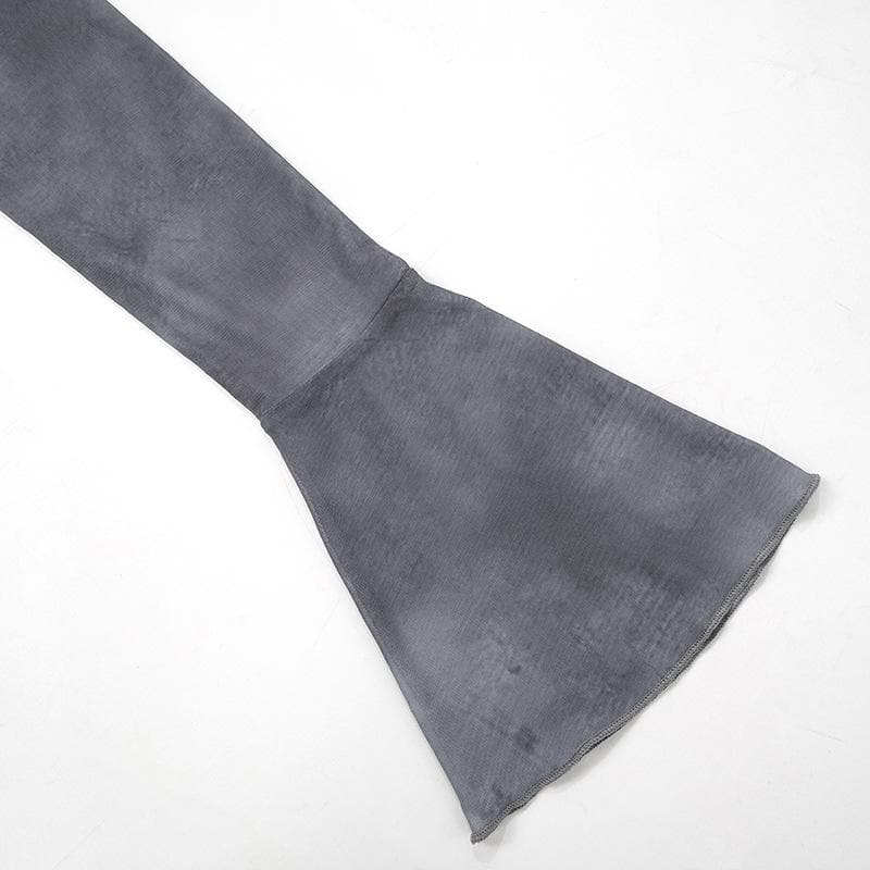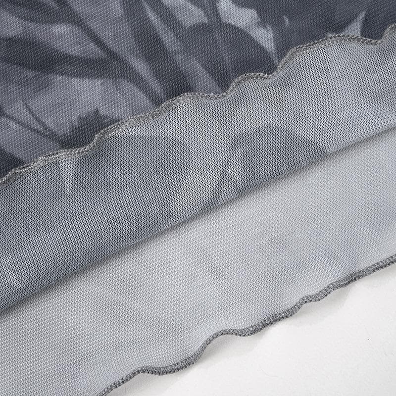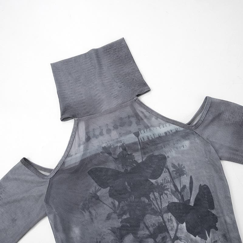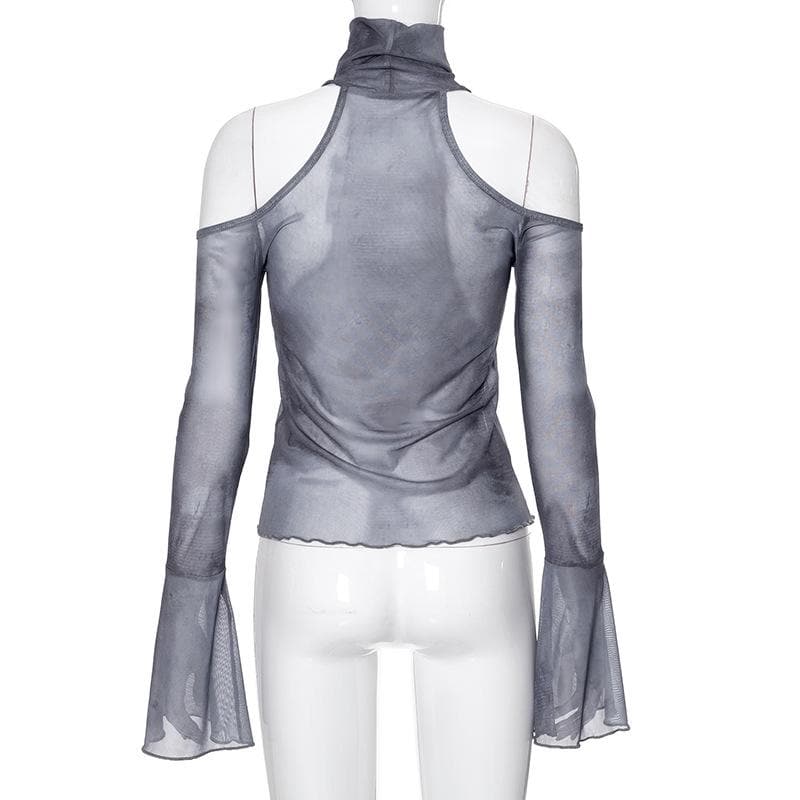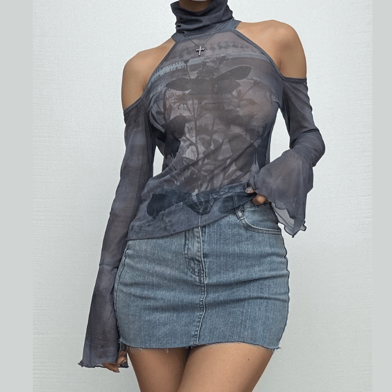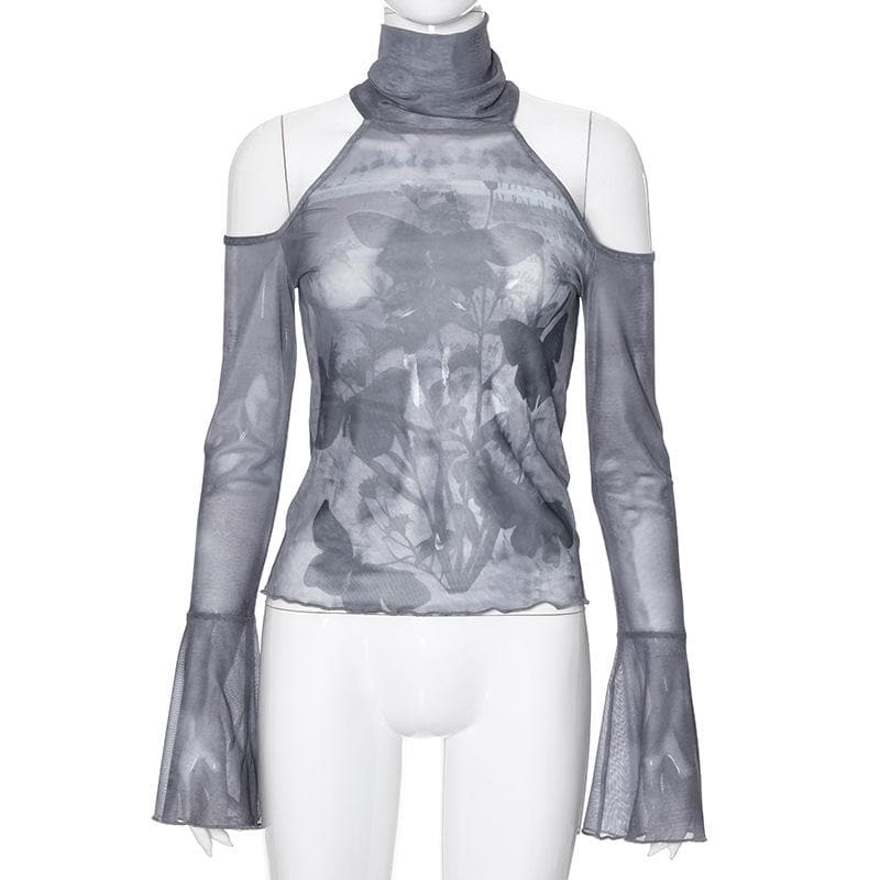 Long flared sleeve high neck sheer mesh print off shoulder top
