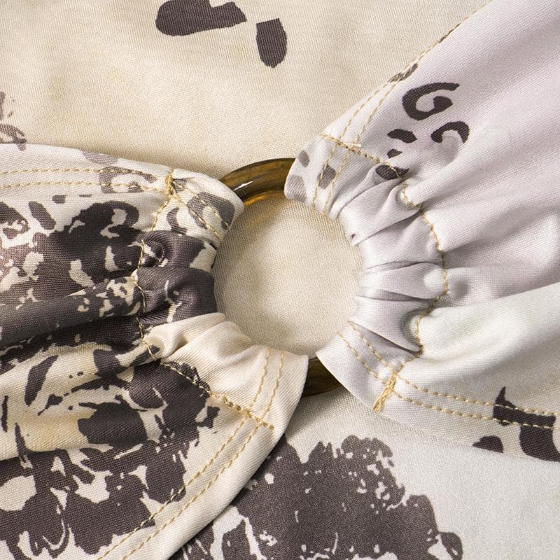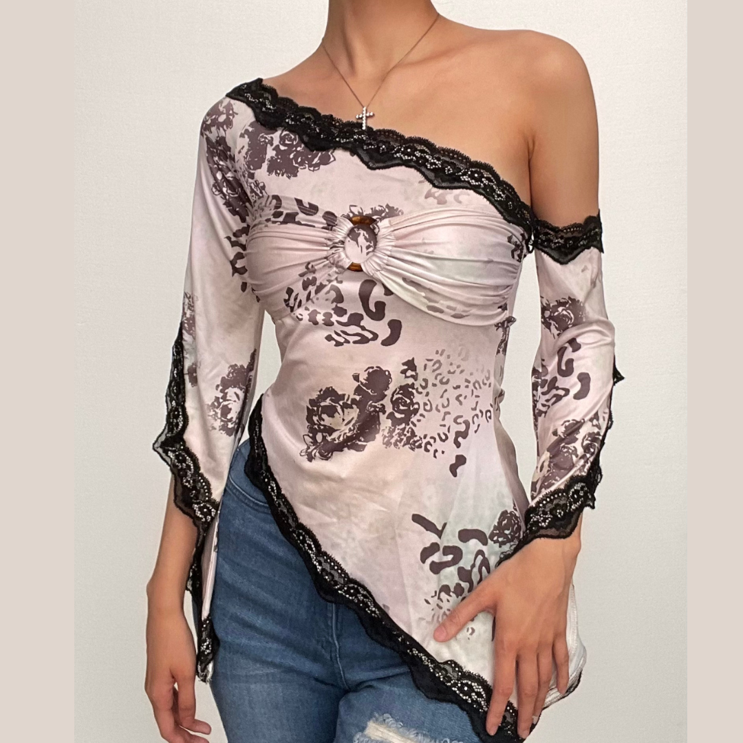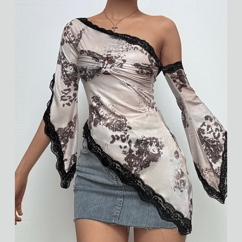 Long flared sleeve lace hem off shoulder o ring ruched print irregular top