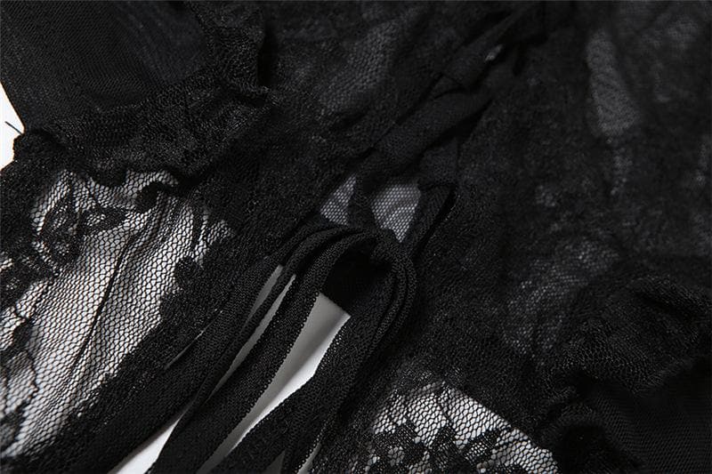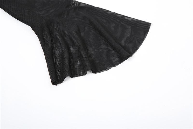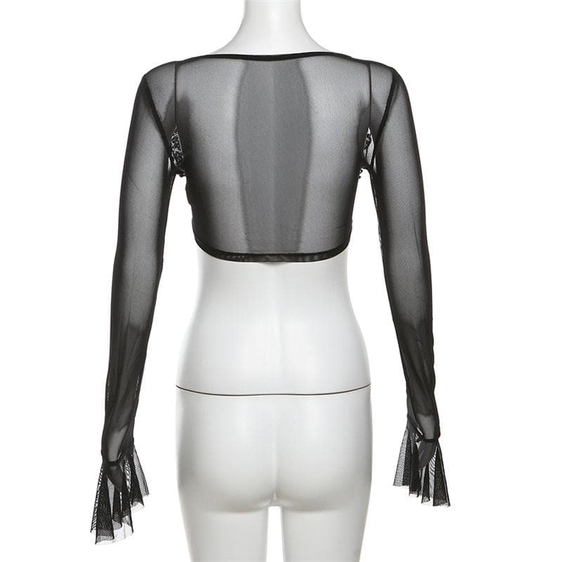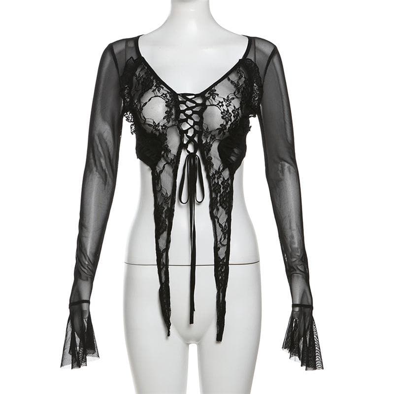 Long flared sleeve mesh see through lace up crop top