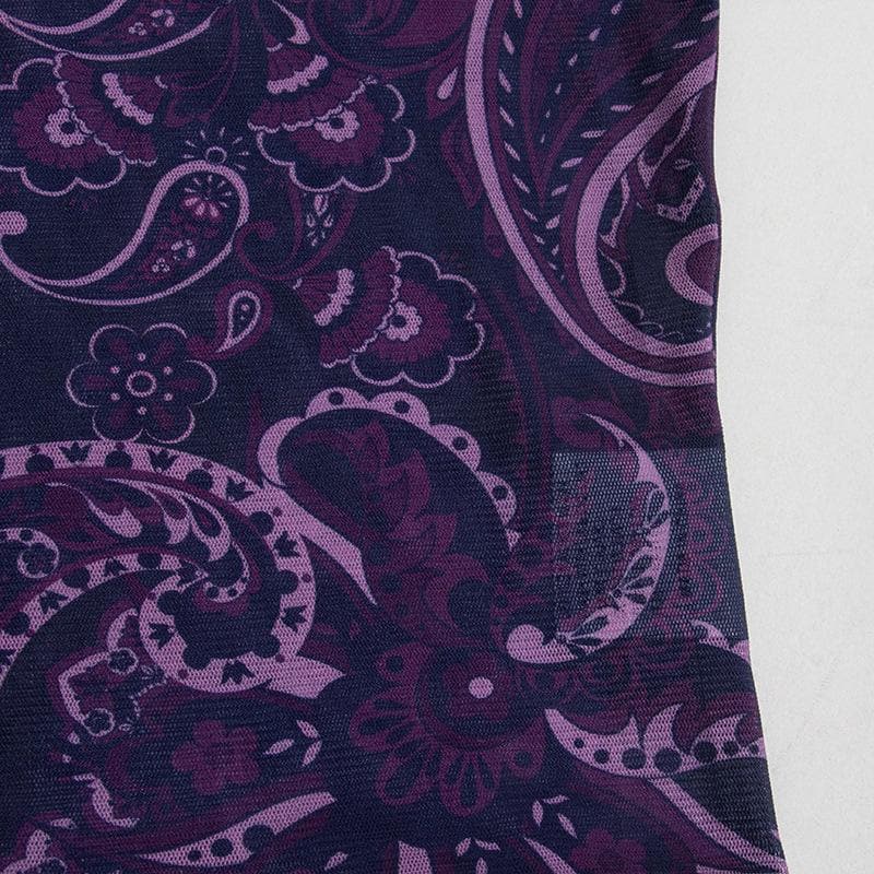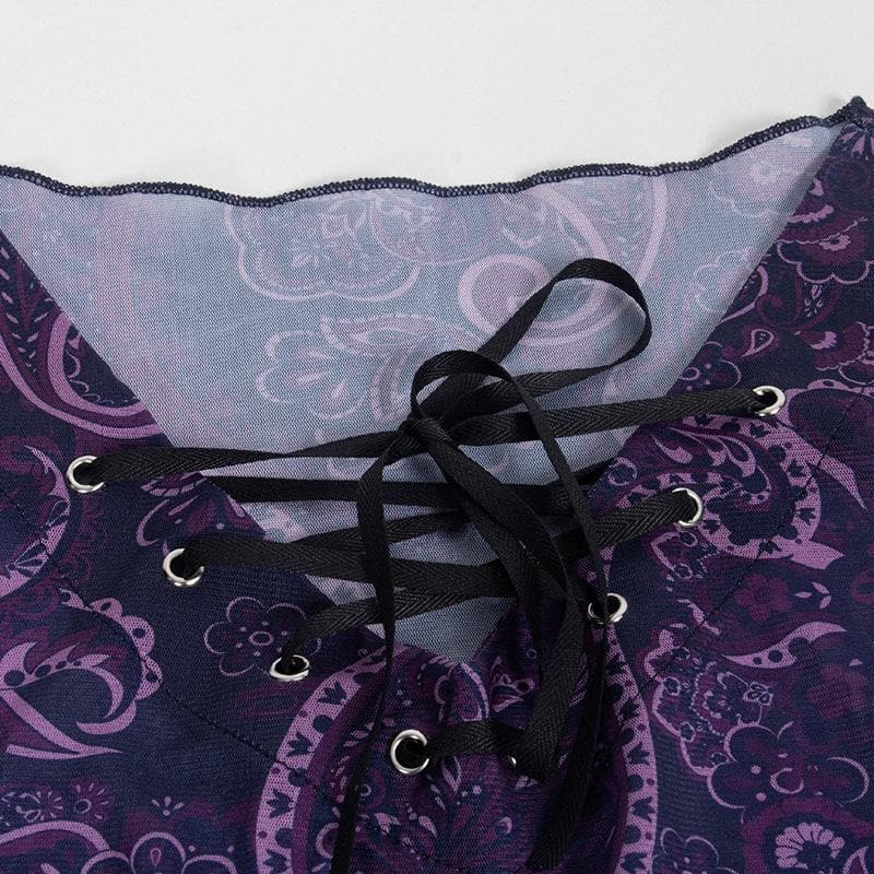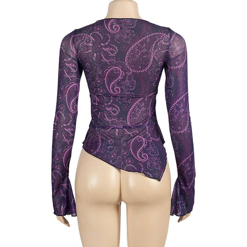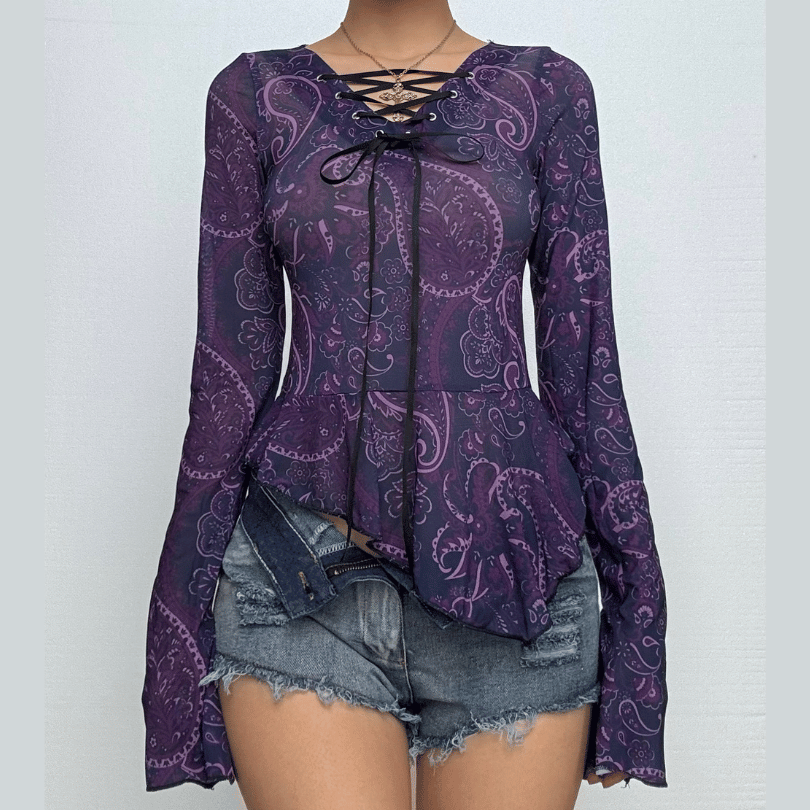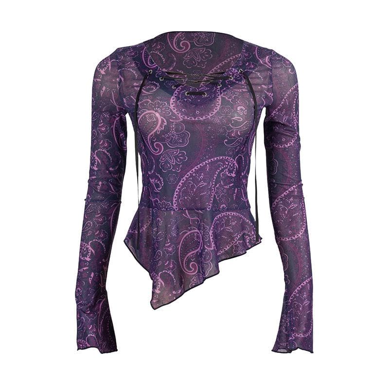 Long flared sleeve print lace up irregular sheer mesh ruffle top