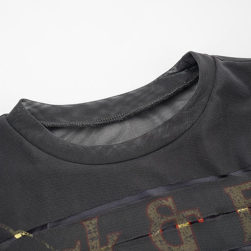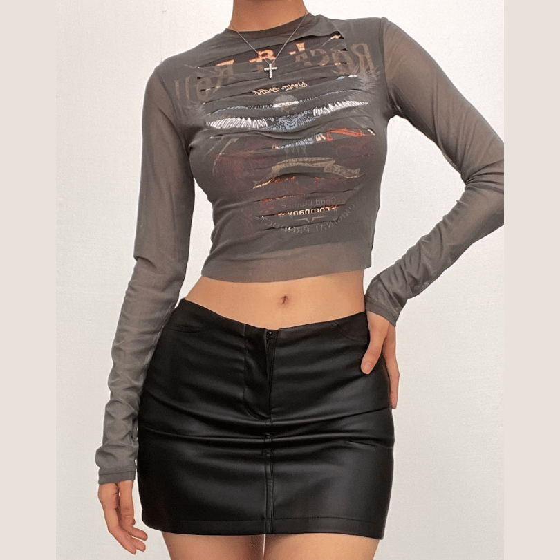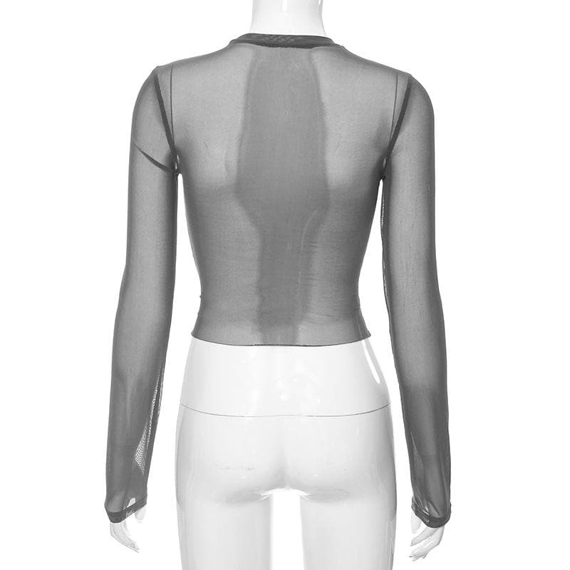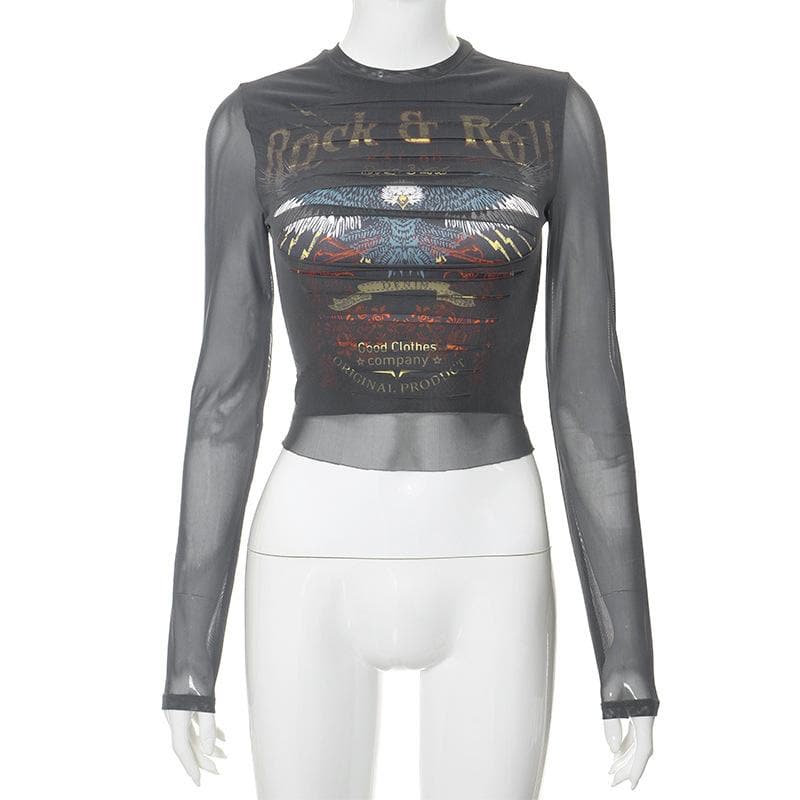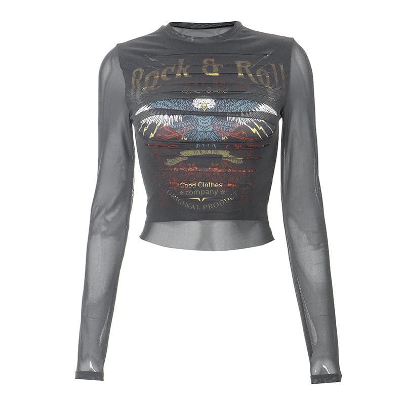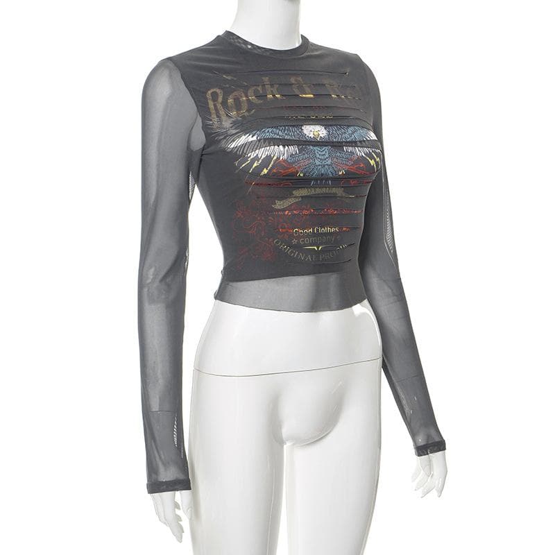 Long sleeve crewneck eagle print mesh top