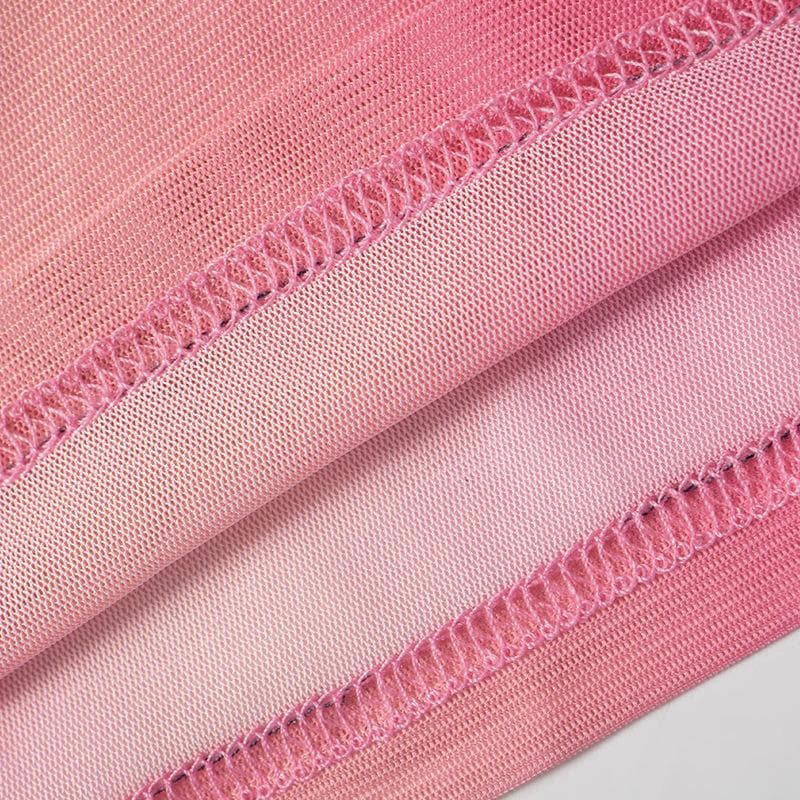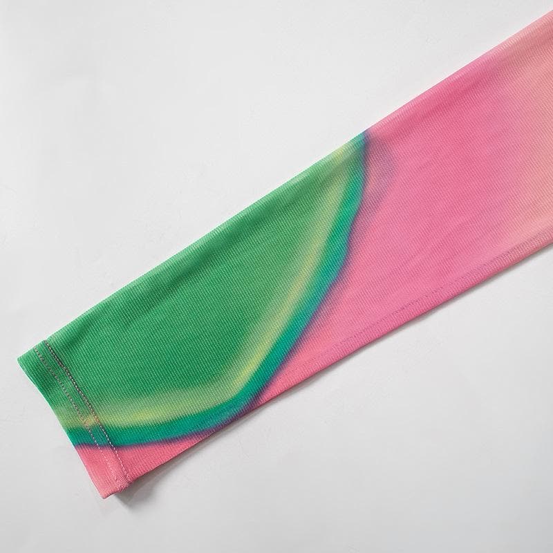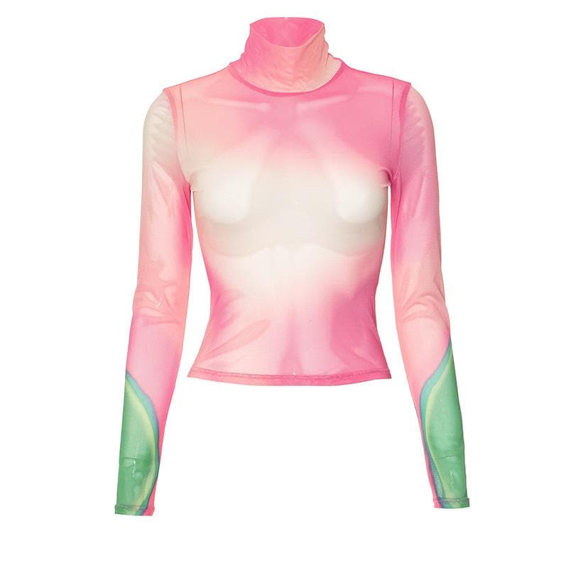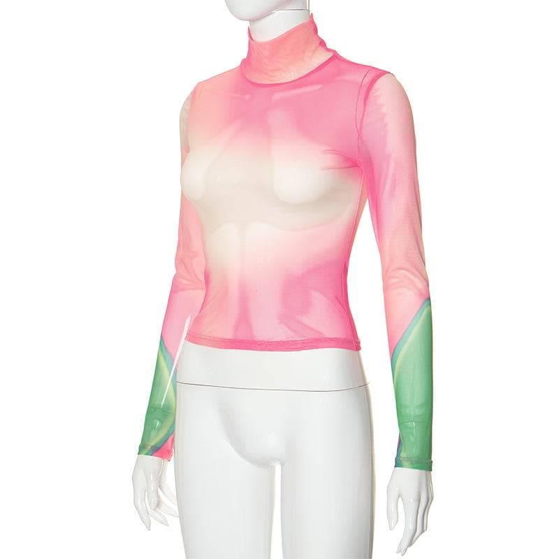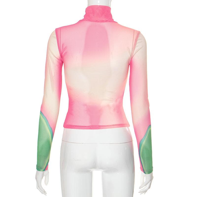 Long sleeve high neck print sheer mesh contrast top